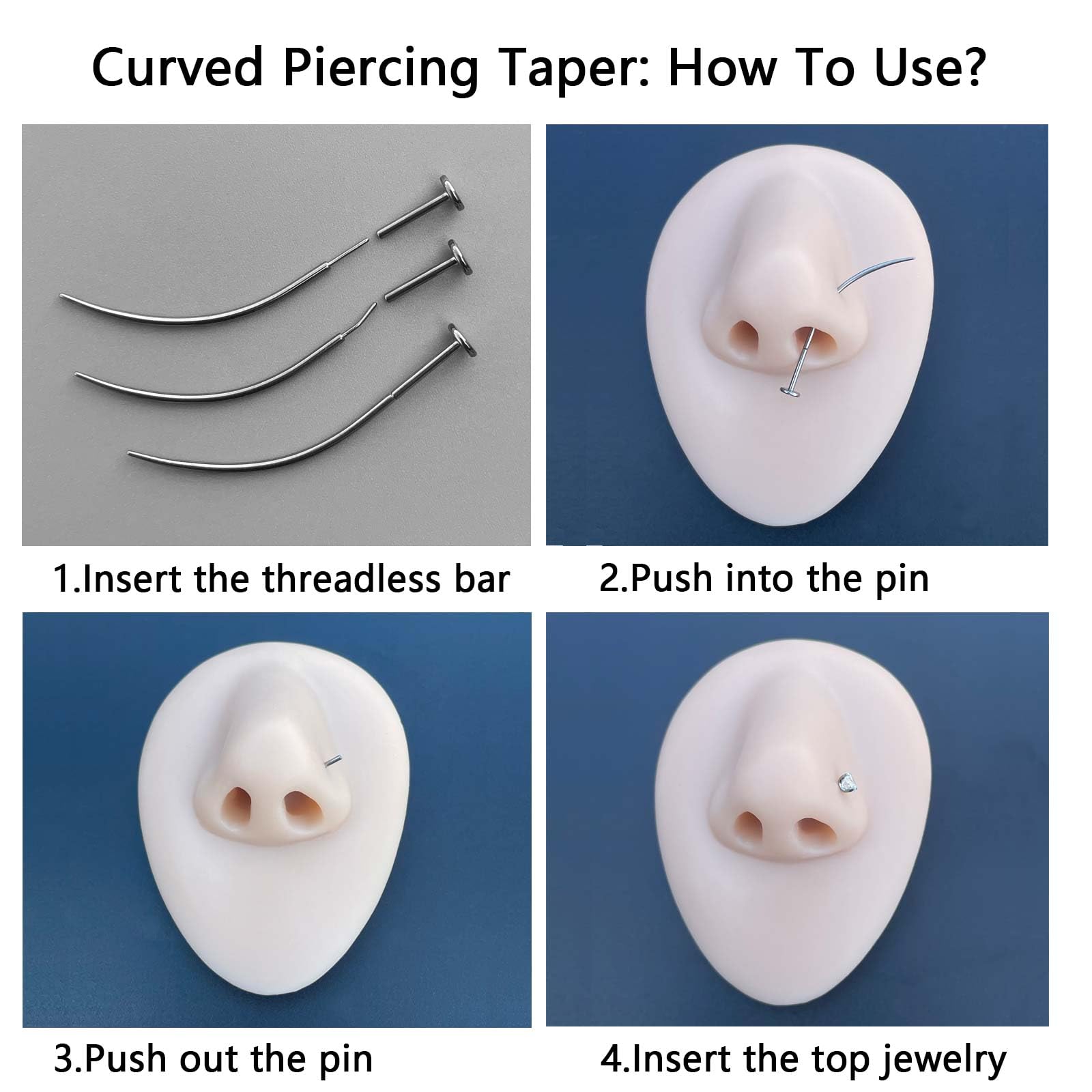 【TIPS】①,This insertion pin taper ONLY for THREADLESS piercing jewelry ②,Please bend the thin needle on the tool, then push it into the threadless stud, otherwise, it cannot be hold tightly!③,Can be autoclaved or alcohol and reused