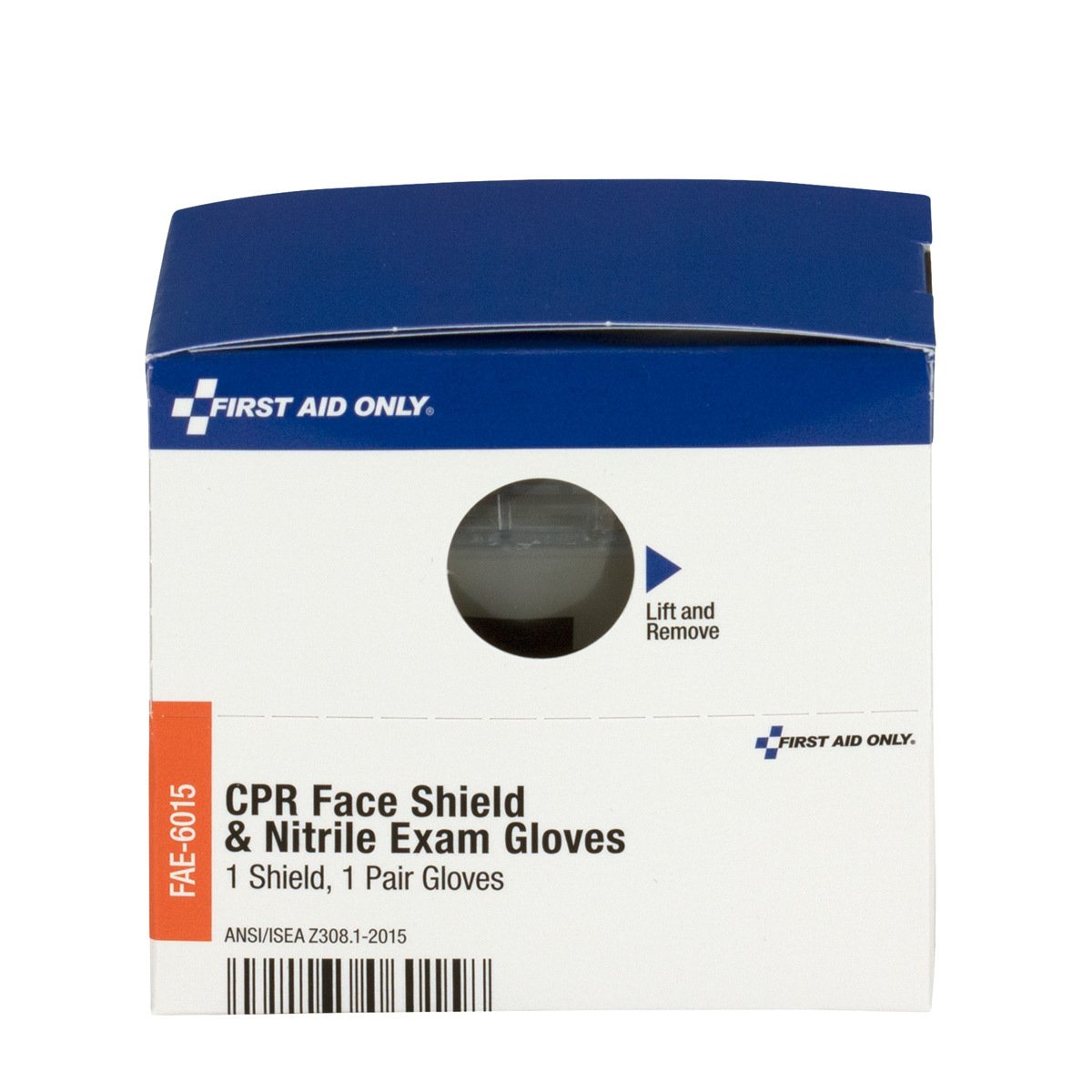 The SmartCompliance refill system for reordering and restocking your First Aid cabinet revolutionizes replenishment. It is quick, easy, and cost effective. As supplies are used, SmartTab ezRefill reminder tabs notify you when it is time to reorder supplies and puts the reorder information at your fingertips. The SmartCompliance Insert Maps also allow you to customize your cabinet to meet your specific first aid needs. SmartCompliance Refill with 1 CPR Face Shield and 1 pair of Nitrile Gloves per box. The CPR shield includes elastic ear bands to hold it in place and a one-way valve to prevent mouth to mouth contact. Large latex-free gloves protect against exposure to bodily fluids. The refill is used in First Aid Only SmartCompliance cabinets: 90608, 90580, 746000, 746004, 1000-FAE-0103 and 1001-FAE-0103.