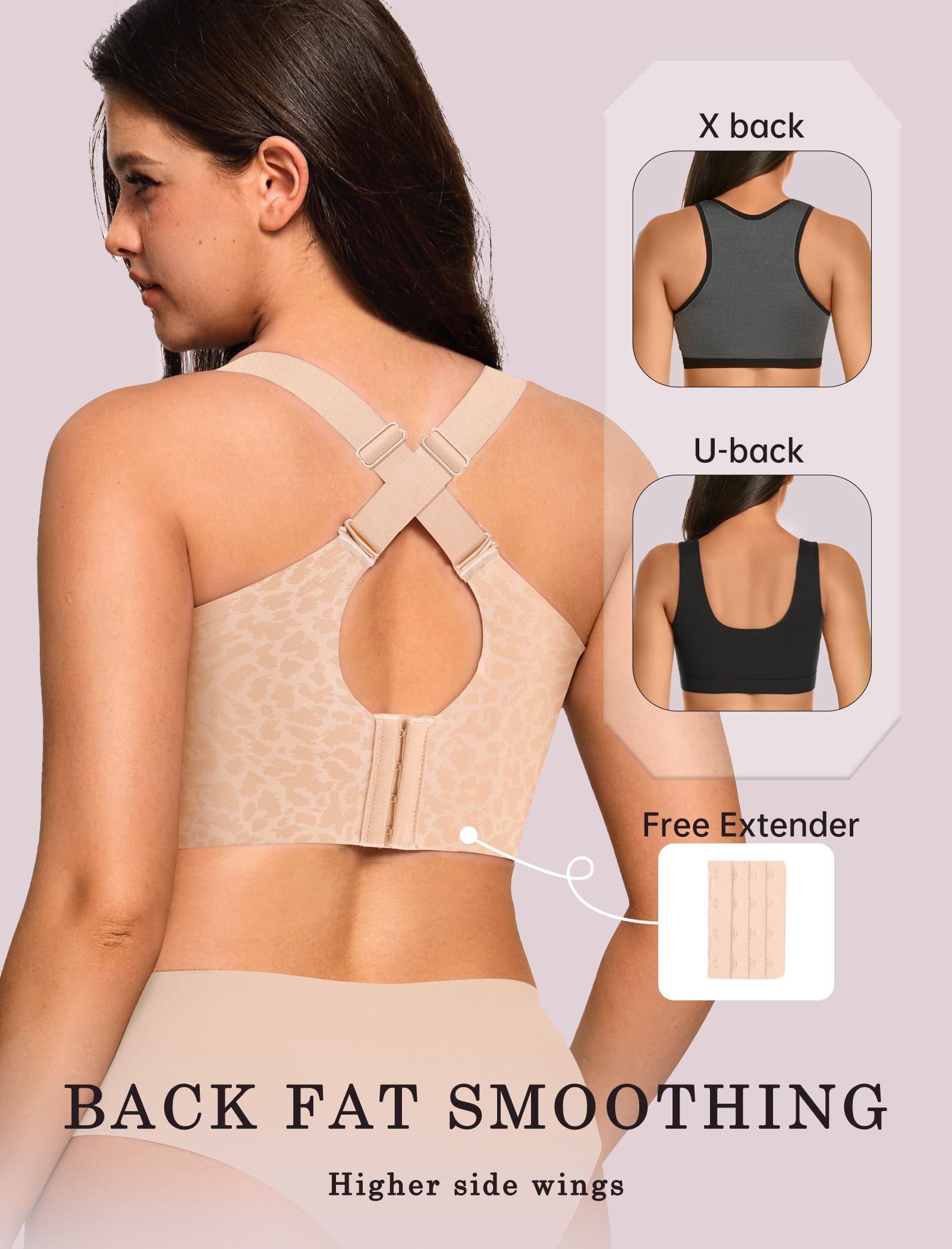 Widen Adjustable Straps - The bras reduce pressure on the shoulders, especially suitable for large chest. The wide shoulder straps prevent slipping or shifting, keeping the bra in place. Durable Straps offers all-day support and comfort. With special versatile strap design, you can easily switch between two stylish looks: sexy crisscross (X-back) or sleek U-back—no need for multiple bras!