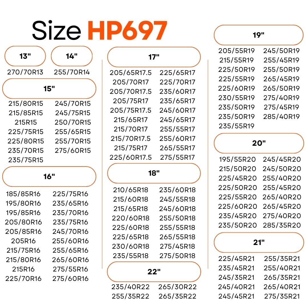 Compatible with: 245 / 45 R 20, 245 / 45 R 21, 245 / 50 R 20, 245 / 55 R 18, 245 / 60 R 18, 245 / 65 R 17, 245 / 70 R 16, 245 / 75 R 15, 255 / 40 R 21, 255 / 45 R 20, 255 / 50 R 19, 255 / 55 R 18, 255 / 60 R 17, 255 / 65 R 16, 255 / 70 R 15, 265 / 30 R 22, 265 / 35 R 21, 265 / 35 R 22, 265 / 40 R 21, 265 / 45 R 20, 265 / 50 R 19, 265 / 55 R 17, 265 / 55 R 18, 275 / 40 R 20, 275 / 45 R 19