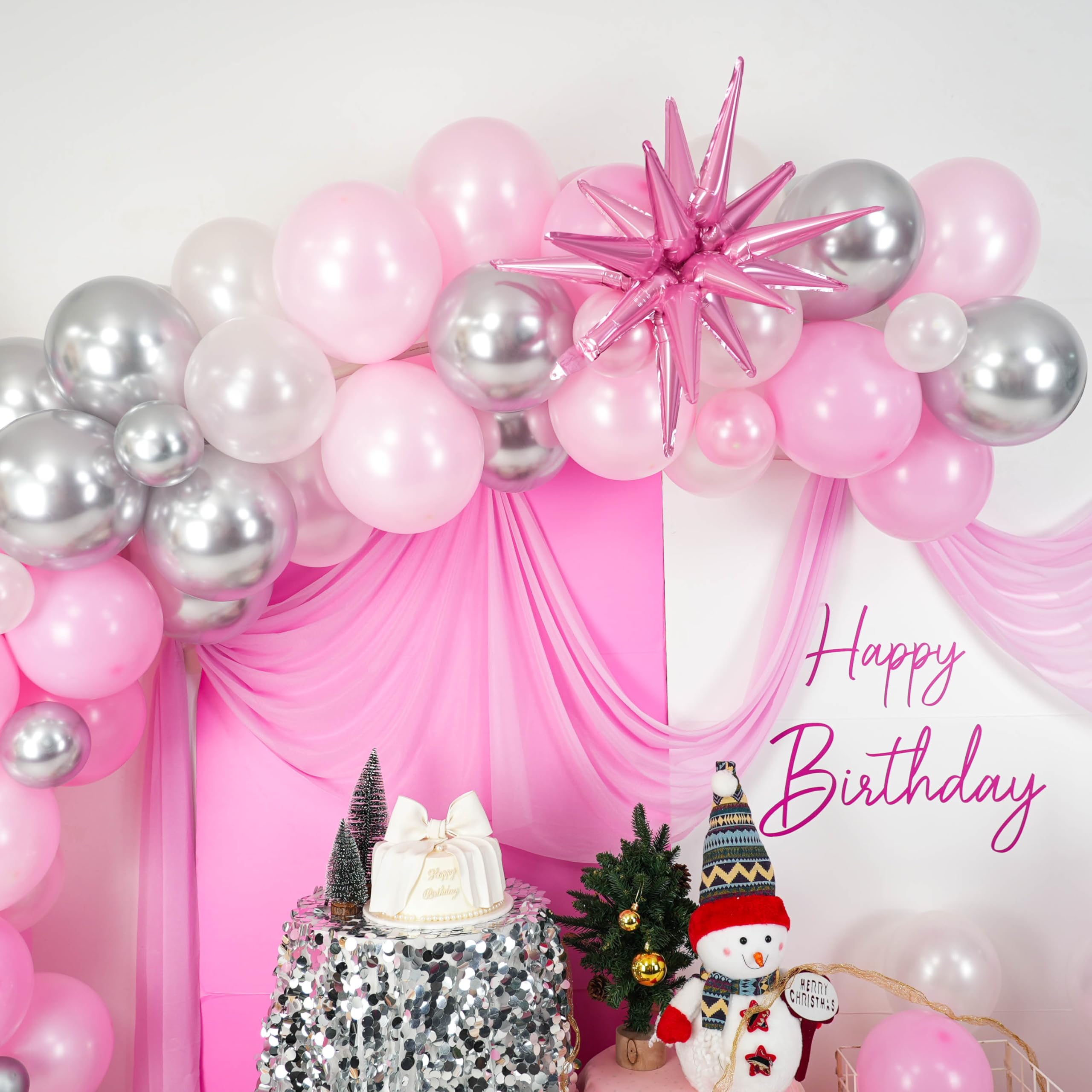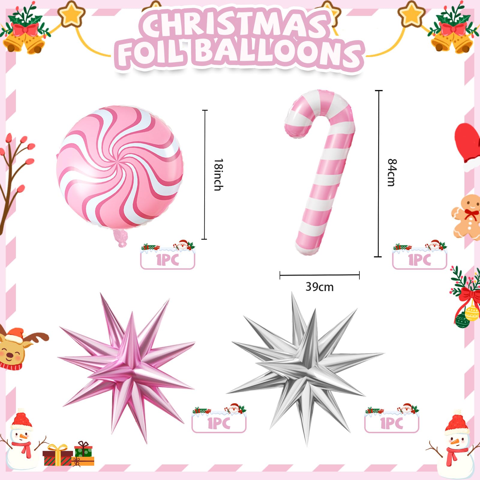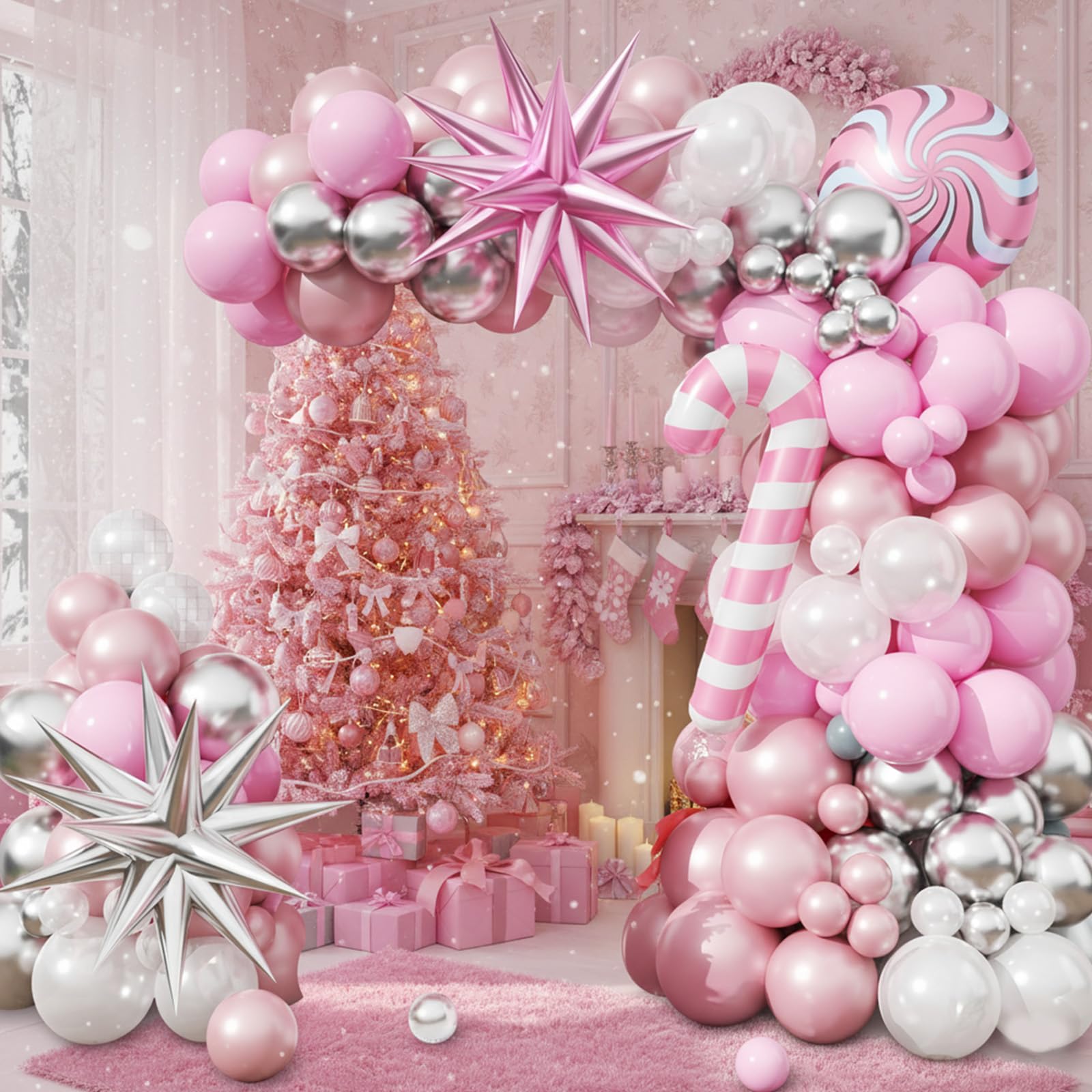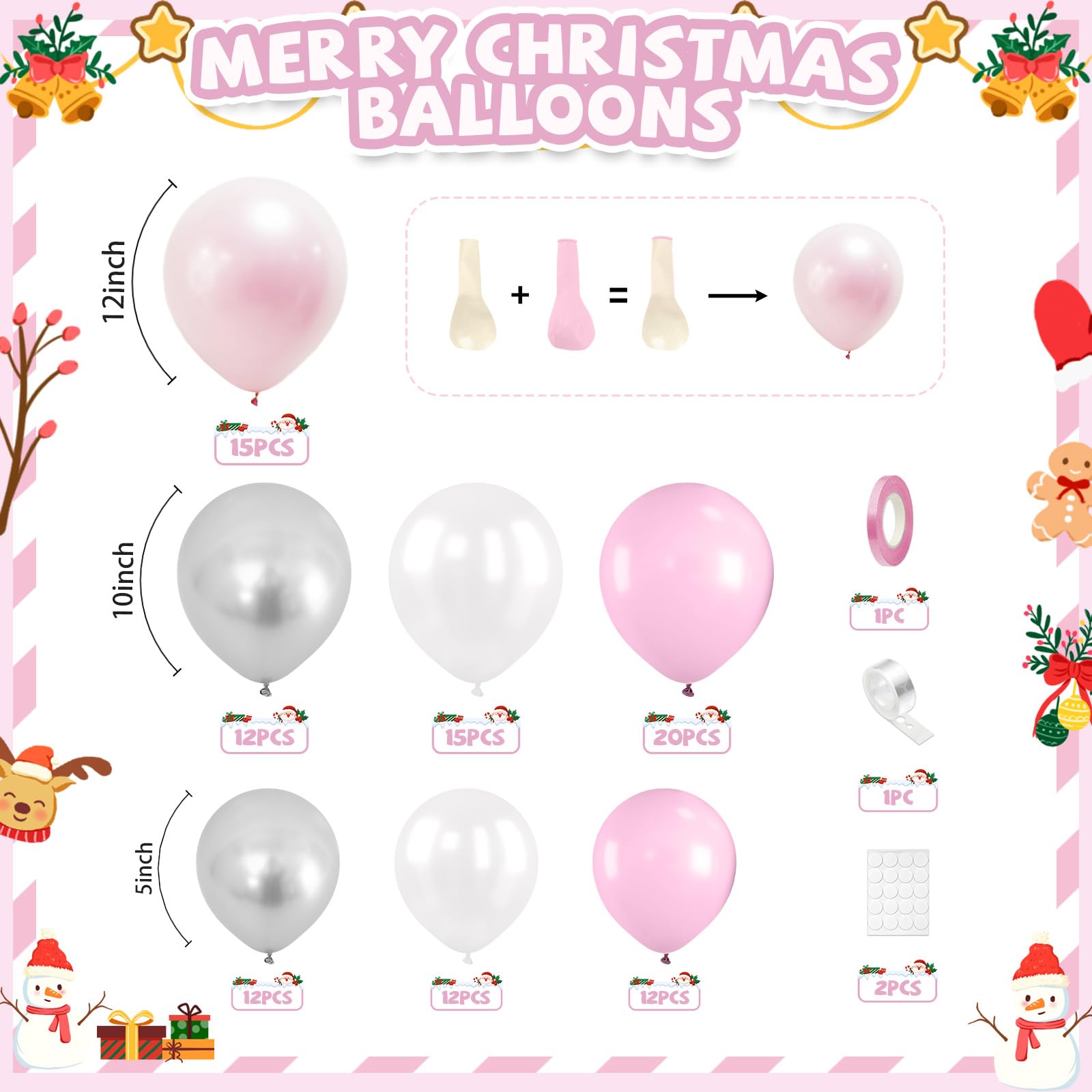Package Contents: This pink Christmas balloon arch kit includes 15PCS pink double stuffed balloons ( light pink and pearl white), 47pcs 10-inch and 36pcs 5-inch balloons ( metallic silver, pearl white, macaron pink), 2pcs star foil balloons ( pink, silver), 1pc candy cane foil balloon, 1pc pink windmill foil balloon, 1 x pink ribbons, 2 x dispensing dots, and 1 x 5m balloon chain.