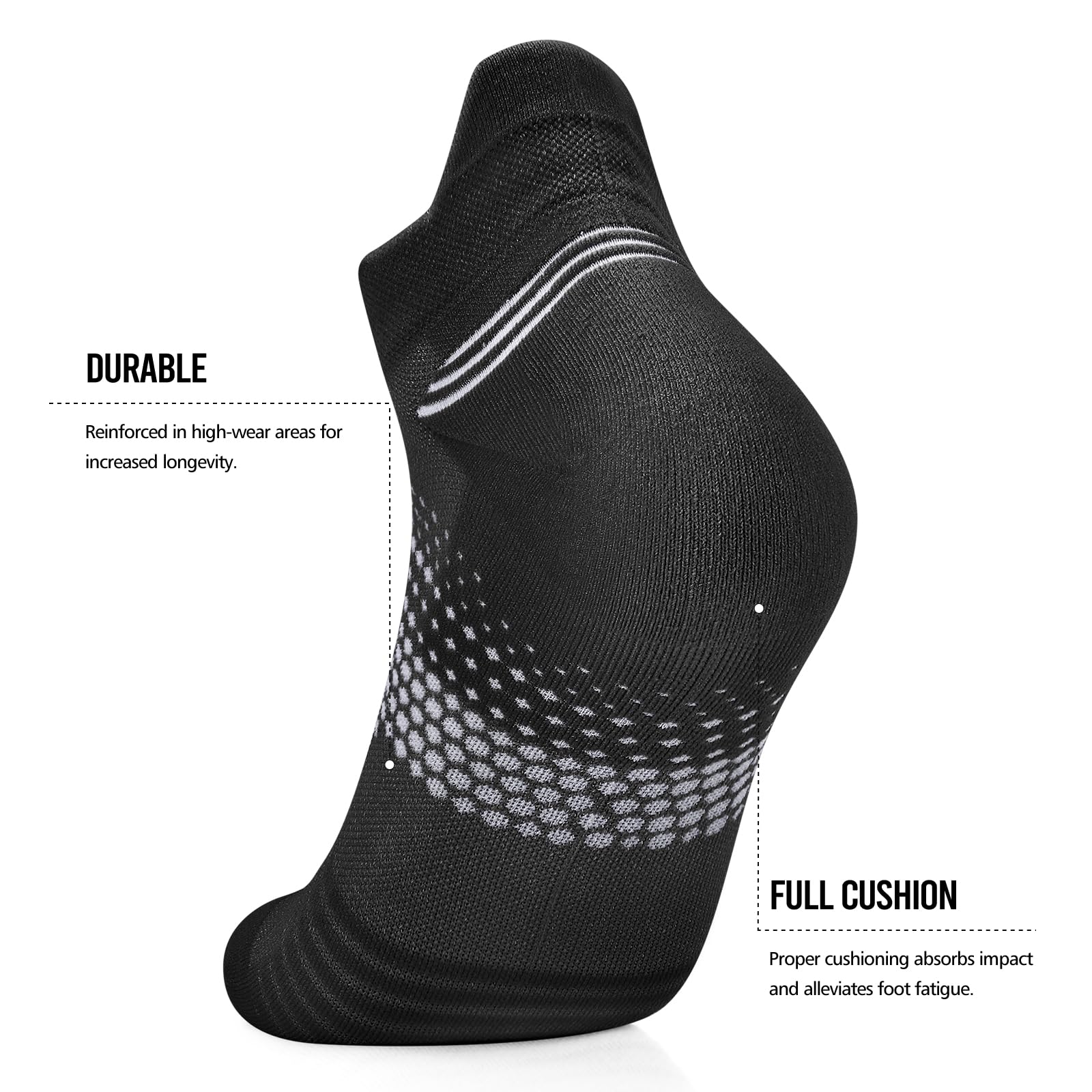 [CUSHION SOLE and ANTI-BLISTER]: Womens running socks with great soft cushion at the bottom, heel and toe areas to absorb shock and relieve foot pain. The Y-stitched heel pocket and elasticated band prevents socks from slipping and blisters from forming