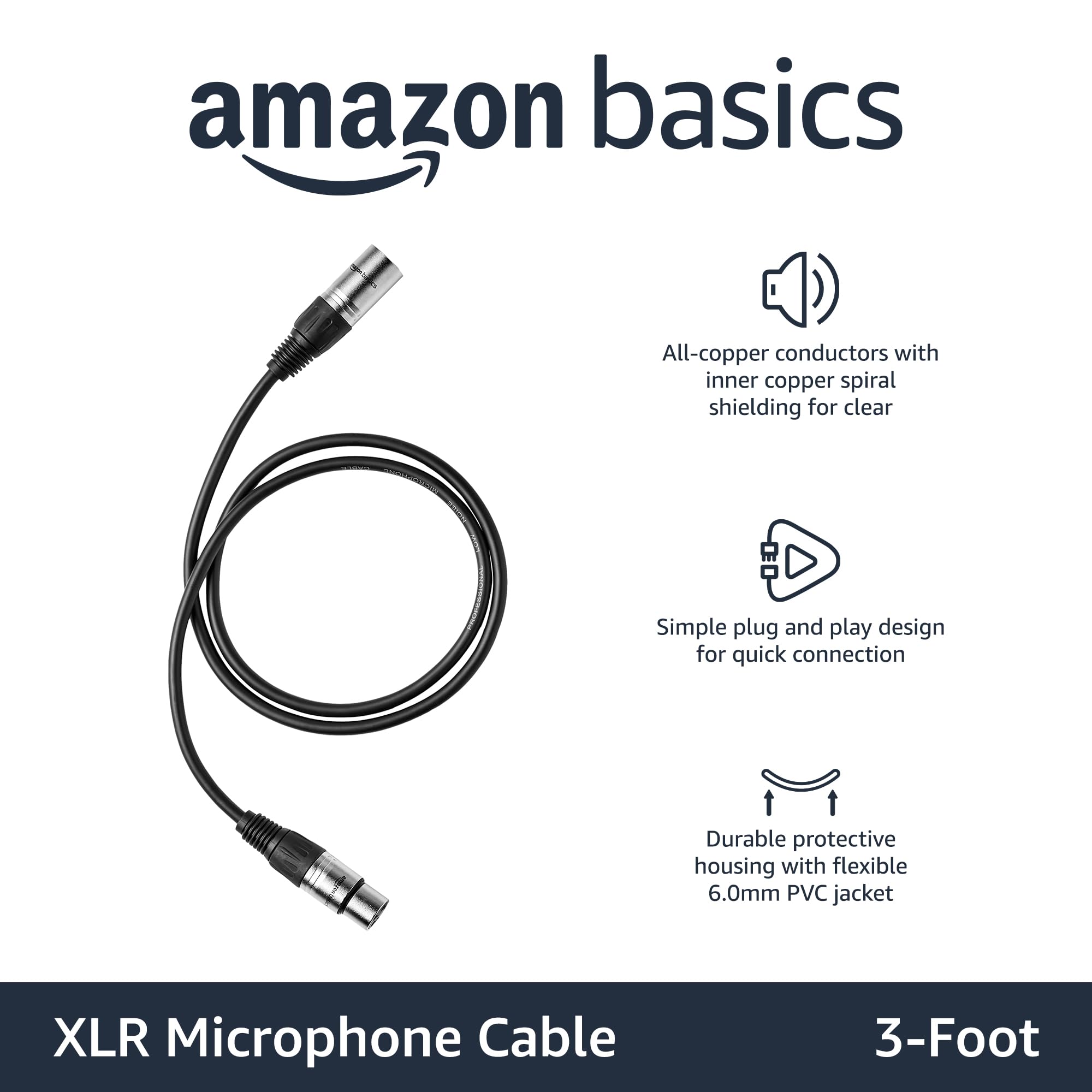 Product Description Amazon Basics Standard XLR Male to Female Balanced Microphone Cable, Durable & Flexible, Noise-Cancelling - 3 Feet, 2-Pack, Black From the Manufacturer Amazon Basics
