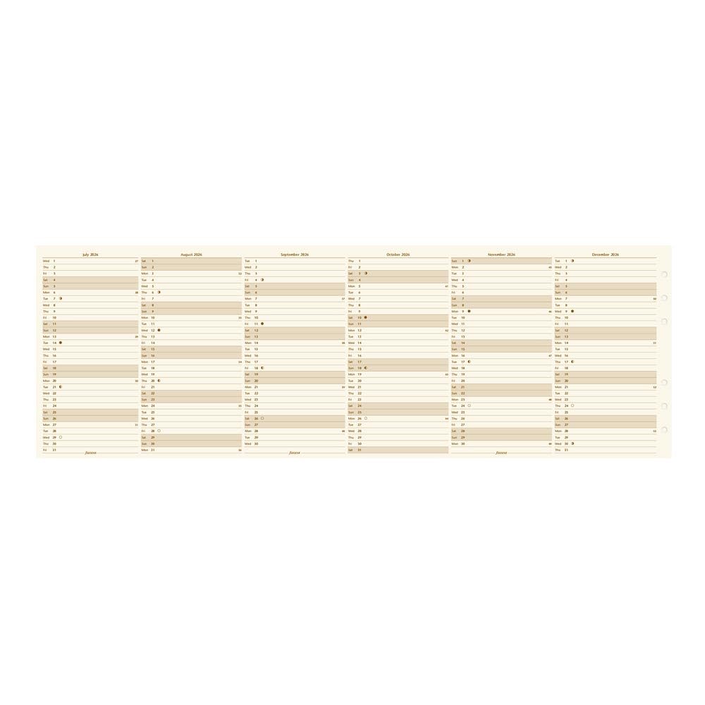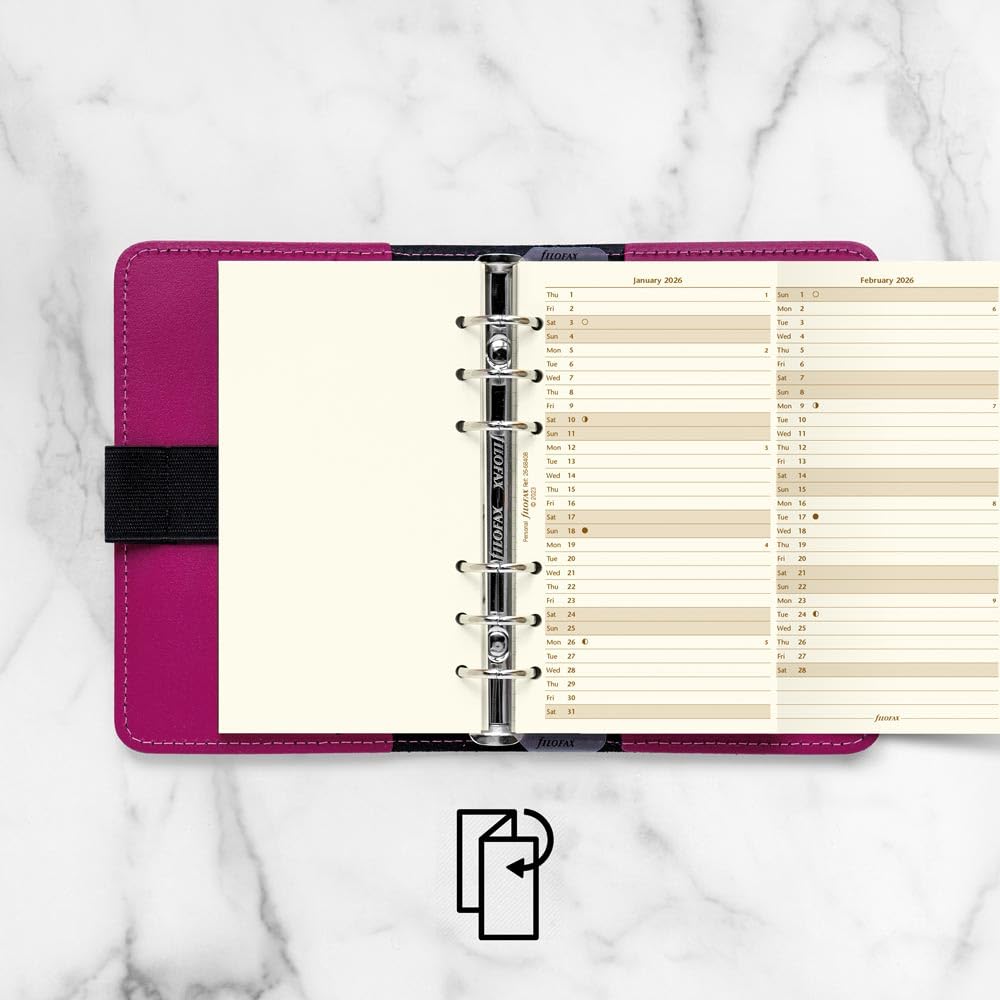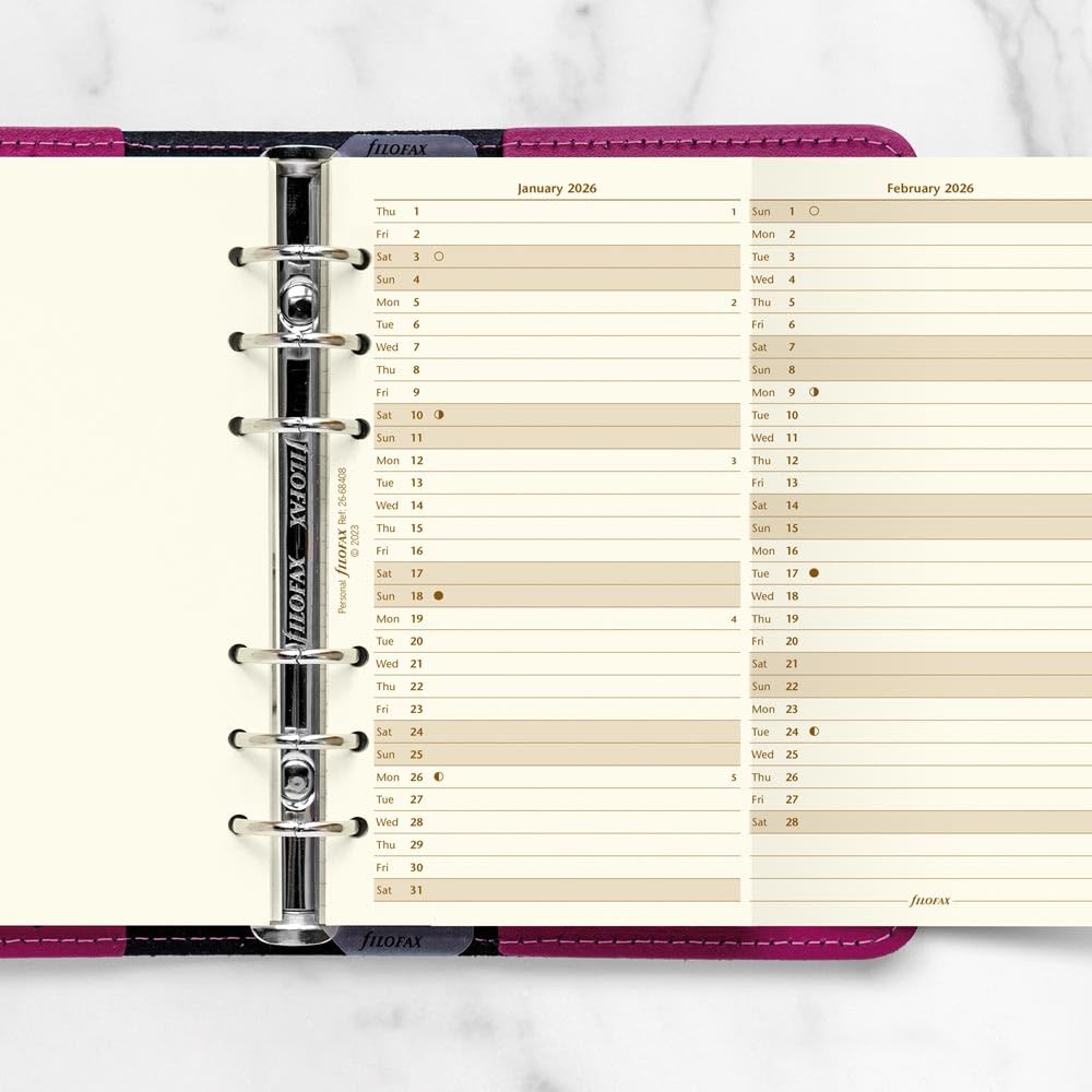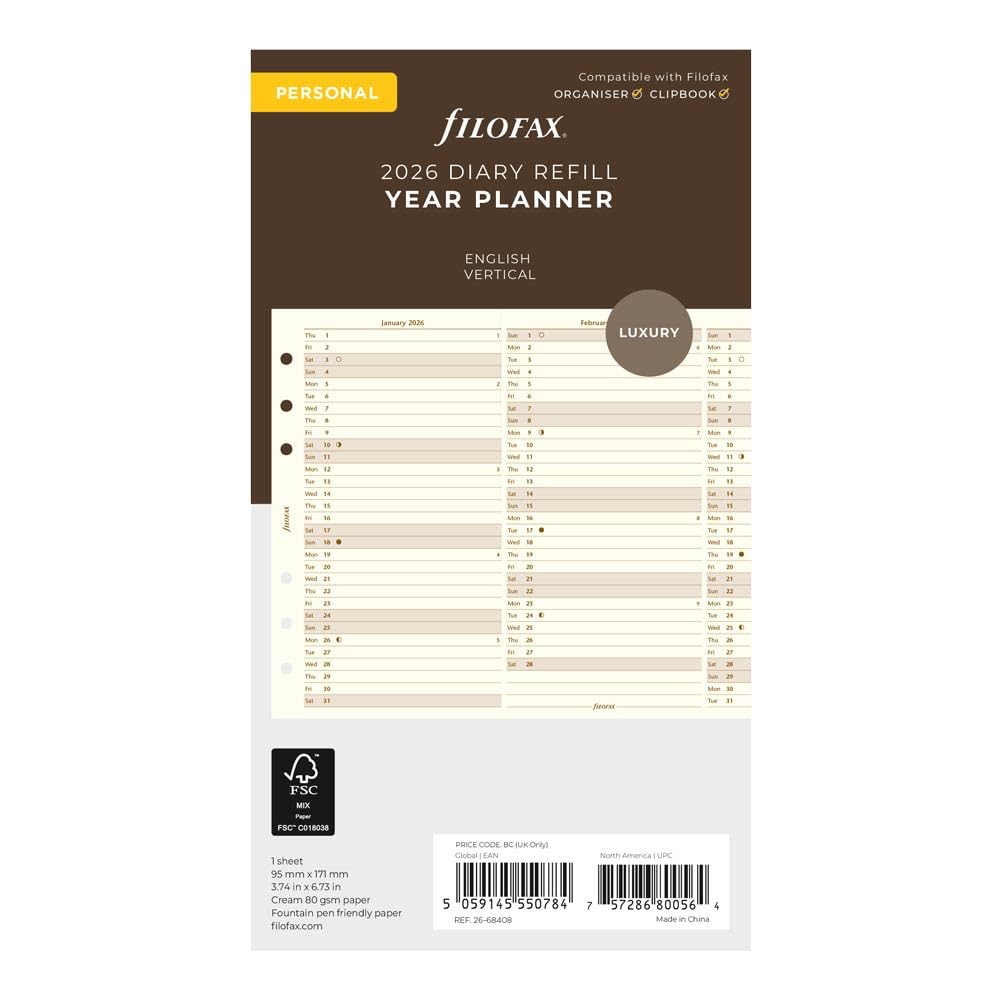 FEATURES | Filofax Yearly Vertical planner refill, January to December, 2026. Saturday and Sunday are shaded. Leaflet folds neatly to fit back into Filofax. Luxury cotton cream paper. Vertical layout. Calendar Diary Dated refill for planners, organizers, agendas and diaries.