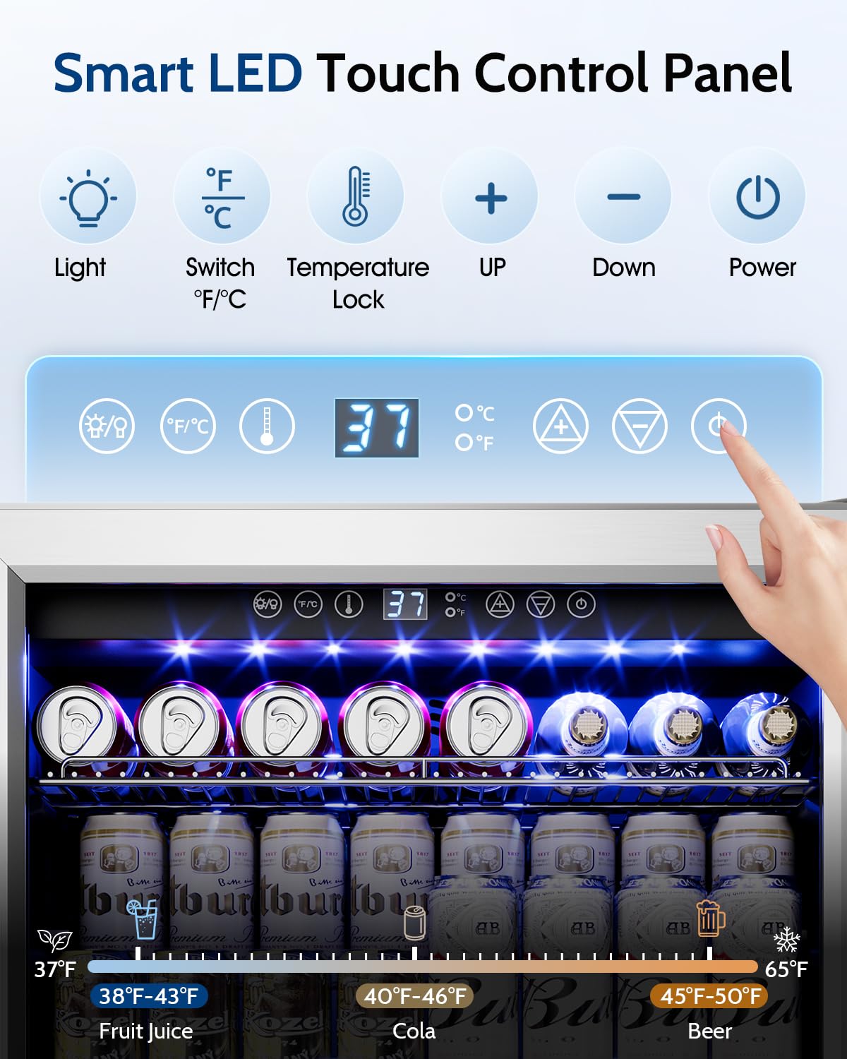 Smart Touch Panel & LED Display: The undercounter beer fridge features a digital smart control panel, allowing for simple, one-touch operation, including temperature adjustment and mode switching. Built-in soft LED lighting clearly displays beverages day or night. A safety lock at the bottom of the refrigerator prevents unauthorized opening.