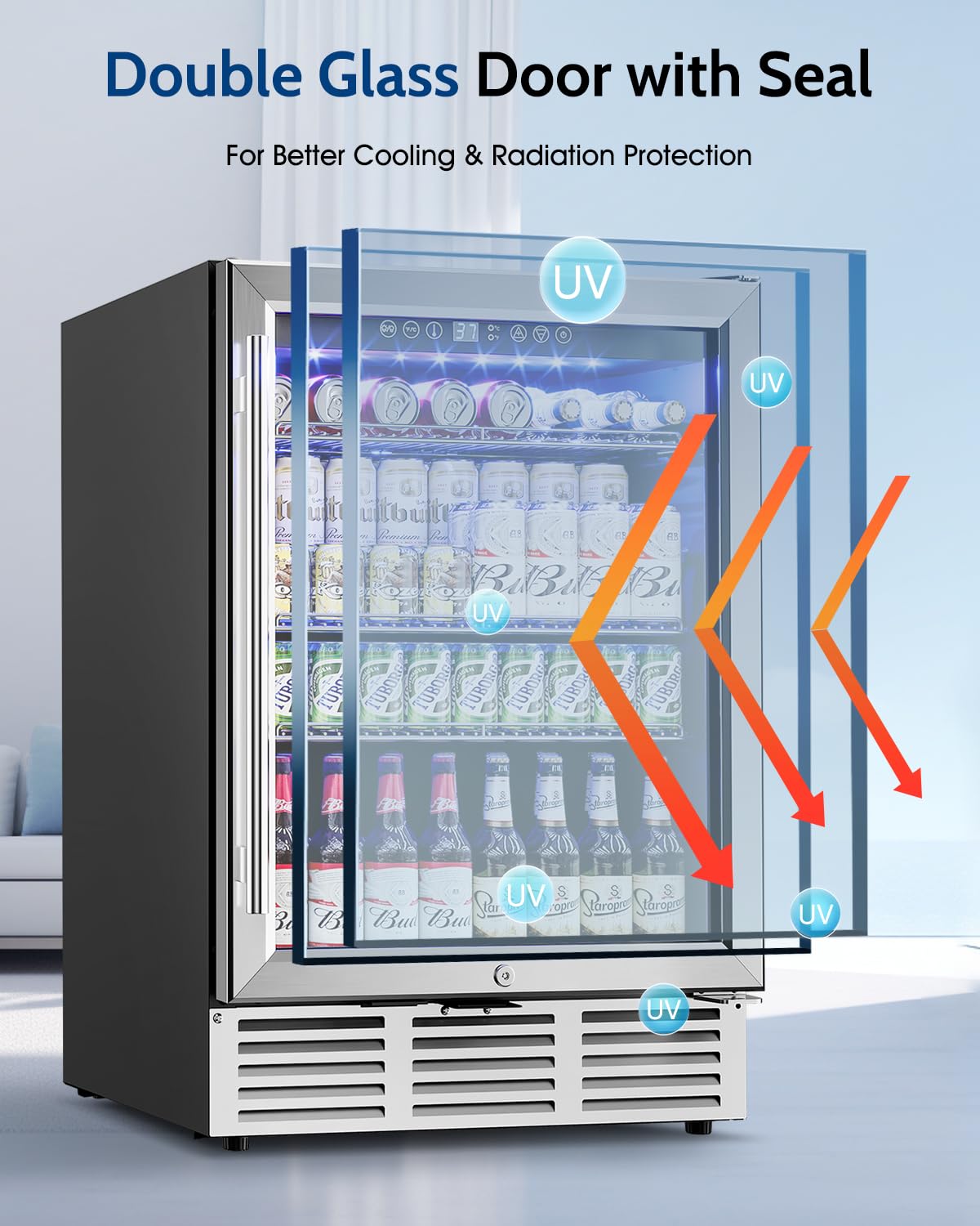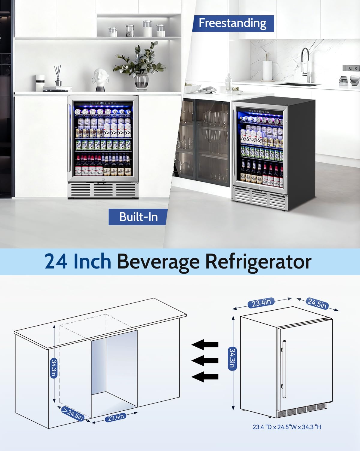 Quiet & Energy-Efficient: The advanced compressor makes the drink refrigerator under counter quiet and energy-efficient, operating at about 40dB and and low power consumption (0.84 kWh/day), ensuring beverage fridge 24 inch wide won't disrupt conversation, work, or rest. Whether in your bedroom, office, or entertainment area, you can enjoy a cool drink in peace.