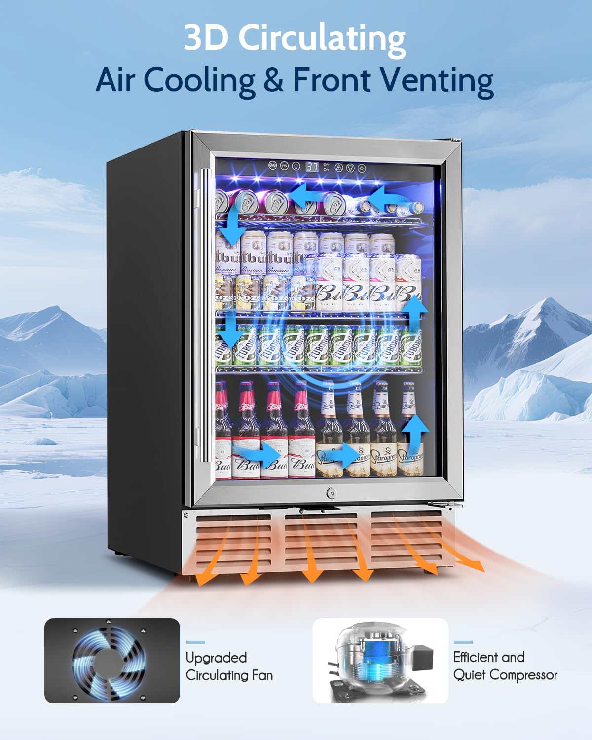 Efficient & Even Cooling: Feelfunn's 24 inch beverage cooler features a high-performance compressor and advanced air circulation system for fast and even cooling. Bar fridge's adjustable temperature range of 37-65°F keeps drinks consistently cool. Its front vent allows for both undercounter and freestanding use.