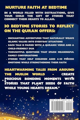 What If Your Child Could Fall Asleep Loving Allah, Not Just Knowing About Him? You're not alone in this quiet fear: "Will my child choose Islam when they grow up?" Between screens and secular influences, making Islam part of daily life feels impossible. 30 Bedtime Stories to Reflect on the Quran changes that. For ages 5-11, these aren't lectures... they're interactive adventures your child will request nightly. In this collection of Islamic bedtime stories for kids, your child will: Ask for "one more Islamic bedtime story!" through engaging "Pause and Think" moments with Tasneem in Toronto, Djibril in Senegal, and Muslim children across 20+ countries and 5 continents Handle peer pressure confidently by remembering Hossam's kindness in Milan or Fatima's courage in Morocco Memorize beautiful du'as naturally (Arabic + English + transliteration) without pressure See themselves in diverse Muslim children facing real challenges What makes this Quran story book for kids different? Unlike generic Islamic story books for kids that lecture, these Quran bedtime stories for kids include authentic Quranic verses, interactive "Look Around" prompts, and "Tonight's Questions" for meaningful conversations. No Islamic scholarship required. You become their first source of faith. One peaceful night at a time. Perfect for Ramadan, Eid, or building Islamic identity daily. If you love kids Quran stories that engage hearts, you'll treasure this collection. Order your copy now and start building lifelong Islamic values tonight.