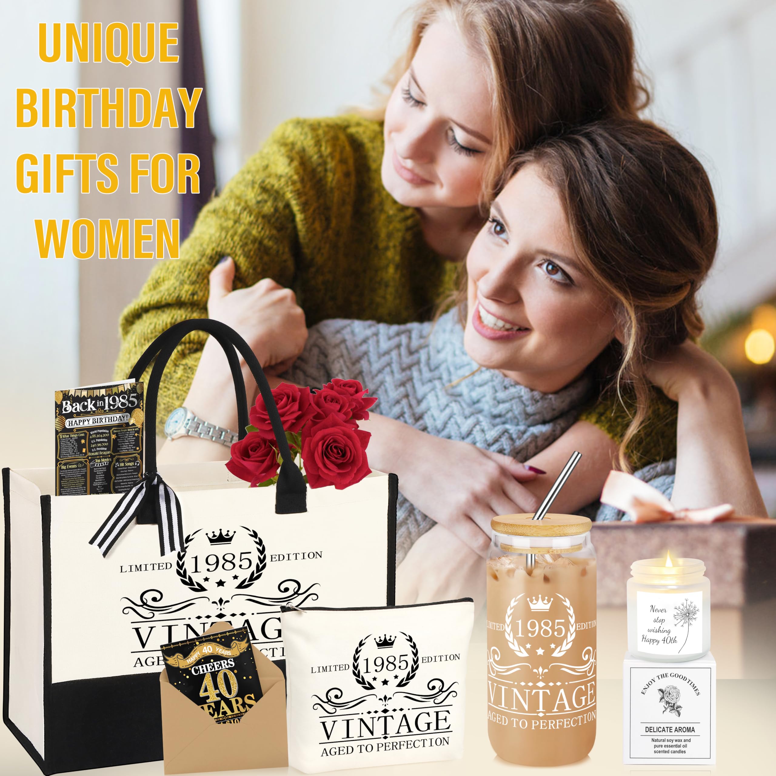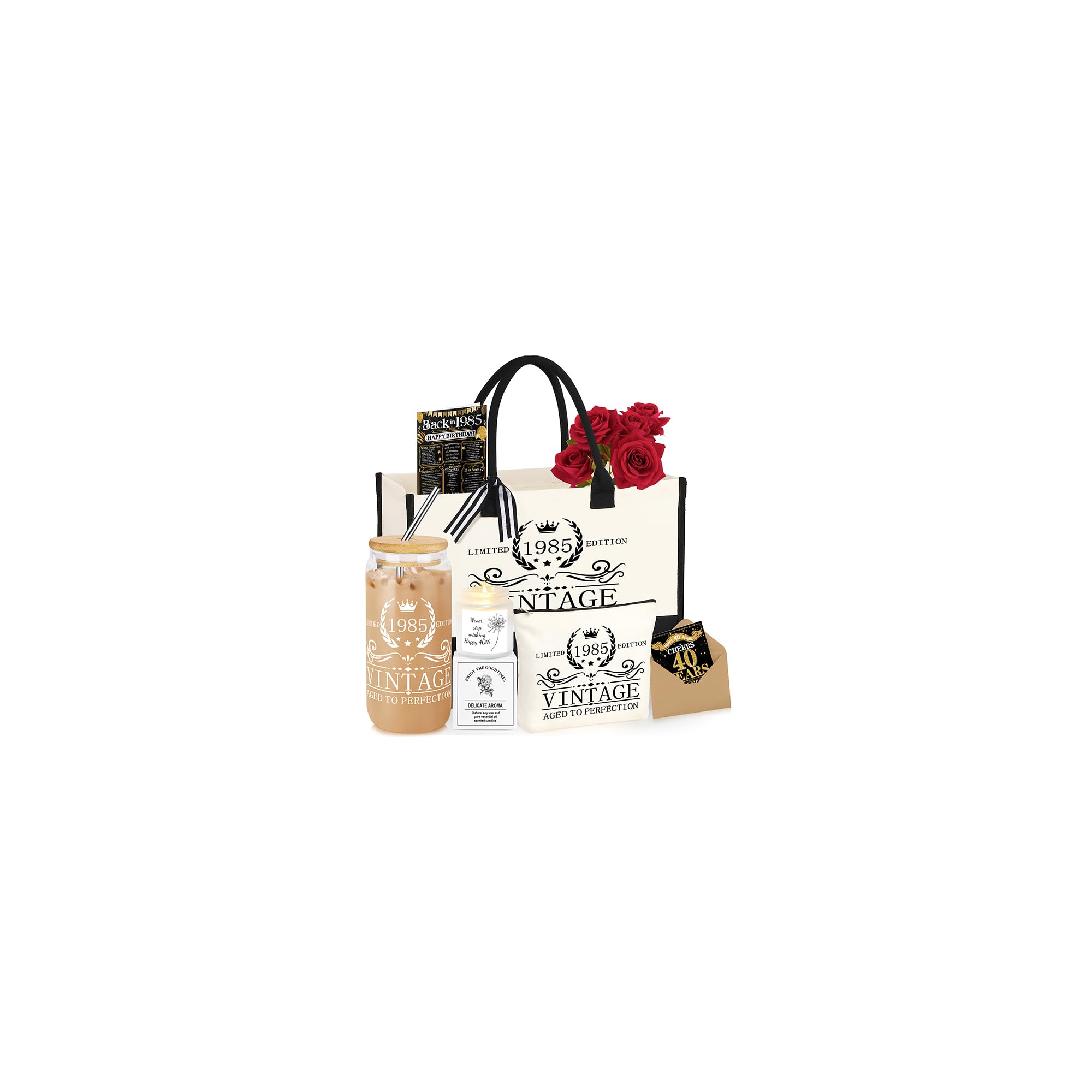 【40TH BIRTHDAY GIFTS FOR HER】: This set of 40th birthday gifts includes: 1 X 1985 tote bag, 1 X makeup bag,1 X 1985 can glass, 1X 1985 scented candle and 1 X 1985 poster. The unique canvas handbag set will be a cute gift for women's 40th birthday. The idea of a 40th birthday gift is the perfect choice to make her smile on their special day. 40th birthday gift, 40th anniversary commemorative gift, 40th wedding commemorative gift, 40th anniversary commemorative gift
