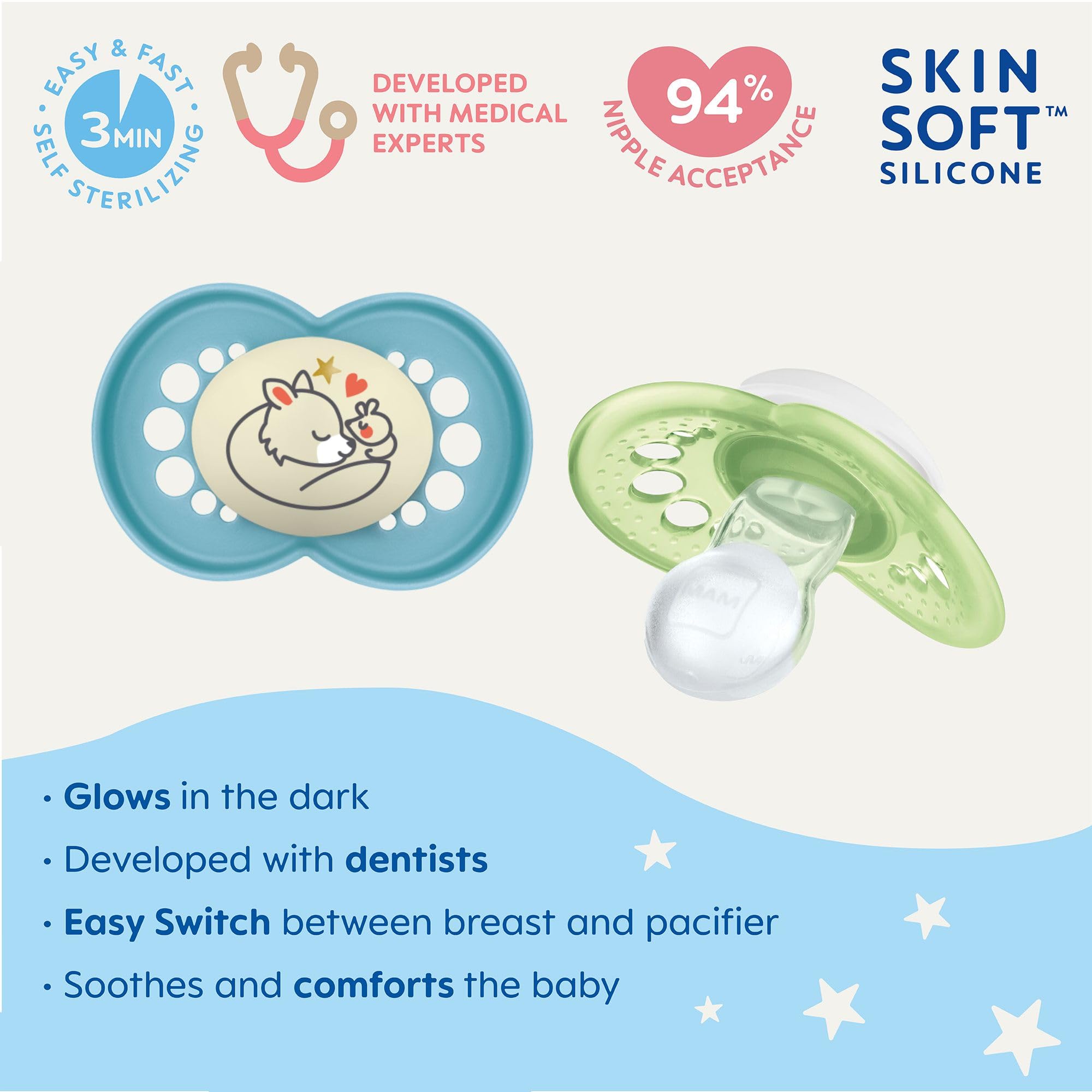 This pack includes two cute daytime silicone pacifiers and one that glows in the dark, making it easy for baby and parent to find in the dark. BPA/BPS-free MAM Day & Night Pacifiers were developed by leading pediatric dentists and developmental psychologists to provide maximum comfort and style for babies 6 months of age and older*. These pacifiers combine technological innovation and trendsetting design to help give babies a healthy start in life, such as our innovative nipple designed to promote healthy oral development so you can soothe your baby with confidence. Your baby will love latching onto the breastfeed pacifier nipple that, with the help of a built-in air channel, naturally flattens and extends when sucked, mimicking a human nipple during breastfeeding. As well, all MAM baby girl and boy pacifiers are orthodontic, featuring a symmetrical nipple that fits perfectly in baby’s mouth at any angle and life-like, SkinSoft textured silicone that feels just like mom. MAM nipples are easily accepted by babies of all ages, with 94% nipple acceptance among babies tested.** *Developed in conjunction with the International Children’s Medical Research Society. **Market research 2010-2020, tested with 1,572 babies