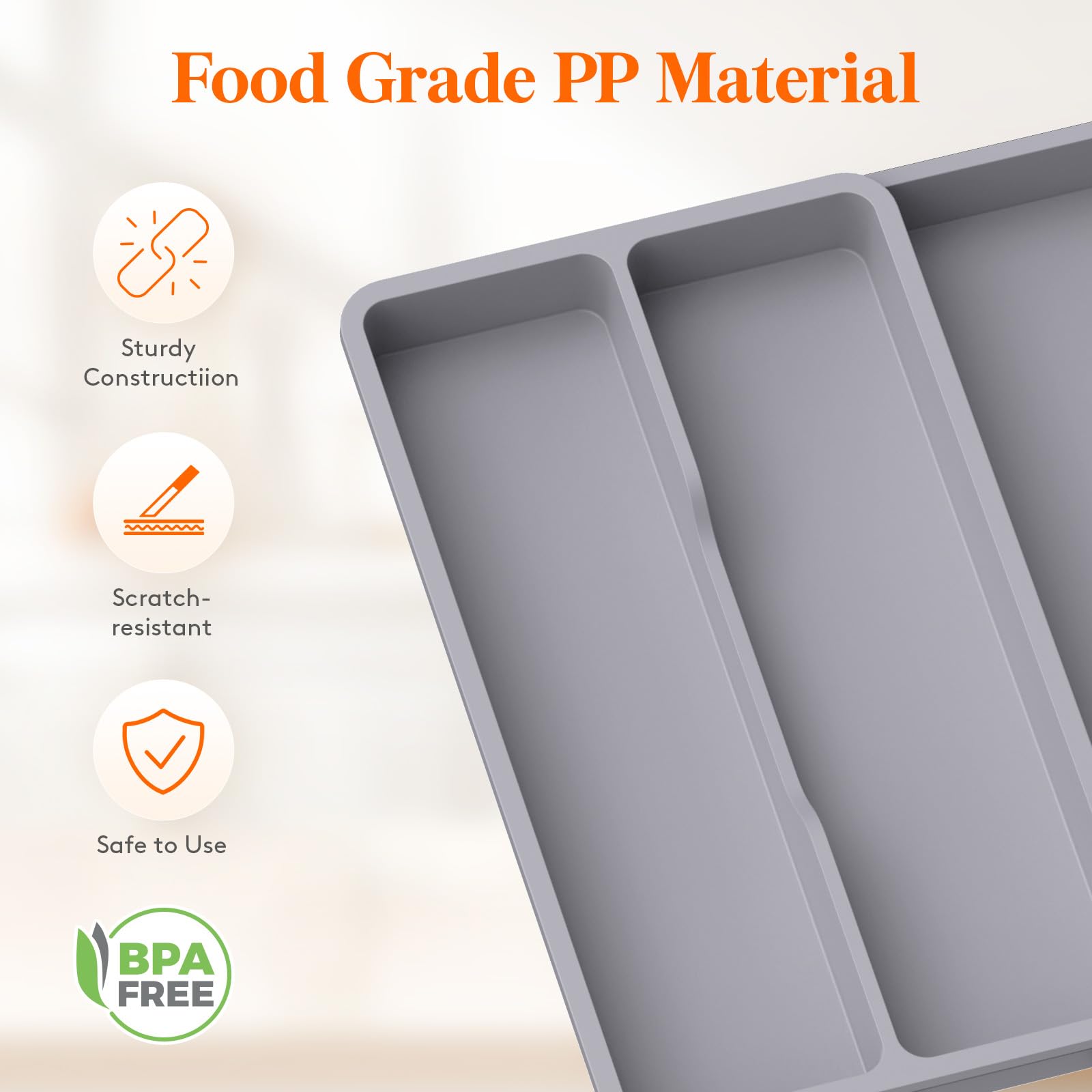 Robust and Safe: This kitchen drawer organizer is crafted from premium PP material, BPA-free and built to last. It ensures your silverware is stored in a healthy, safe environment for worry-free use
