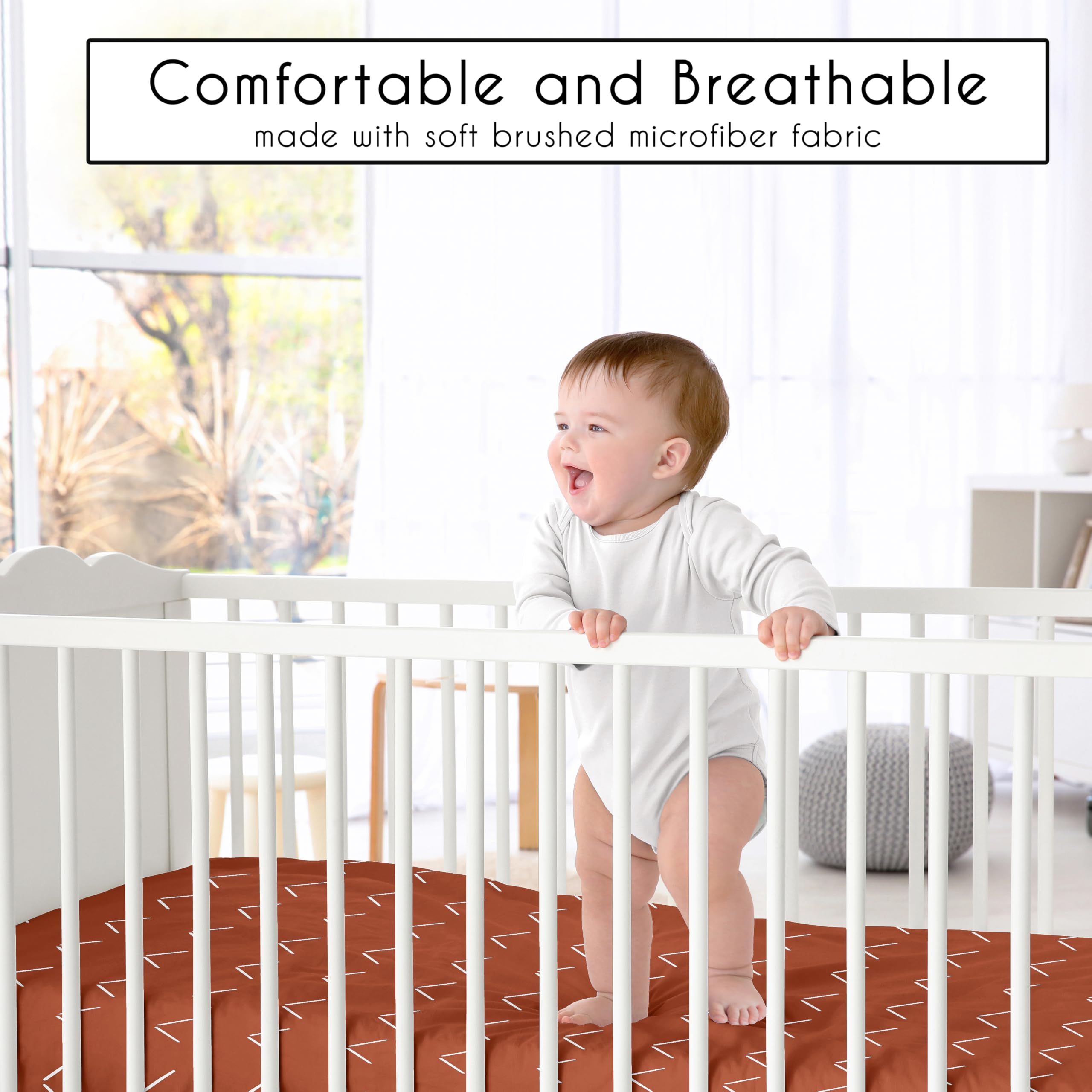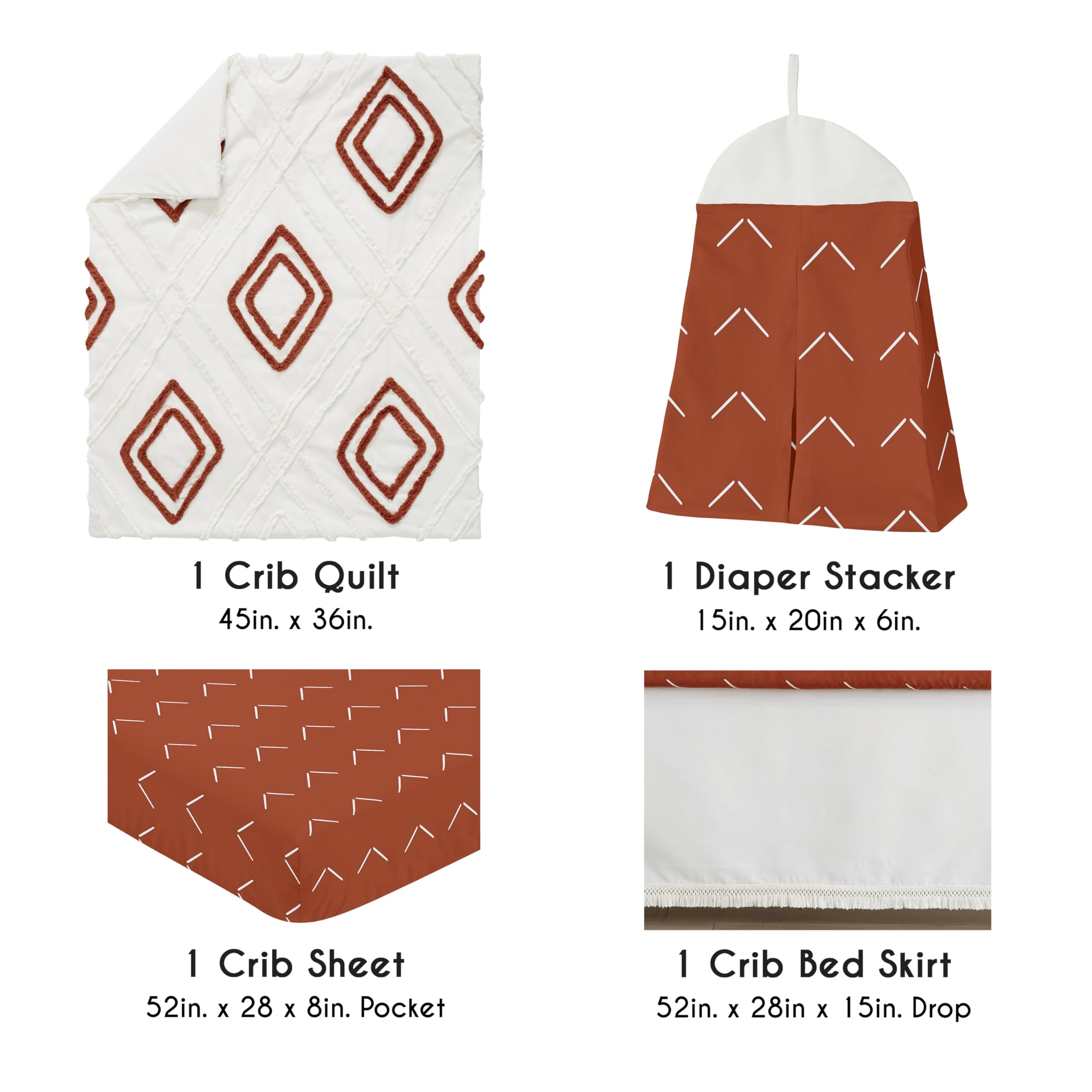 4 PIECE CRIB BEDDING SET INCLUDES: Crib Comforter (45in. x 36in.), Fitted Crib Sheet (52in. x 28in. x 8in. Pocket), Crib Skirt (52in. x 28in. x 15in. Drop) and Diaper stacker (15in. x 20in. x 6in.). An infant crib set including all the baby essentials is a great value compared to purchasing pieces separately. This baby crib set is made of soft cotton and microfiber fabric and features the minimalist color palette of orange and off white to bring your gender neutral boho themed baby room together