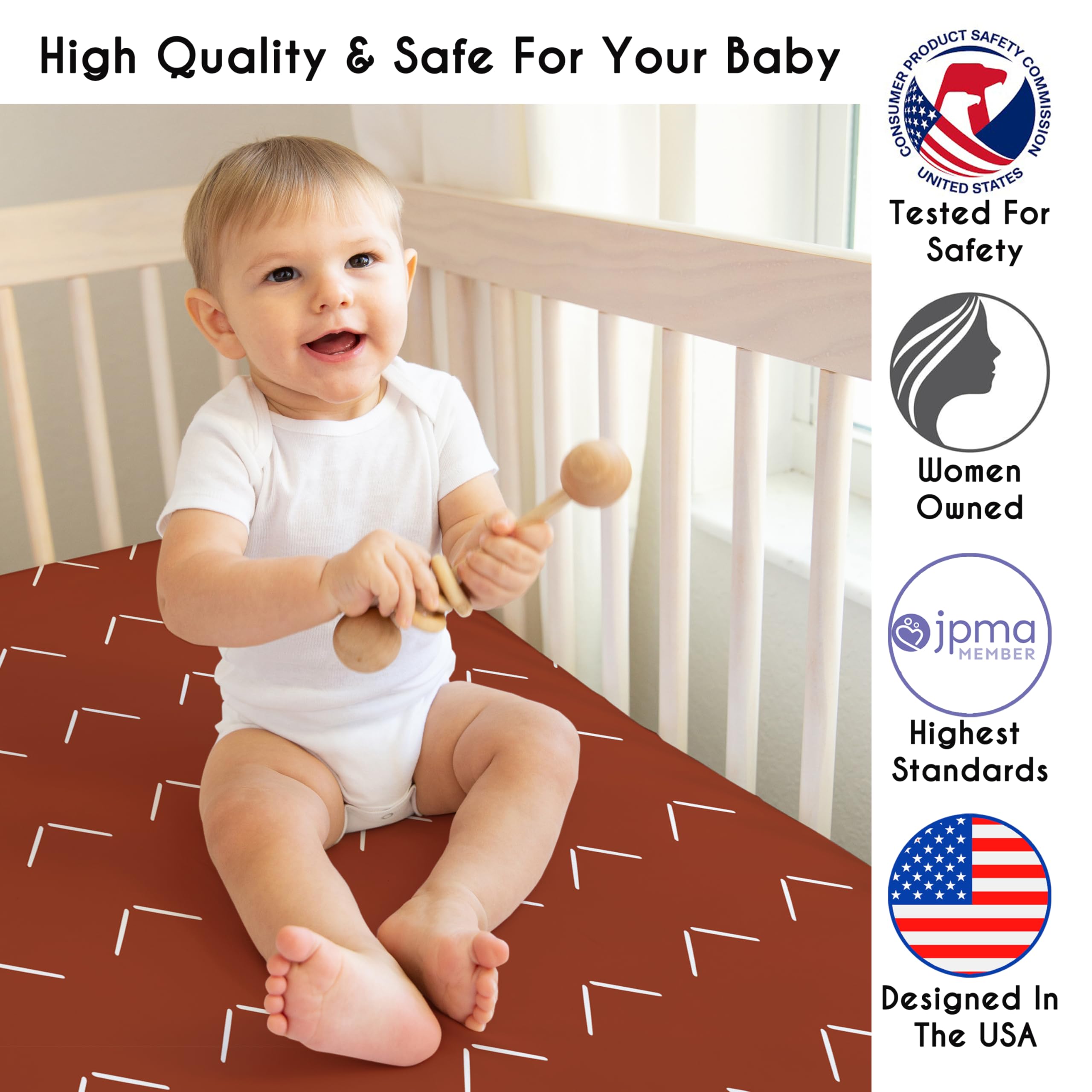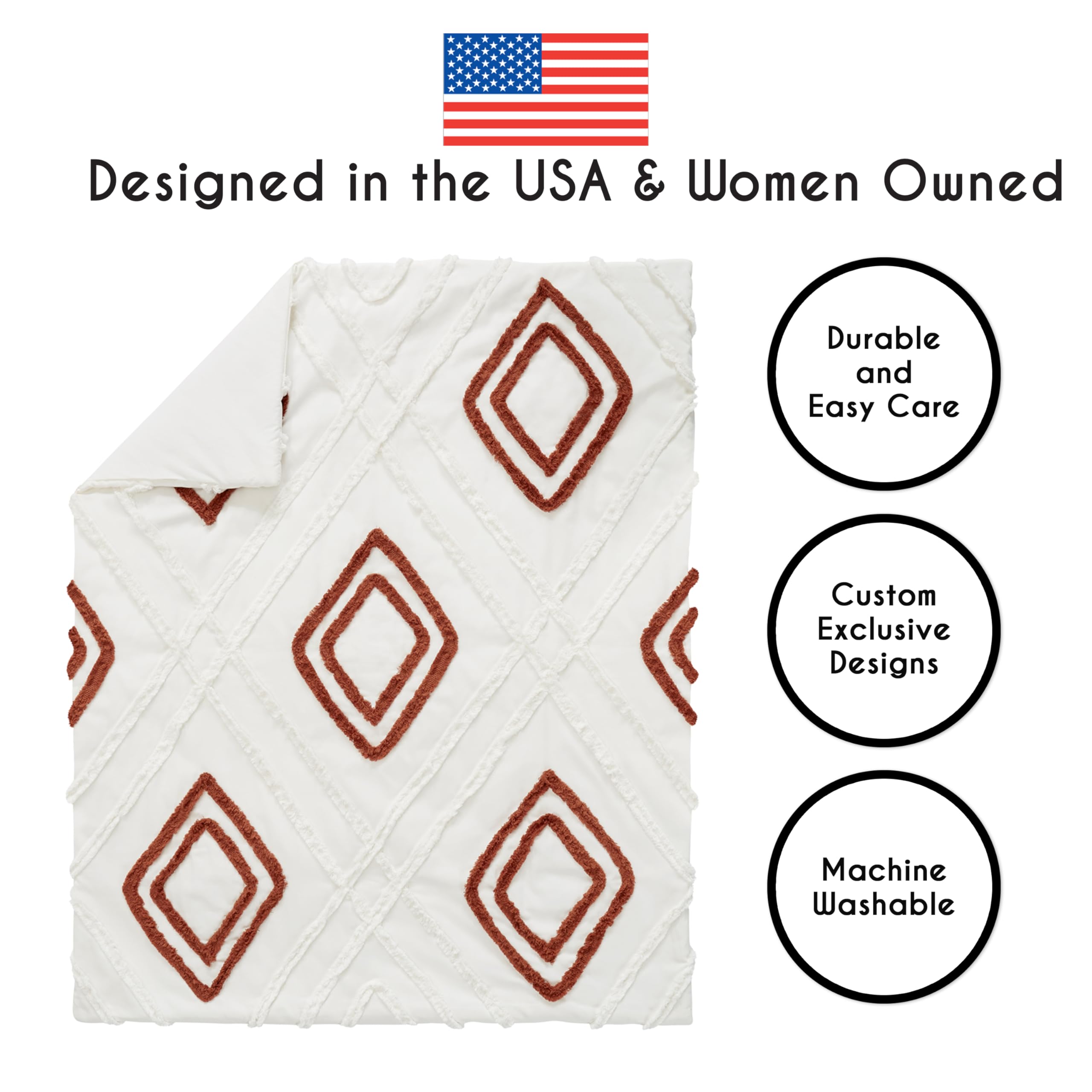 BOHO THEME: This neutral baby bedding boasts a crib blanket featuring modern farmhouse macrame tufted trim in a contemporary chevron diamond design that reverses to ivory. The off white skirt features a bohemian chic knotted macrame tassel fringe trim along the bottom. The orange rust geometric breathable crib sheet has elastic sewn around the bottom edge for a secure fit on most standard cribs. The matching diaper stacker keeps nappies conveniently organized. Machine washable. Tumble dry low.