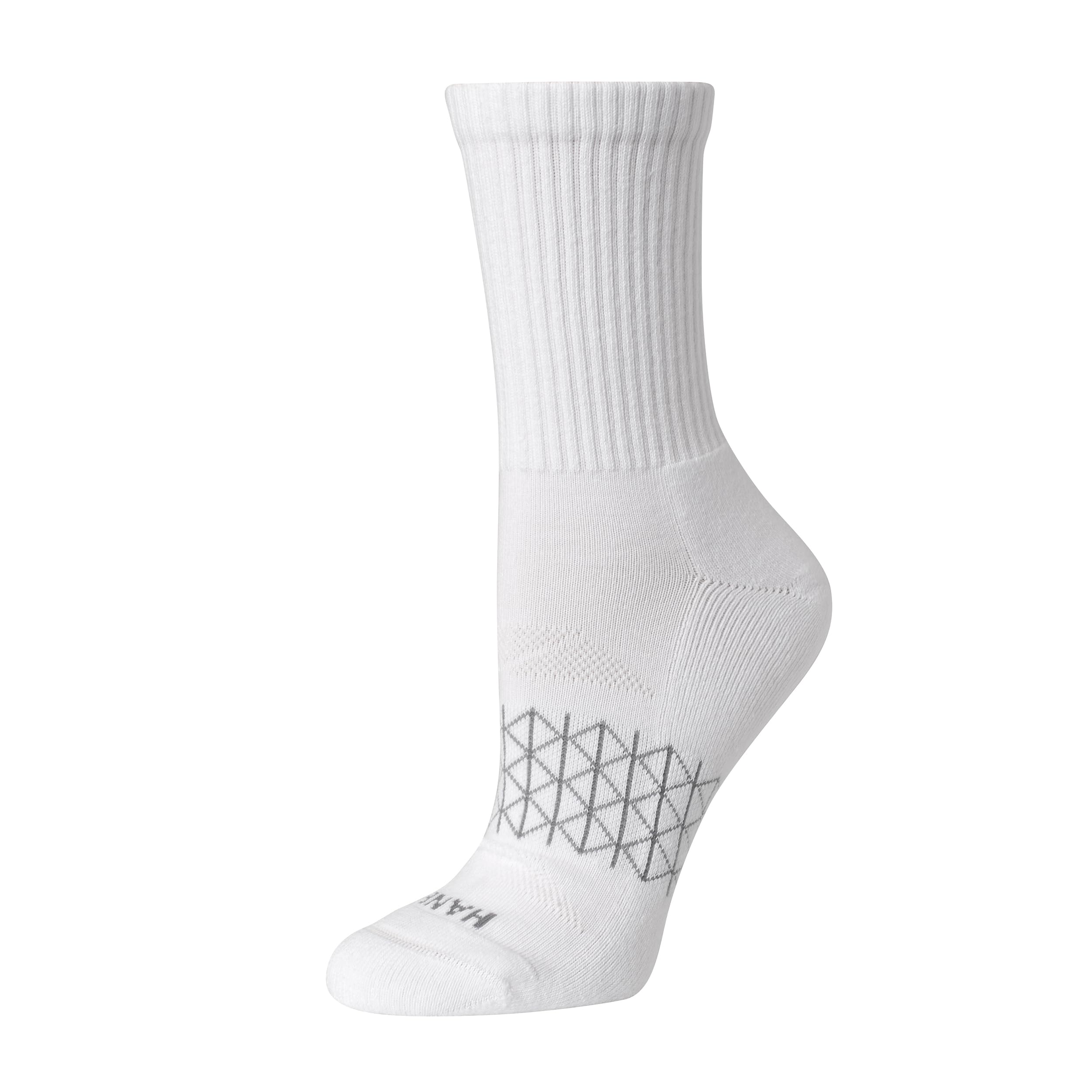 Description Crafted from a thick and soft cotton-blended fabric, Hanes Absolute Active women’s crew socks wrap your feet in a comforting embrace that’s like a warm hug for the soles. Enhanced with a ribbed arch support system, extreme cushion footbed, and a Y-heel pocket, they offer exceptional stability and a snug, superlative fit. A seamless toe helps reduce friction and irritation while the wicking fabric and mesh ventilation team up to keep you cool and comfy throughout the day. You’ll love the cute designs in versatile socks that you may not want to cover up with a sneaker. The best part? This four-pack of exceptional socks offers unbeatable quality at an impressive price point. Hanes Absolute. Because your comfort shouldn’t compromise your budget.