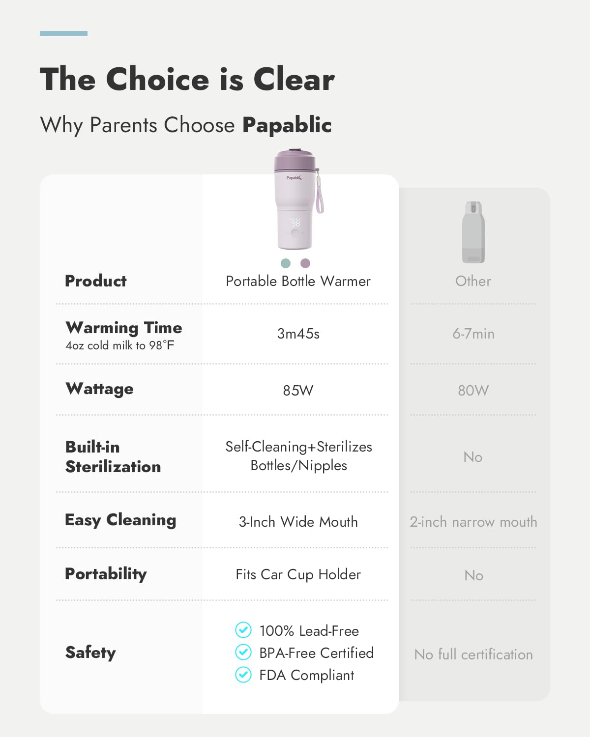 3-in-1 Convenience – Home & Travel: Papablic combines a traditional bottle warmer, portable bottle warmer, and portable sterilizer in one compact unit. Perfect for busy parents who want a versatile, space-saving solution.