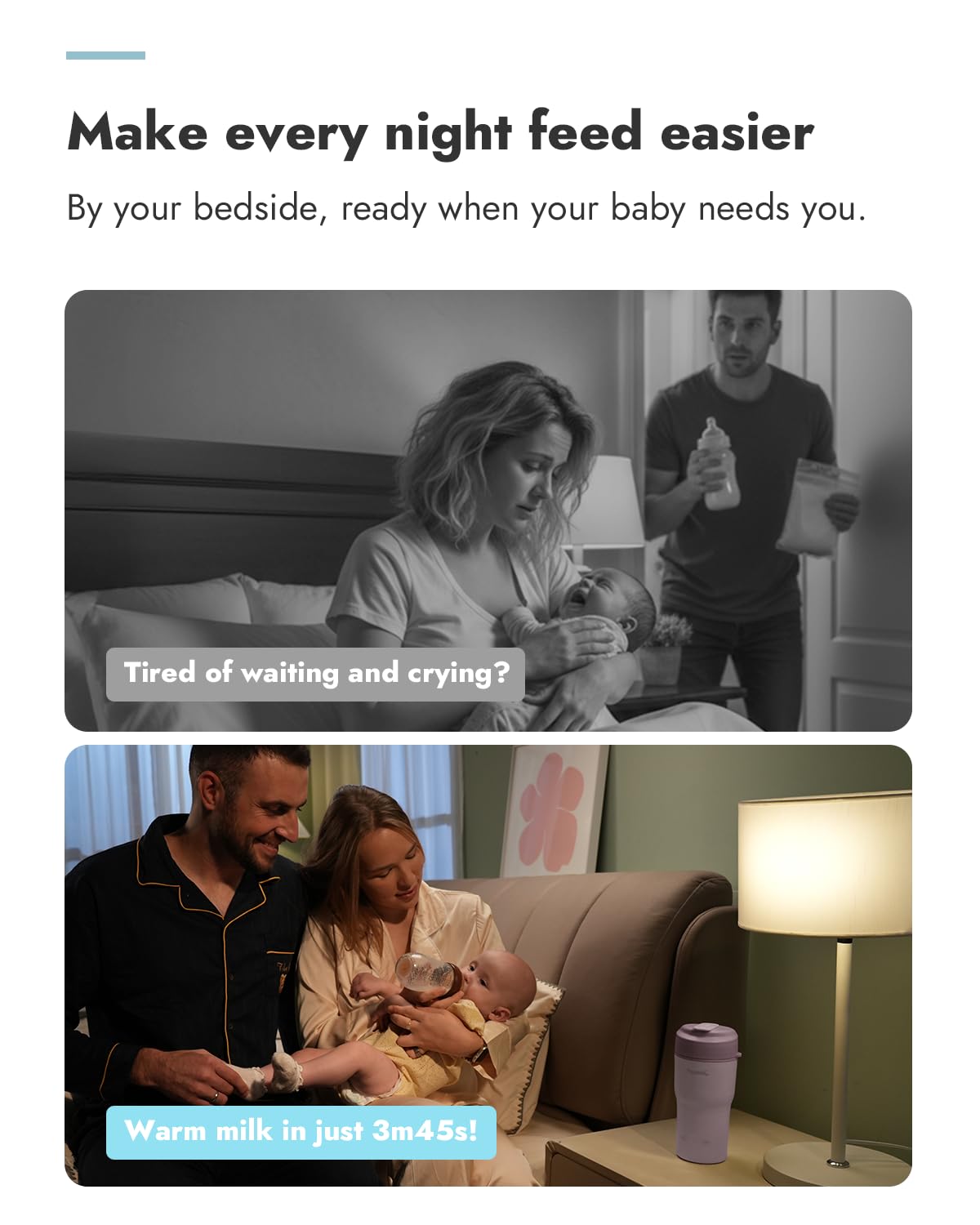 Ultra-Fast Heating – Milk Ready in Minutes: Heats 4oz of refrigerated milk to 98℉ in just 3m45s, and 4oz of room-temp water to 104℉ in 1m35s. Perfect for portable bottle warmer for breastmilk, night feeds, or when traveling.