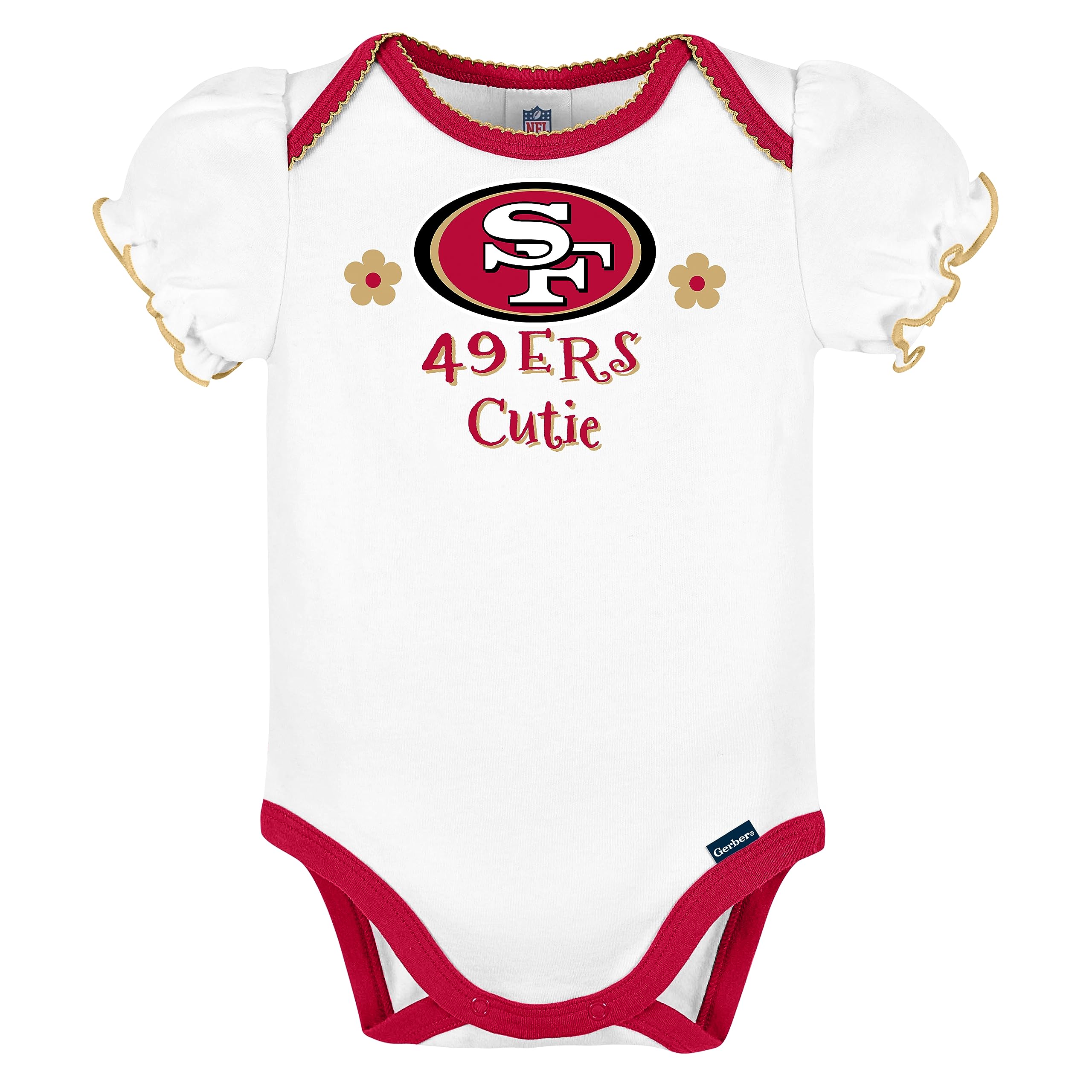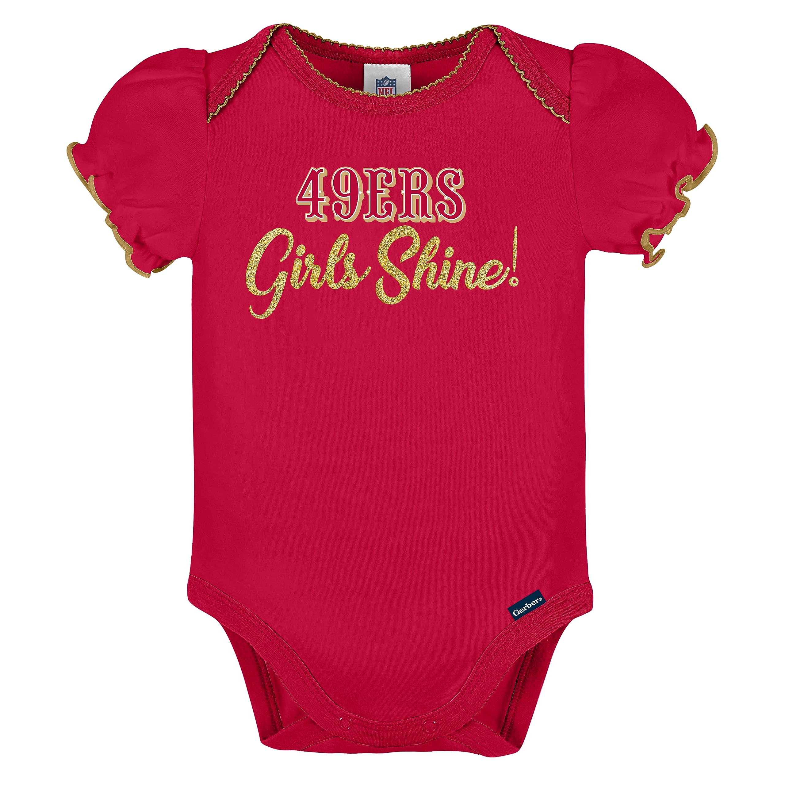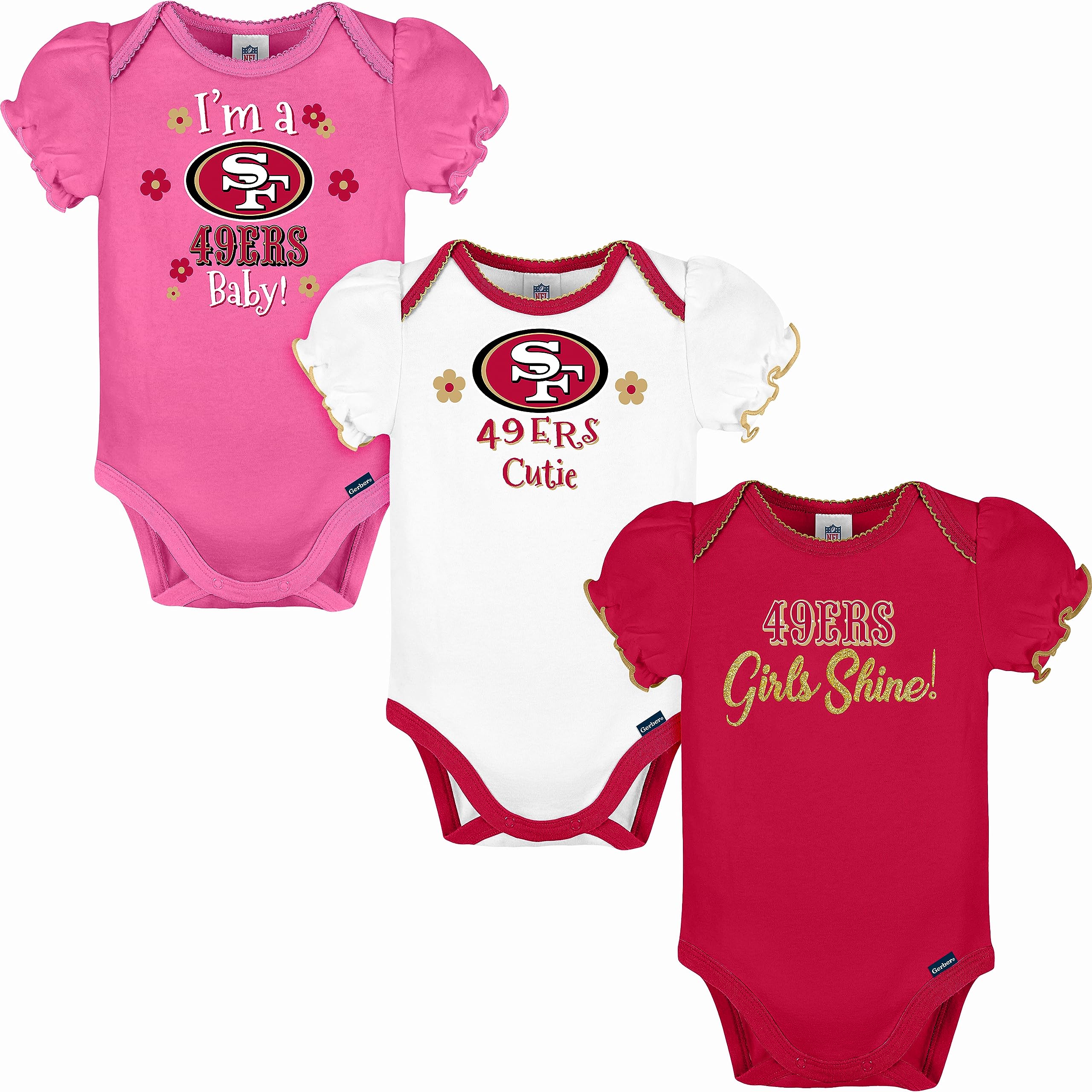 Description Itβs time for the whole family to cheer on the team! These officially licensed NFL bodysuits are the gear your little one needs for game day. Your baby will stay comfy throughout the entire game (and day!) in the cotton/poly interlock of these NFL baby bodysuits. The bodysuits feature expandable lap shoulder necklines to keep changes comfortable and quick. The bodysuits feature a variety of designs and patterns that show off babyβs team pride. The bottom snaps are positioned for convenient diaper changes, so taking breaks from the game donβt last longer than they need to. These baby girlsβ bodysuits are a great choice for warm or cool game days, as they may be layered over or worn all on their own. These bodysuits are machine washable for your convenience. Show your team spirit by dressing the whole family for the upcoming season!