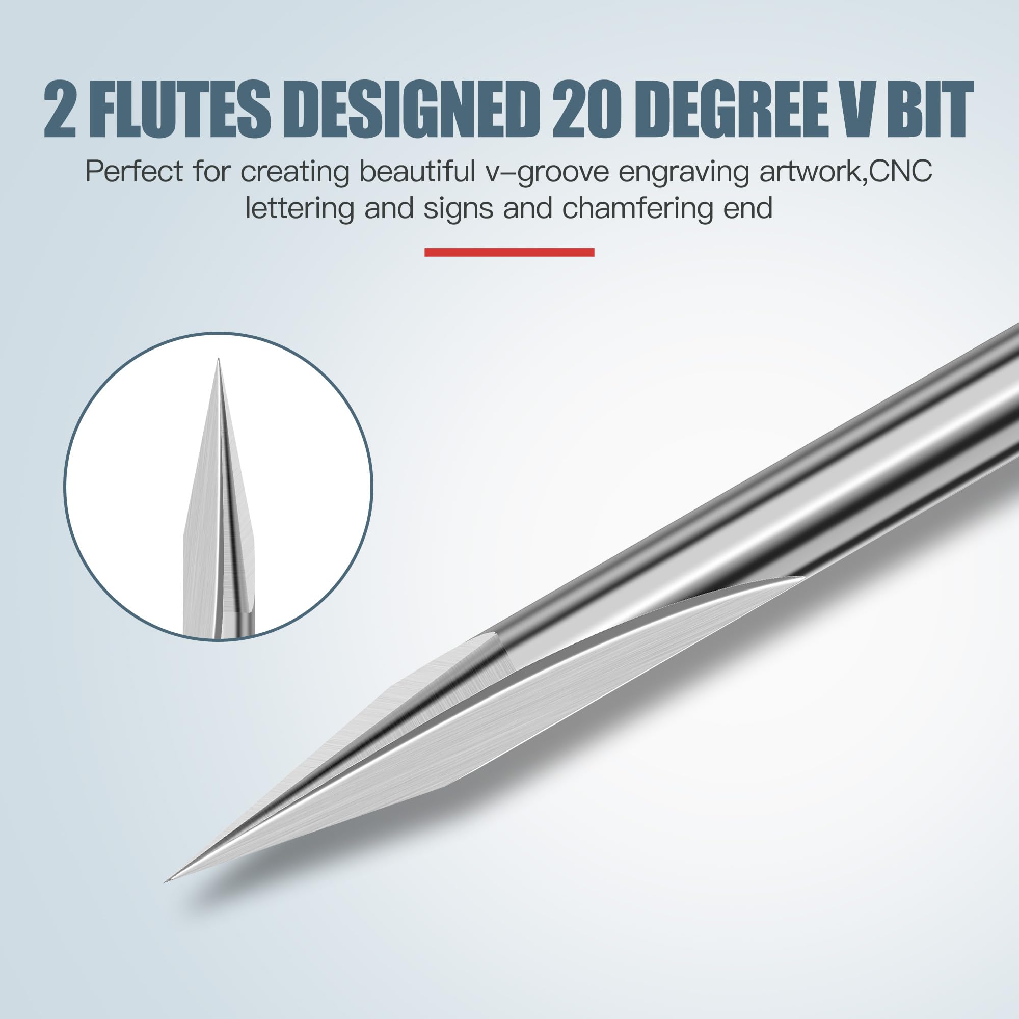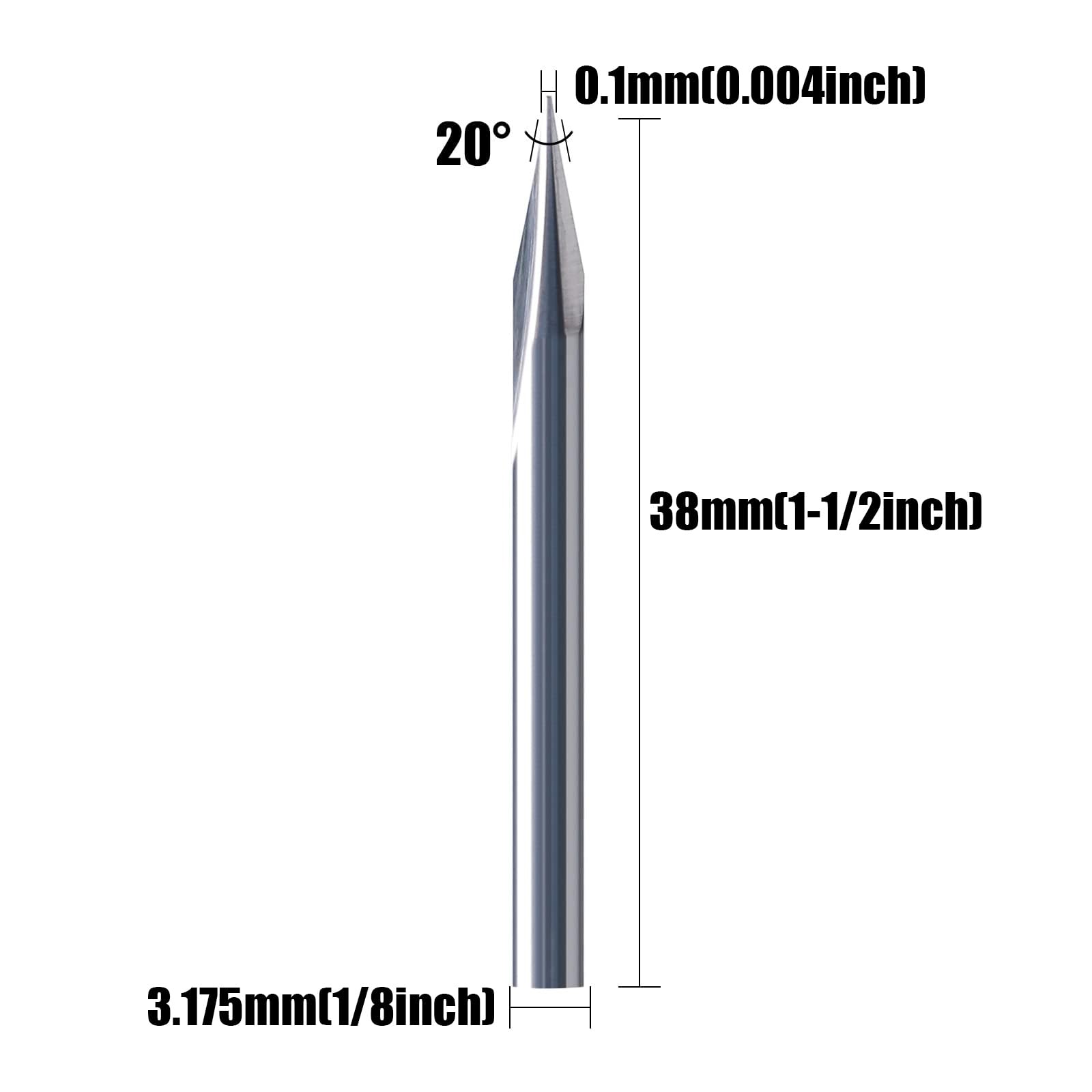 Engraving with Precision: CNC router bits 20 degree,1/8 shank, v groove engraving router bit is designed for detailed engraving, cutting, and carving applications. 0.1mm engraving 20 degree Perfect choice for carving and engraving details.