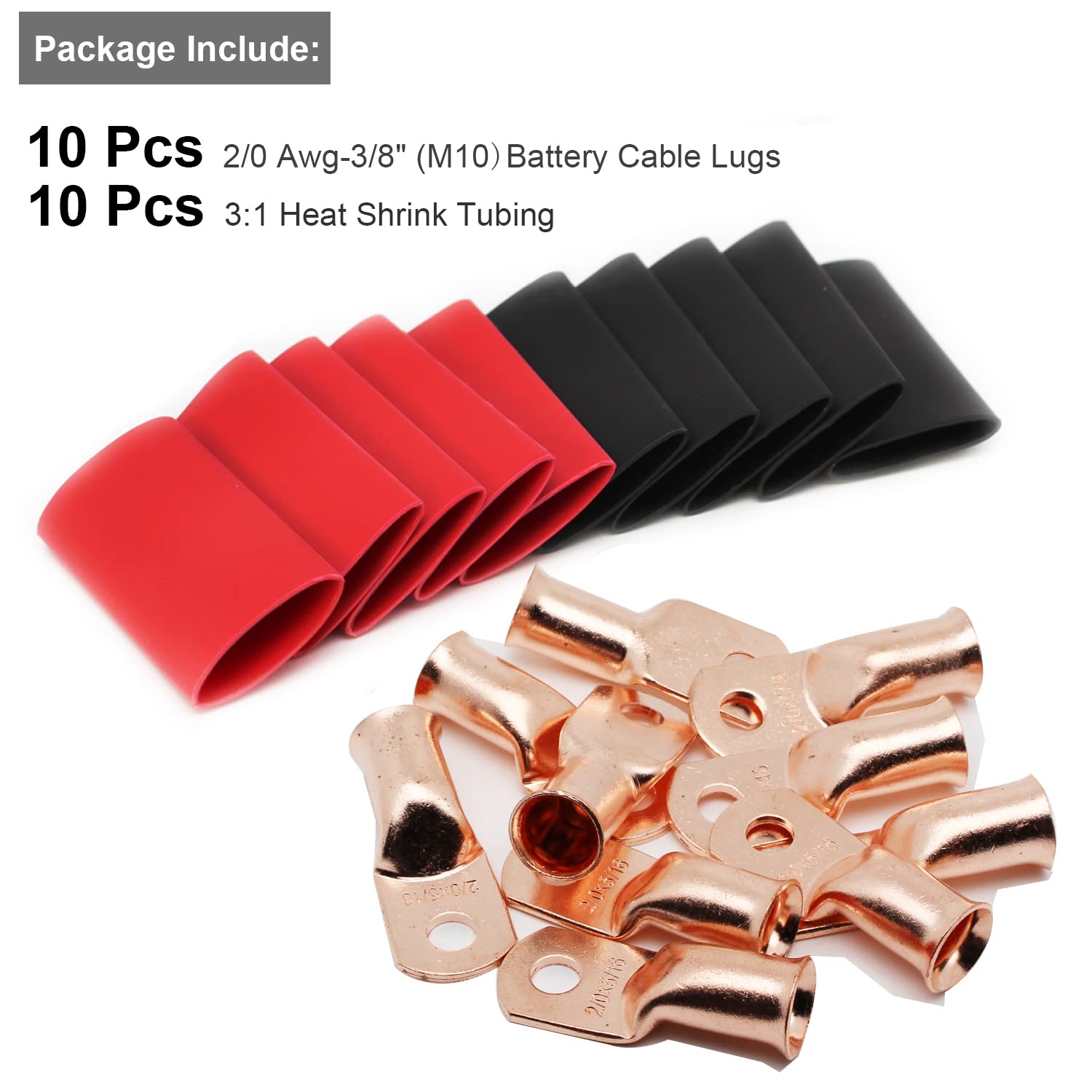 【What You Get:】 10 Pcs per pack of 2/0 Guage (AWG) 3/8" ring terminals, copper lugs closed end termination ring terminals with 10 Pcs 3:1 Dual Wall Adhesive Heat Shrink Tubing Tube for your work(5pcs Black and 5pcs Red).