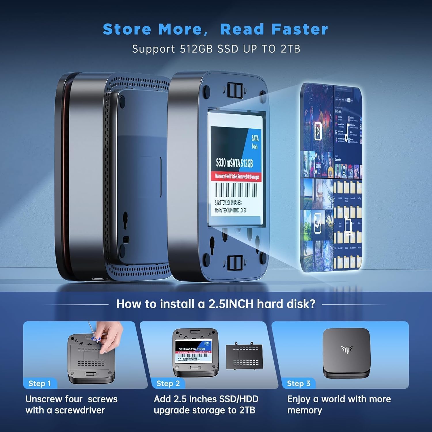 Ideal For Multitasking: The Mini Computer has equipped with 8GB DDR4 and 256GB M.2 2280 SSD. Sufficient capacity allows you to get rid of the trouble in multitasking. Capacity upgrade options: replace the M.2 SSD up to 2TB. add a 2.5-inch SSD/HDD up to 2TB(not include). Smooth processing speed and powerful features double your work efficiency