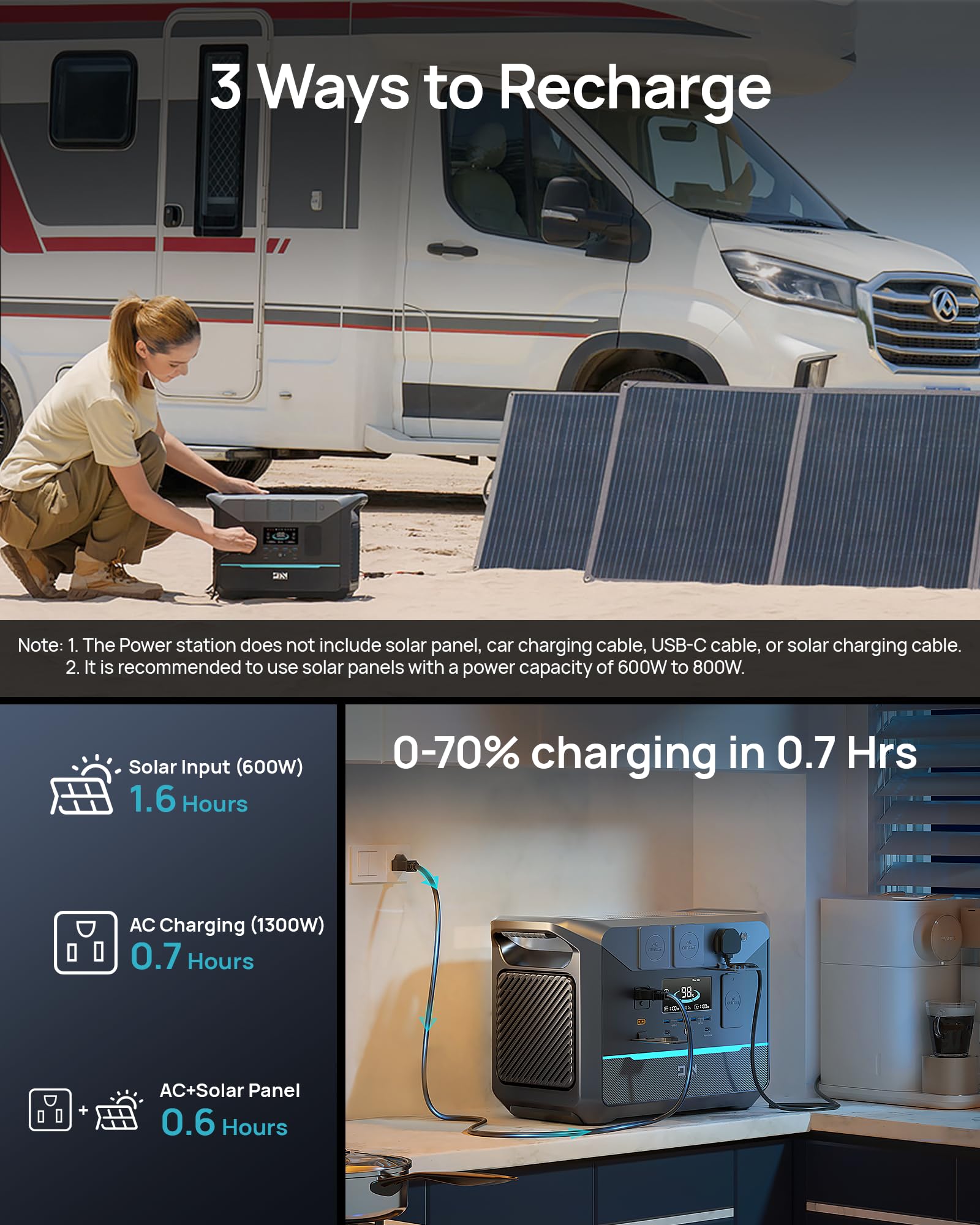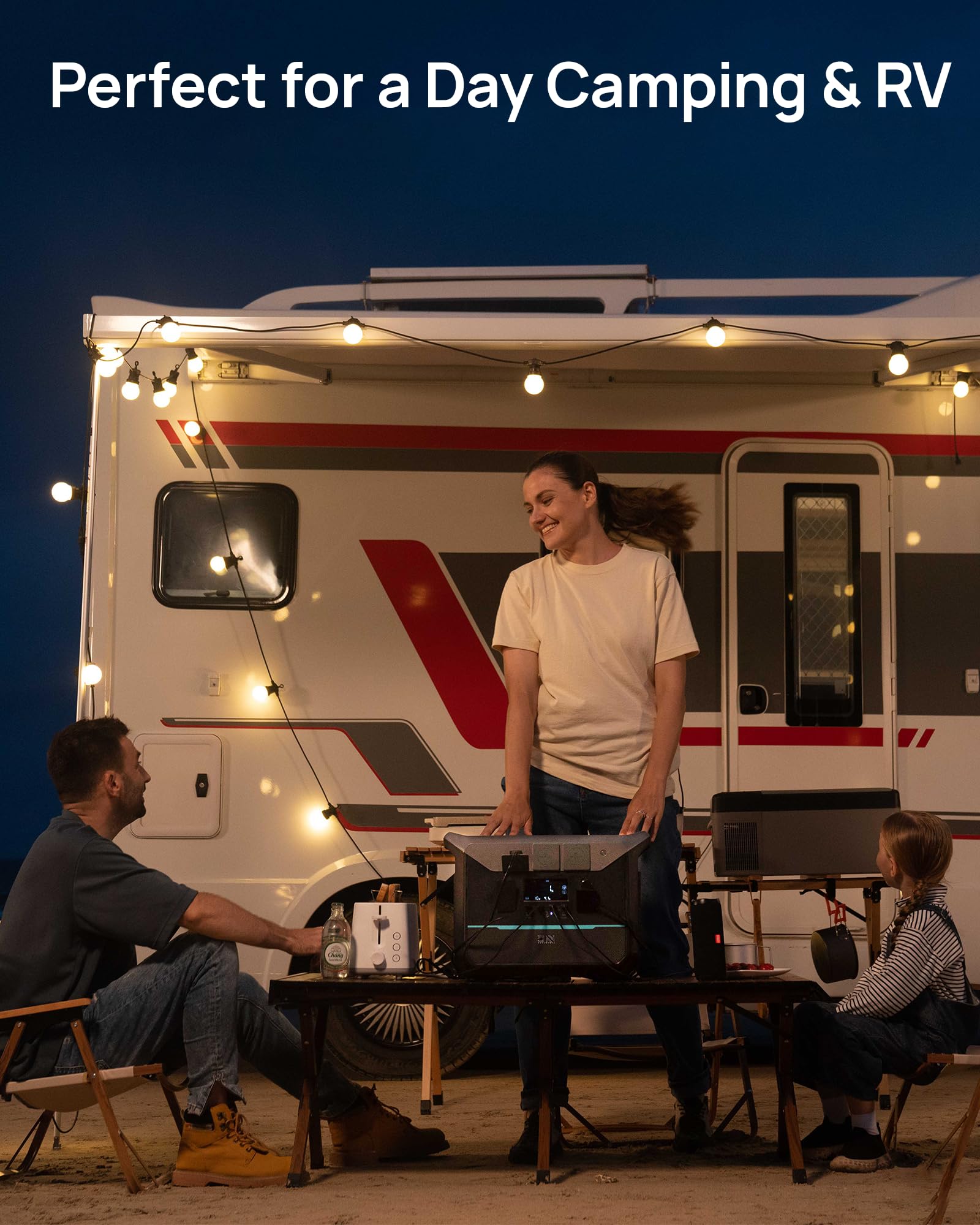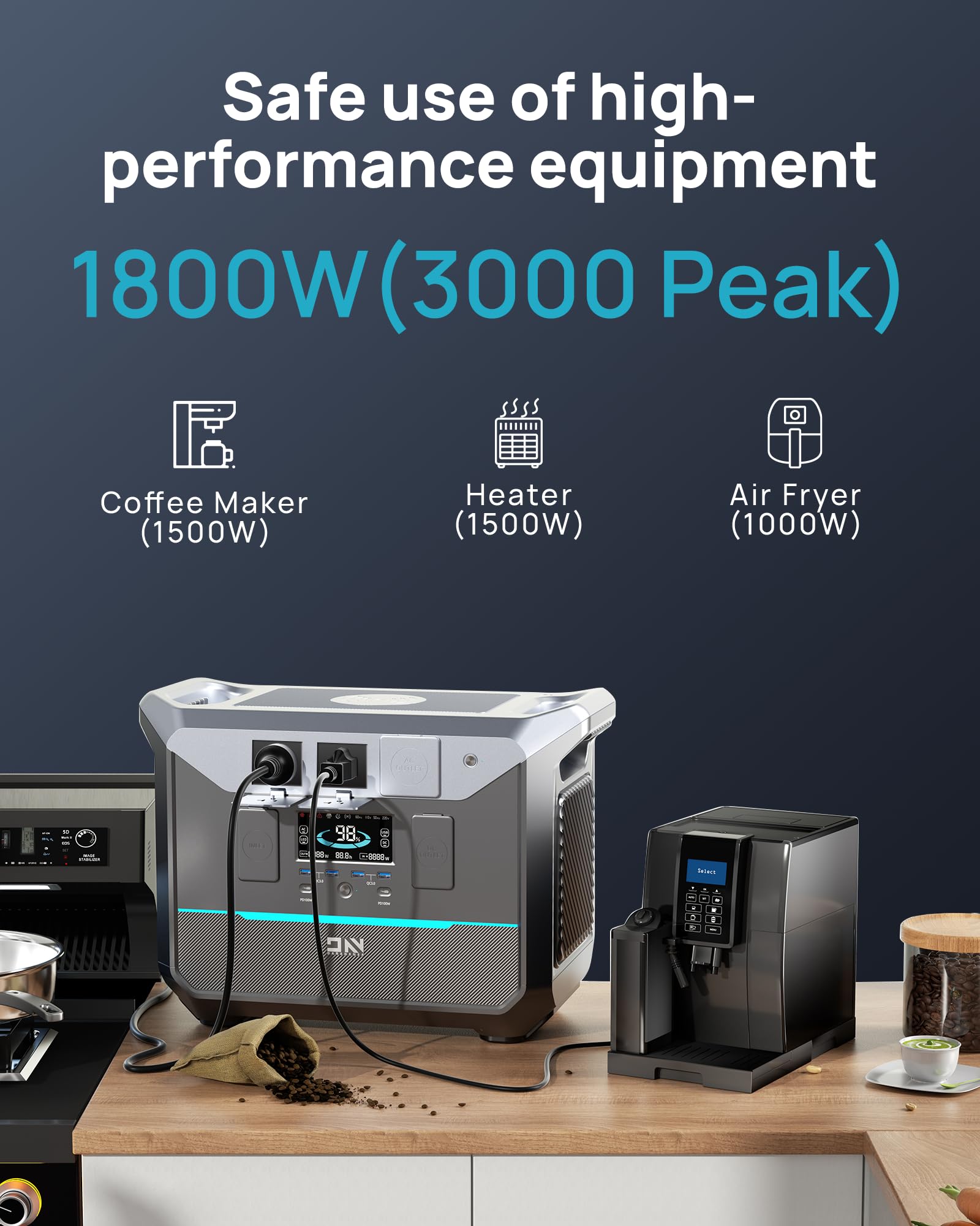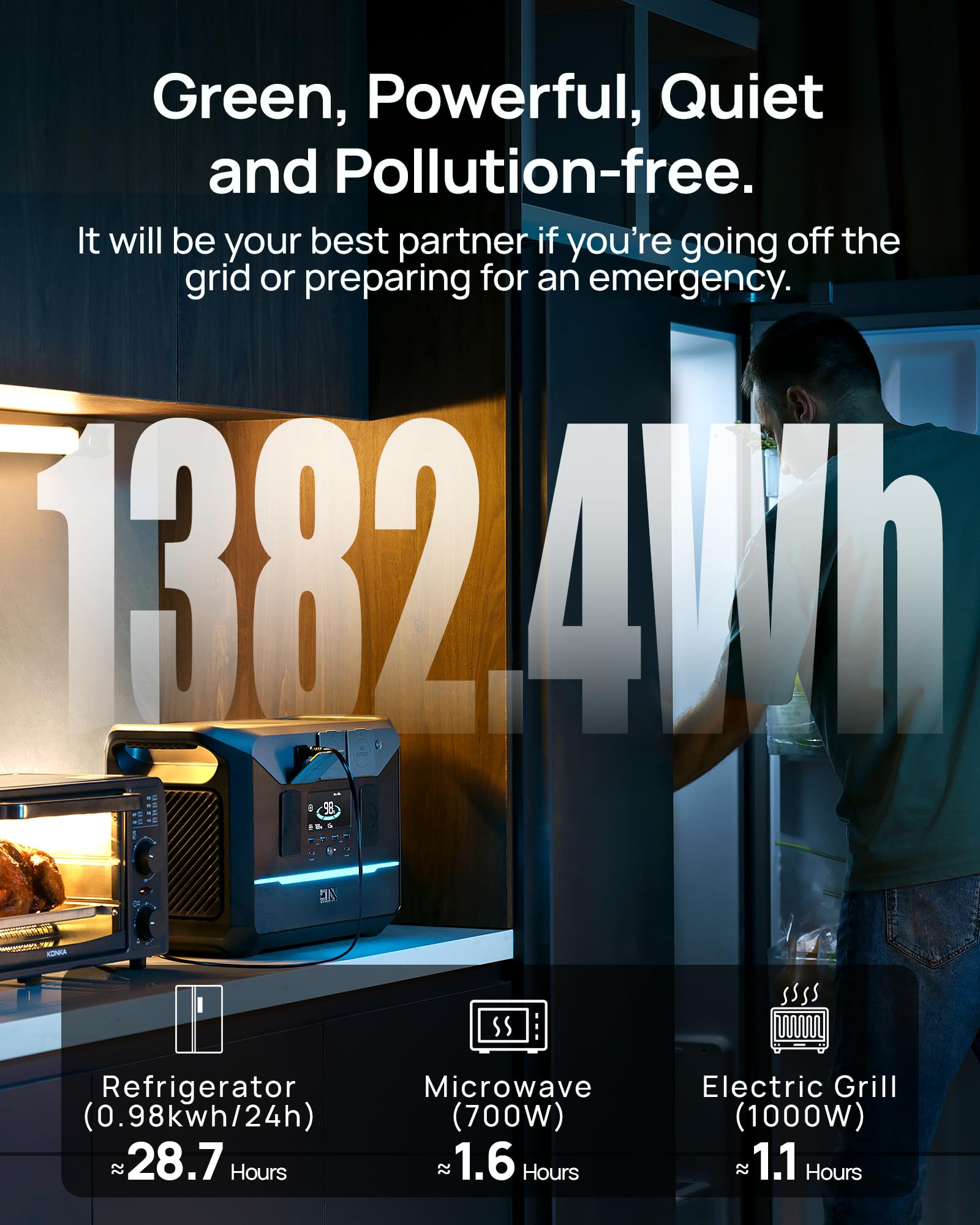 【Silent & Fume-Free】Power Your Weekend Escape, Not a Gas Station Say goodbye to noisy, smelly generators at your campsite or tailgate. With a massive 1382.4Wh capacity and a robust 1800W output (3000W surge) , this compact powerhouse silently runs your RV fridge, electric grill, coffee maker, and charges all your devices at once. It’s the ultimate companion for a peaceful night in the woods or keeping your family comfortable during a home power outage—all with zero emissions, so it’s safe to use anywhere.