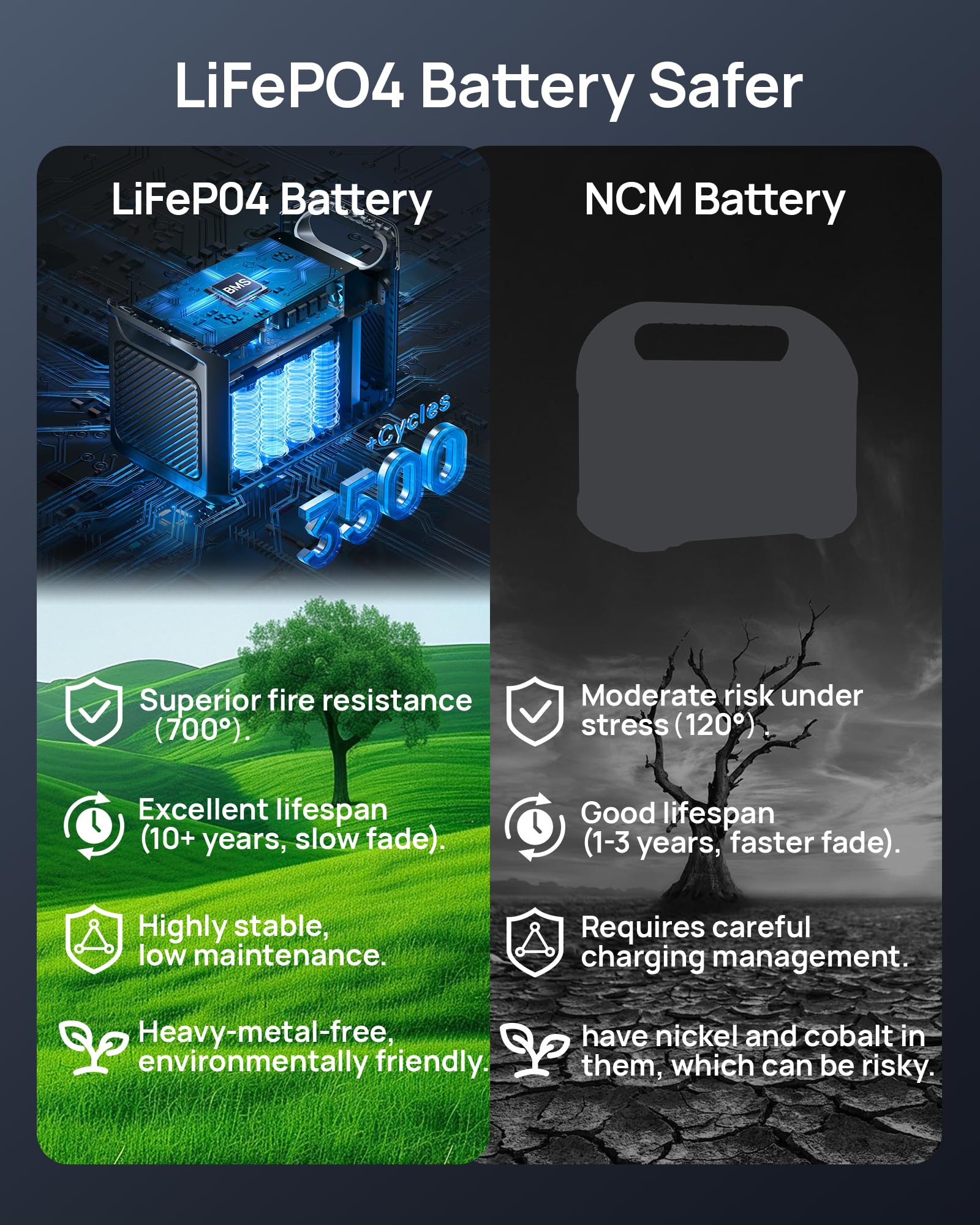 【10-Year Reliability】A Smarter Investment in Long-Lasting Power Powered by premium LiFePO₄ battery technology, this station is engineered for over 3,500 charge cycles—that's a decade of dependable use. It delivers higher capacity and longer battery life than traditional options, making it a high-value choice for outdoor enthusiasts and home-preppers alike. Backed by a 5-year service plan and lifetime support, it's built to protect what matters, year after year.