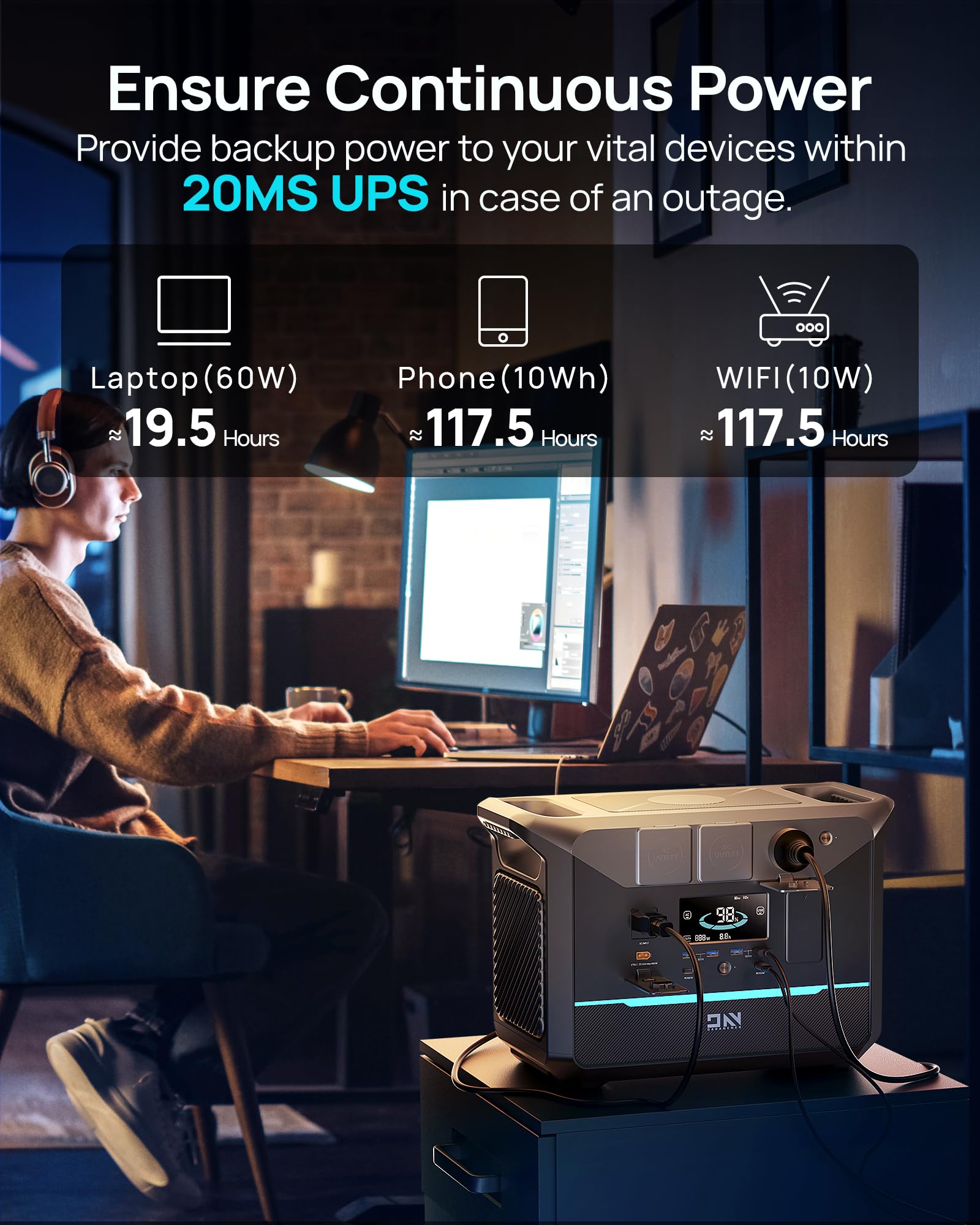 【20ms UPS Backup】Instant Power for Your Most Critical Gear When the lights flicker at home or you're off-grid, your sensitive electronics stay safe. The built-in UPS function switches in just 20 milliseconds—so fast your CPAP machine, computer, or Wi-Fi router won't even reboot. This reliable protection ensures seamless power for medical devices and home office equipment, giving you true peace of mind during unexpected blackouts.