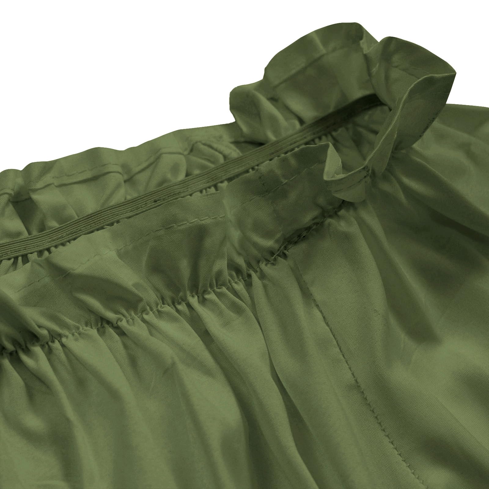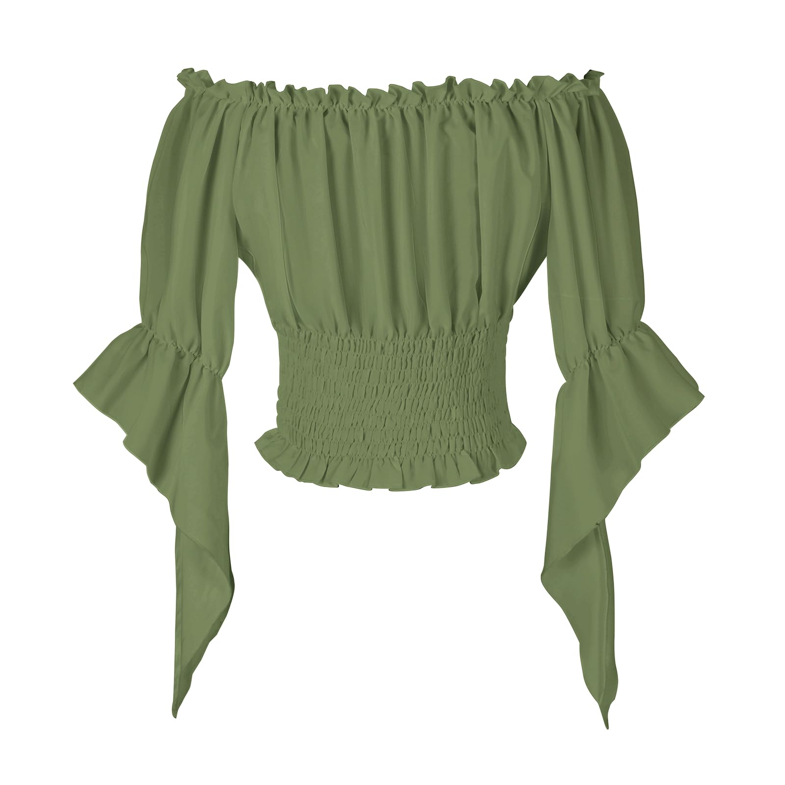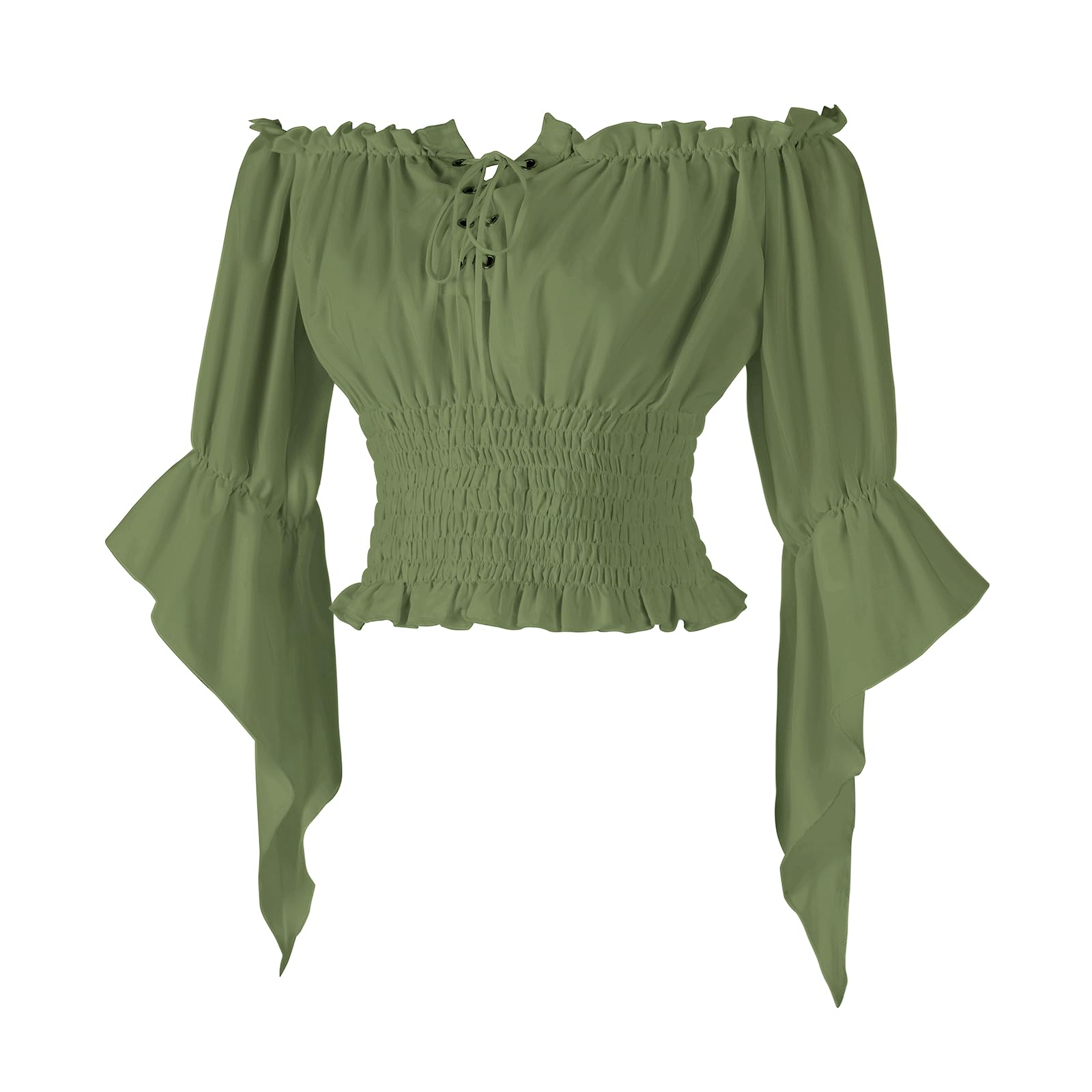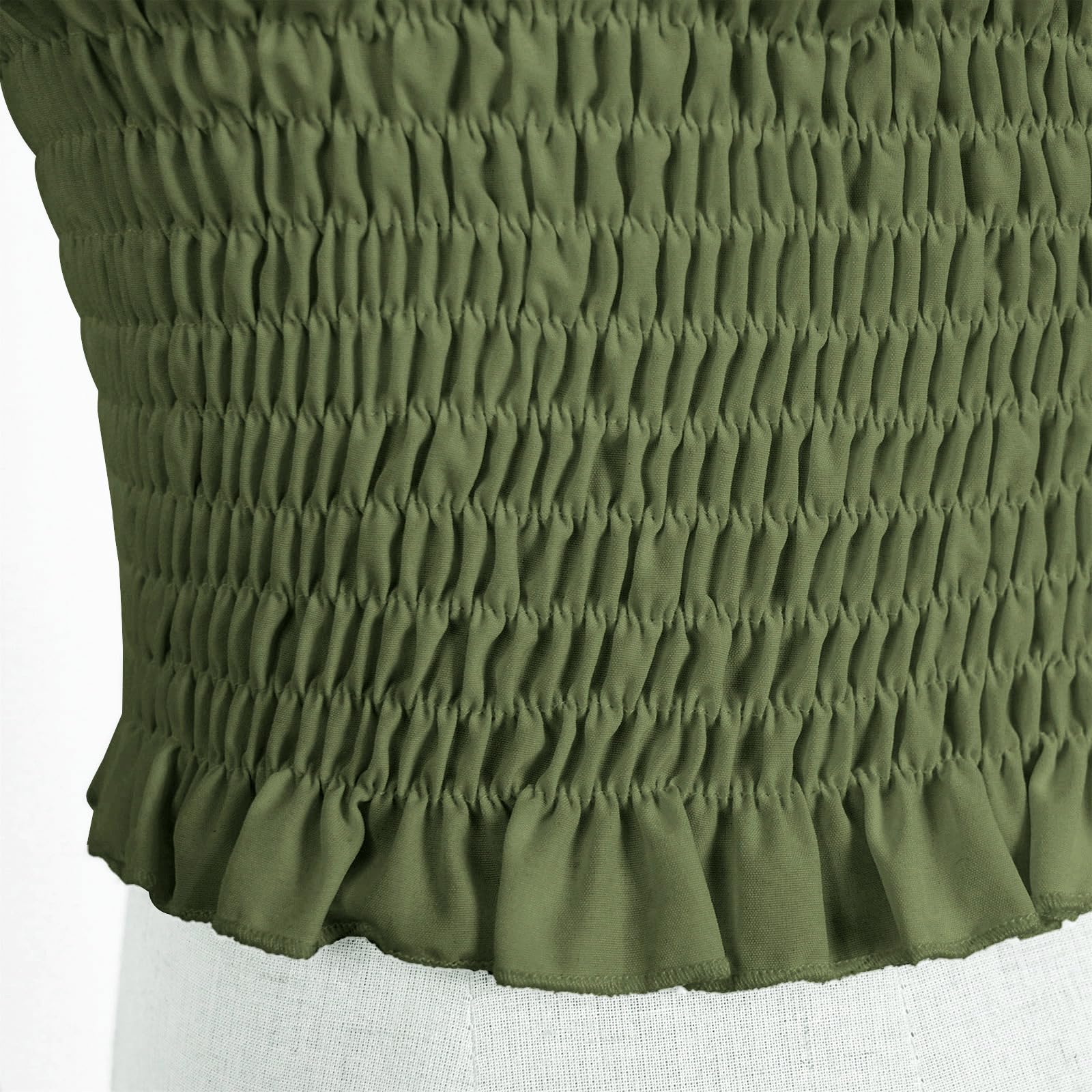DESIGN:Off the shoulder design can be worn on or take off, Long trumpet sleeves, ruffle neck and cuffs, Elastic high smocked waist, soft and comfortable fabric.