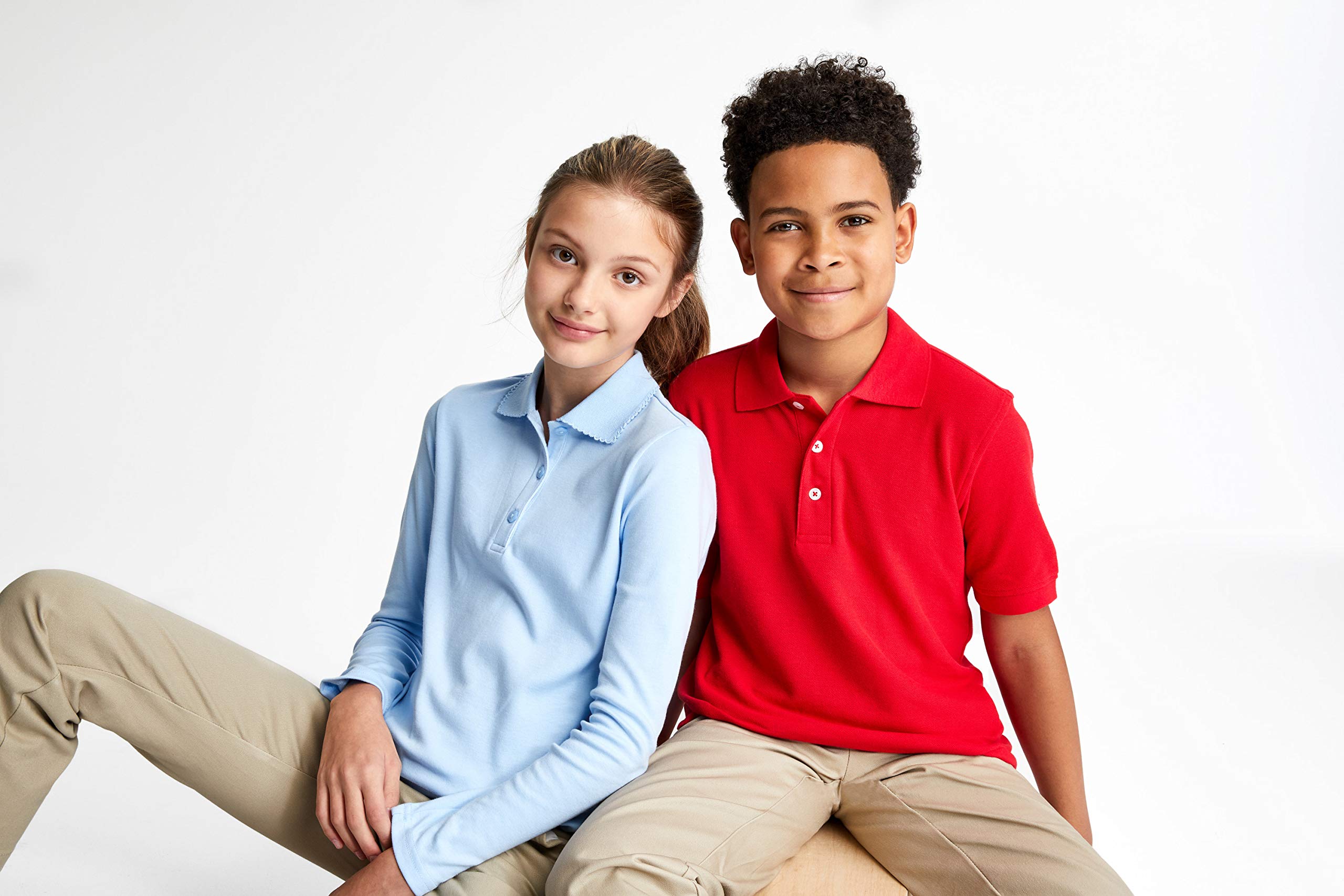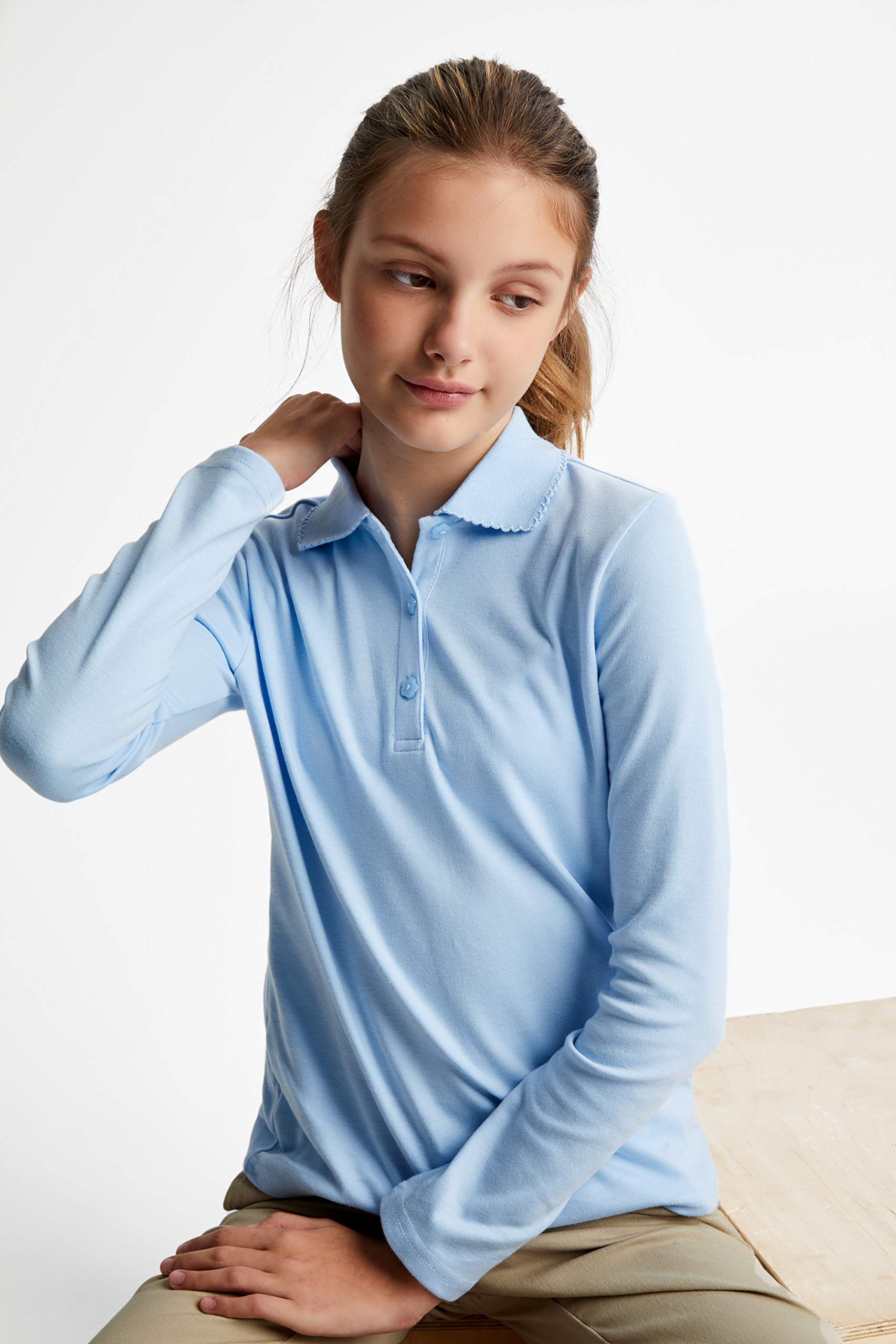 Description This super-soft interlock long sleeve polo keeps kid comfy from week-to-weekend. Heavy weight interlock, 3 button placket, and drop tail hem.