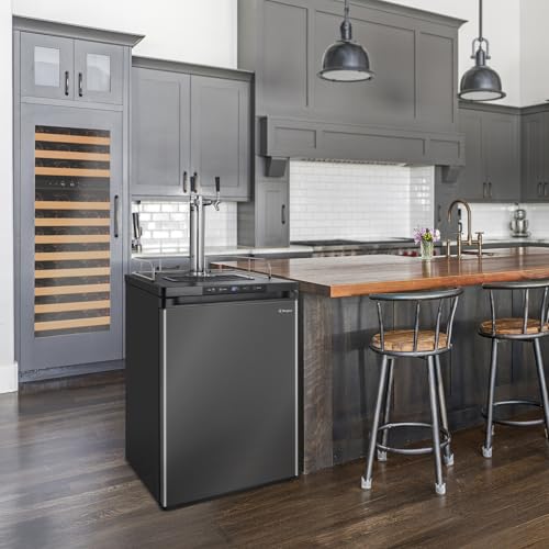 STYLISH DESIGN: Designed for home brewers and equipped with 3 Tap set up without a Cornelius Ball Lock Keg. Built with a black stainless steel door that resist smudges and fingerprints more than standard stainless steel while cleaning is easily done with a damp towel follow by a soft cloth. It features a removable drip tray, a chrome safety rail, and easy-roll locking casters. The UL listed unit measures 33.25" H x 24" W x 25" D.