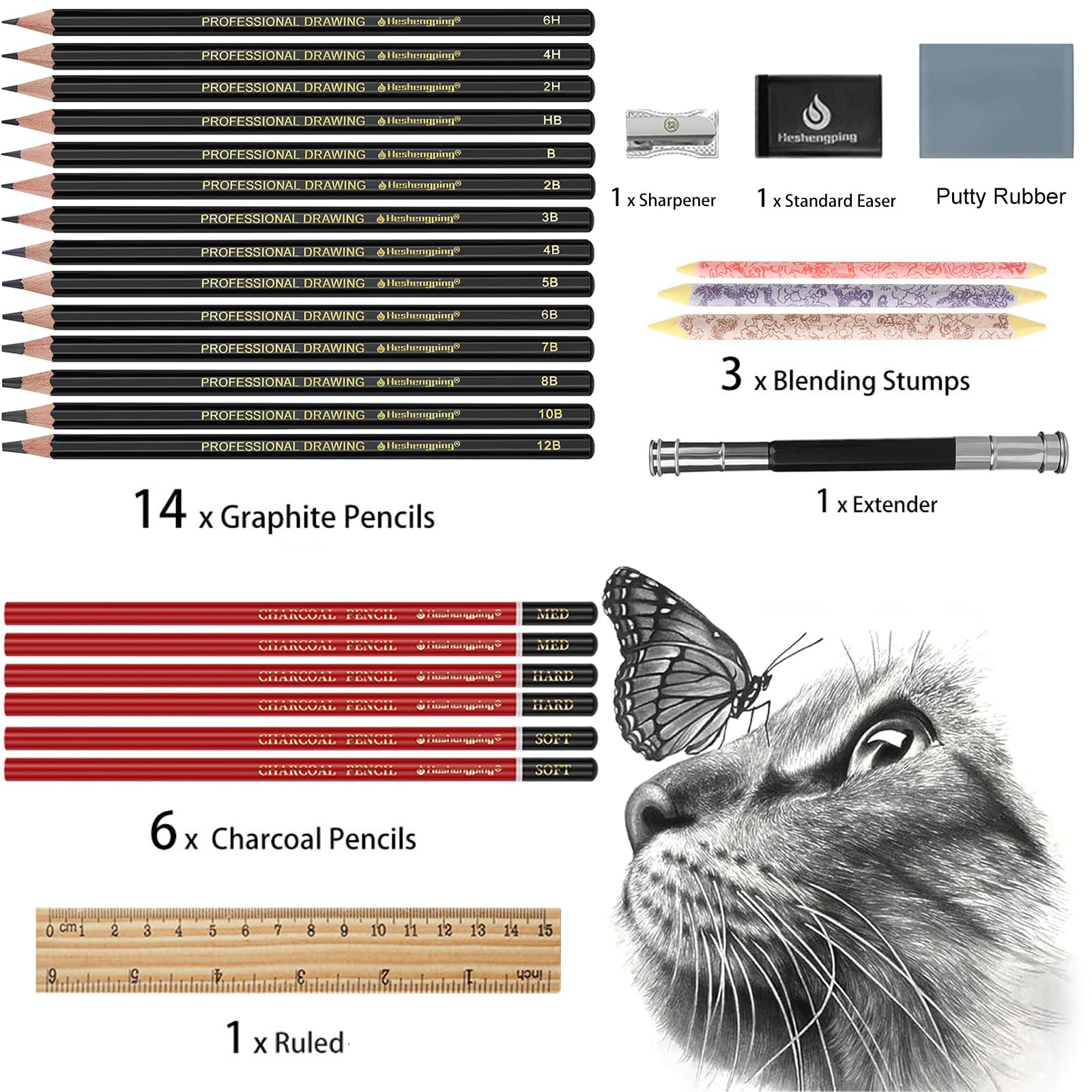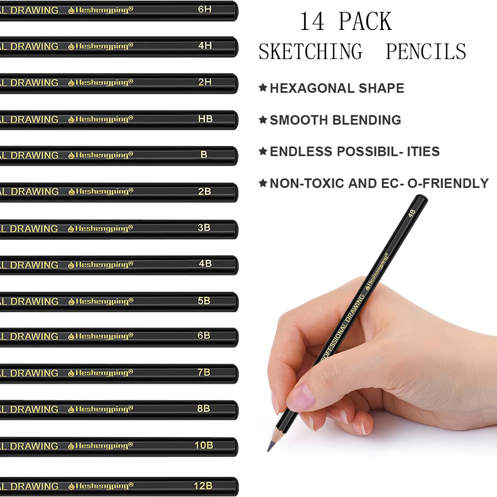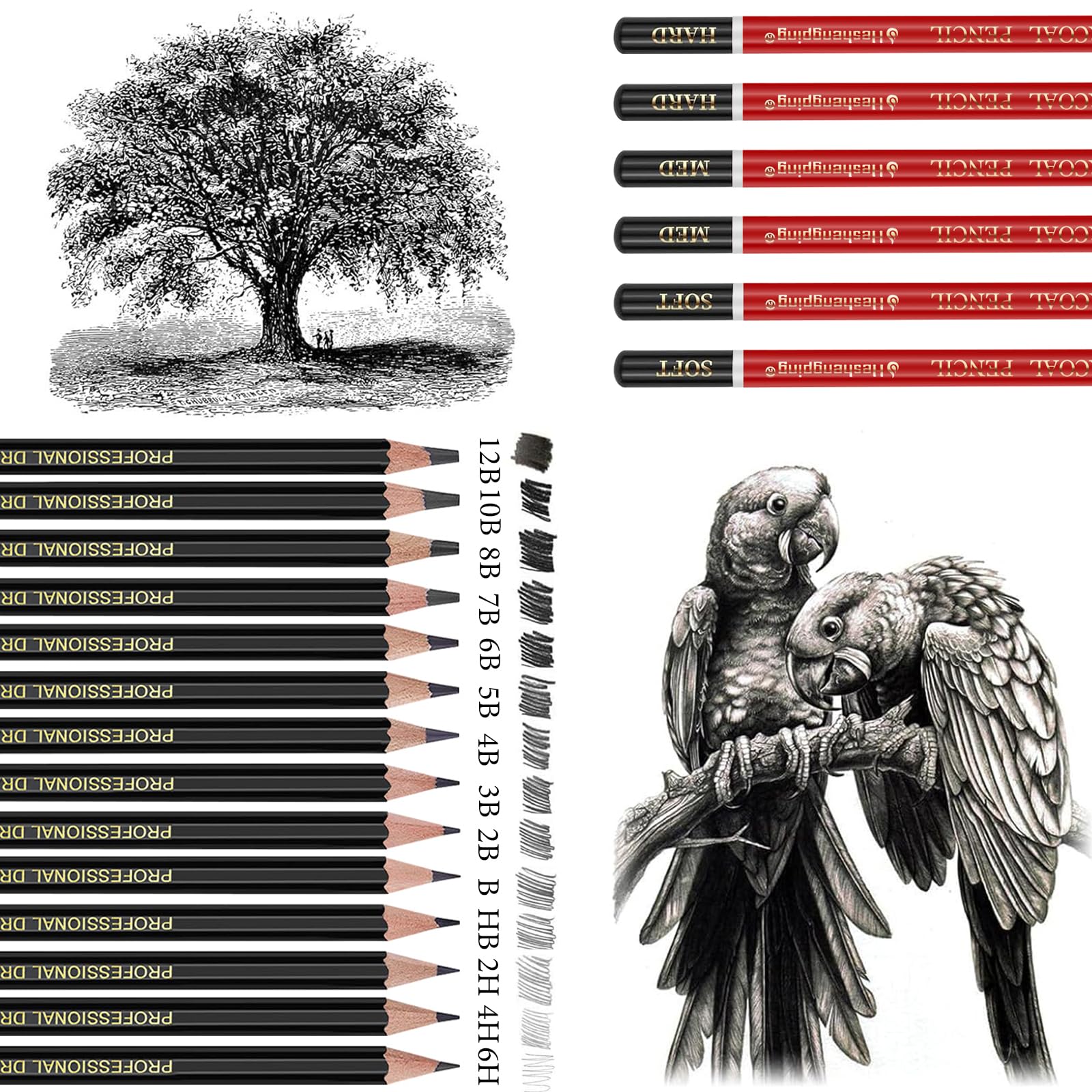 【20pcs Art Pencils】Includes 14 pencils (12B, 10B, 8B, 7B, 6B, 5B, 4B, 3B, 2B, B, HB, 2H, 4H, 6H), 6 charcoal pencils ( 2 soft, 2 medium, 2 hard )