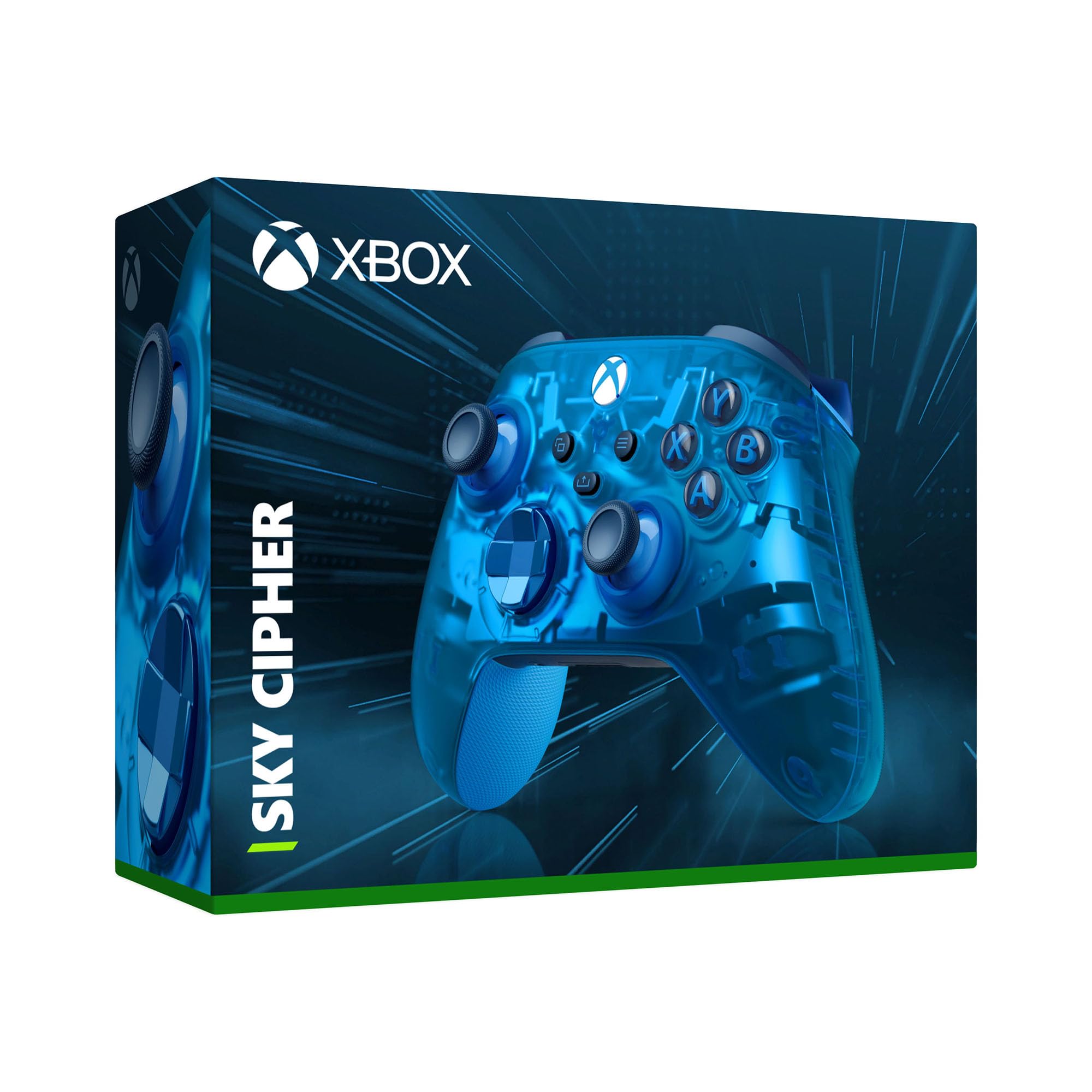 Reveal the mysteries within the Xbox Wireless Controller – Sky Cipher Special Edition featuring a transparent blue design, silver interior, metallic features, and more. Look through the blue transparent top case and side caps to see metallic, silver interior parts shine through from inside. Hold on to the action with rubberized, Sky Blue grips on the back-case. Stay elegantly on target with Sky Blue metallic triggers and a matching D-pad surrounded by a dark blue accent. Seamlessly capture and share content such as screenshots, recordings, and more with the dedicated Share button. Connect using the USB-C port for direct plug and play to console and PC. Support for AA batteries is included on the rear. Get up to 40 hours of battery life. Plug in any compatible headset with the 3.5mm audio jack. Use the Xbox Accessories app to remap buttons and create custom controller profiles for your favorite games. Quickly pair with, play on, and switch between devices including console, PC, and mobile.*