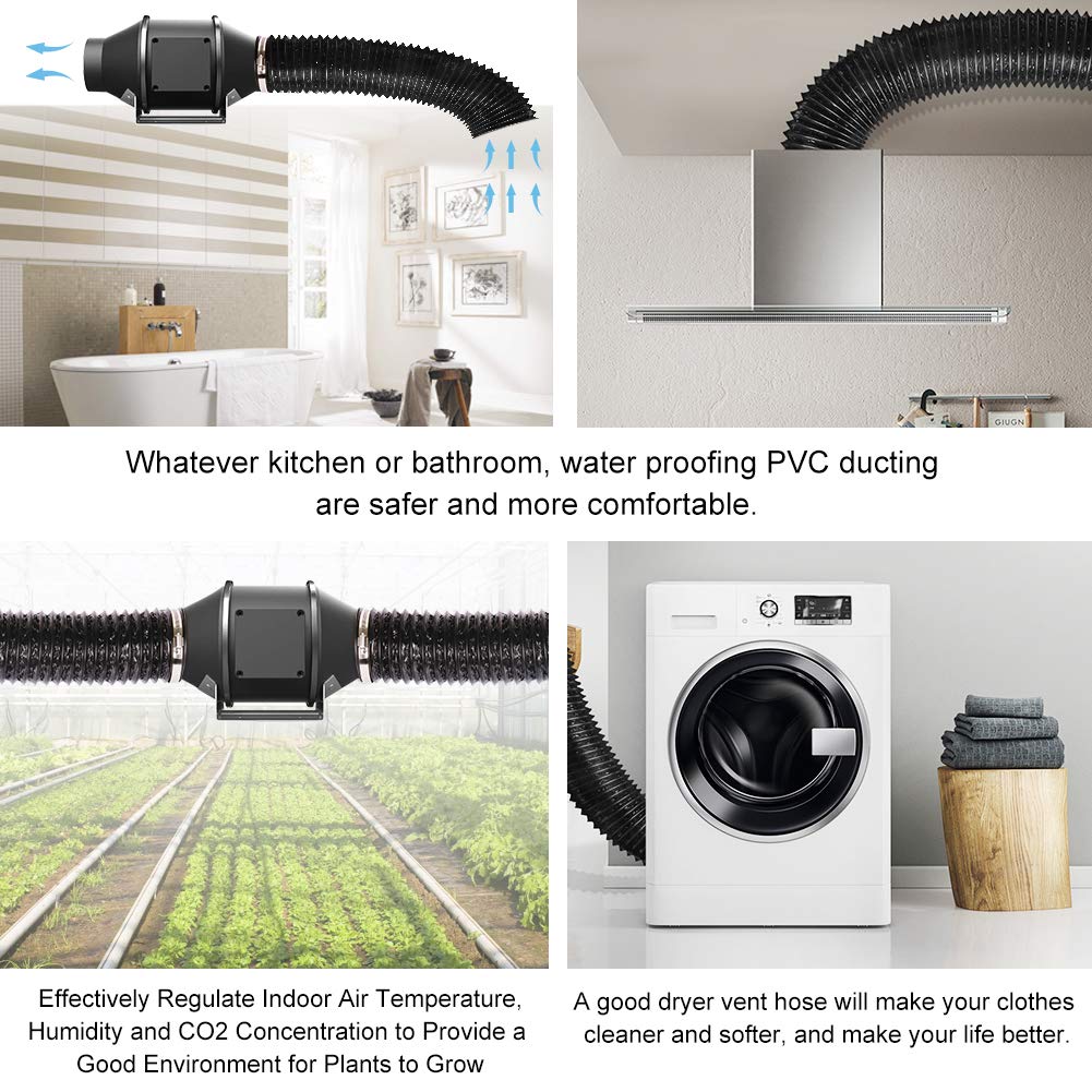 WIDELY USED: The flexible dryer vent hose suits HVAC system. It will move and deliver air in Kitchens (cooking exhaust), Green Houses and Grow Rooms (Air Circulation, Intake, Exhaust and Light Fixture Cooling), Bathrooms (Smell and Moisture Exhaust), Dryer Rooms, Grow Tents and other applications etc.