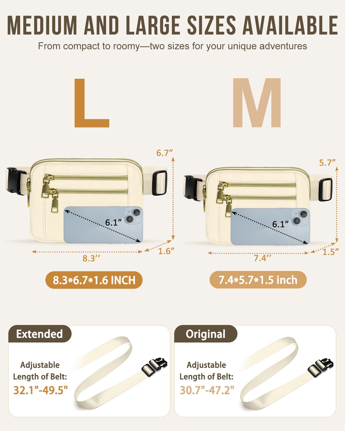 Large Capacity with 4 Zipper Pockets: Our waist packs are available in 2 sizes( L: 8.3*6.7*1.6Inch; M: 7.4*5.7*1.5Inch). Please measure your waist before purchasing. Features 2 roomy compartments and 2 mesh slots, so all your essentials stay neatly organized and easily accessible. Say goodbye to digging through your bag! 2 zippered front pockets are designed to store keys and cards without worrying about the keys scratching your phone