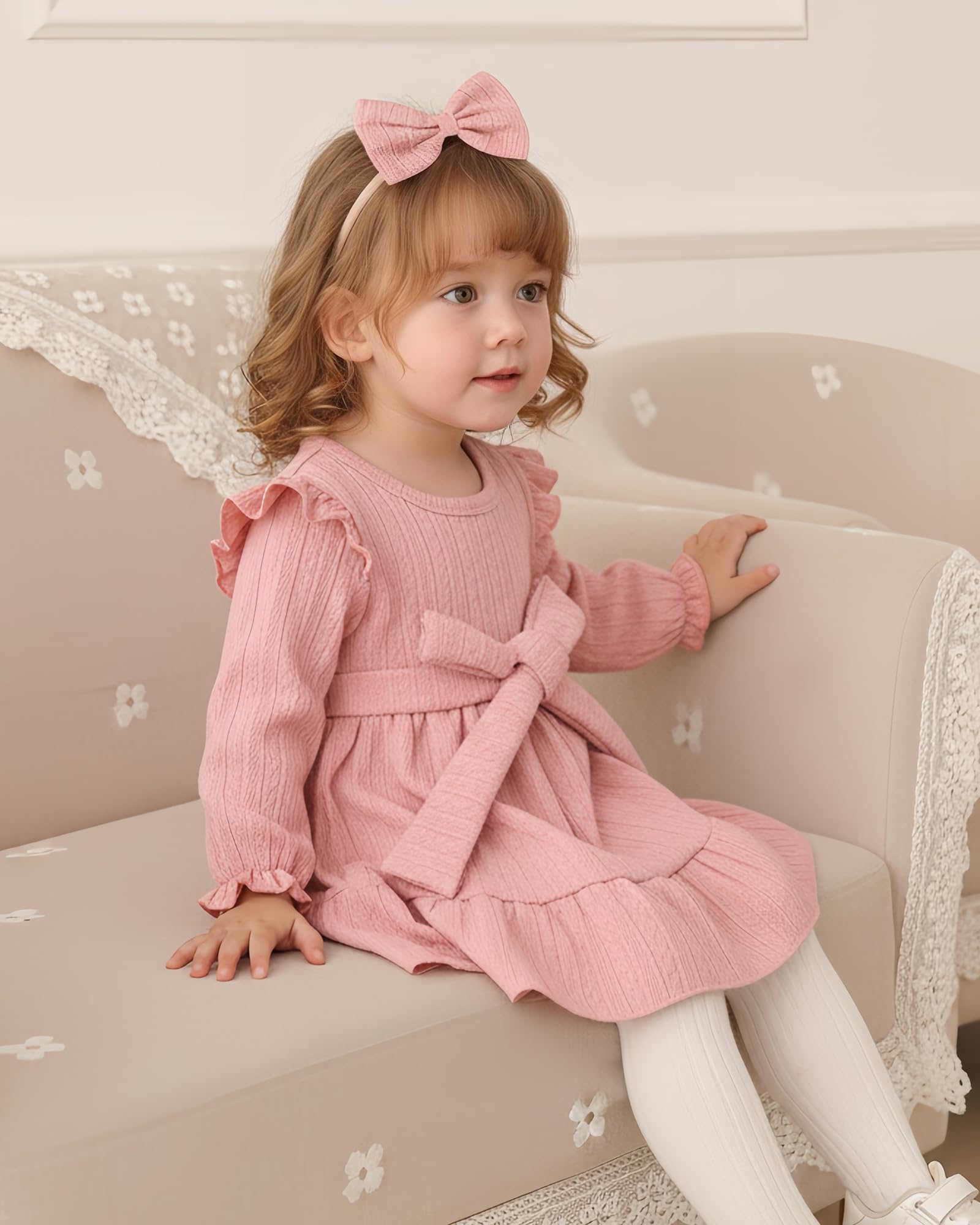 Design: Baby girl dresses design with cute lantern puff sleeves and delicate bowknot decoration cute headband.The baby dress is elastic waist-skimming and matching with belt which will make your baby girl more lovely and fashionable