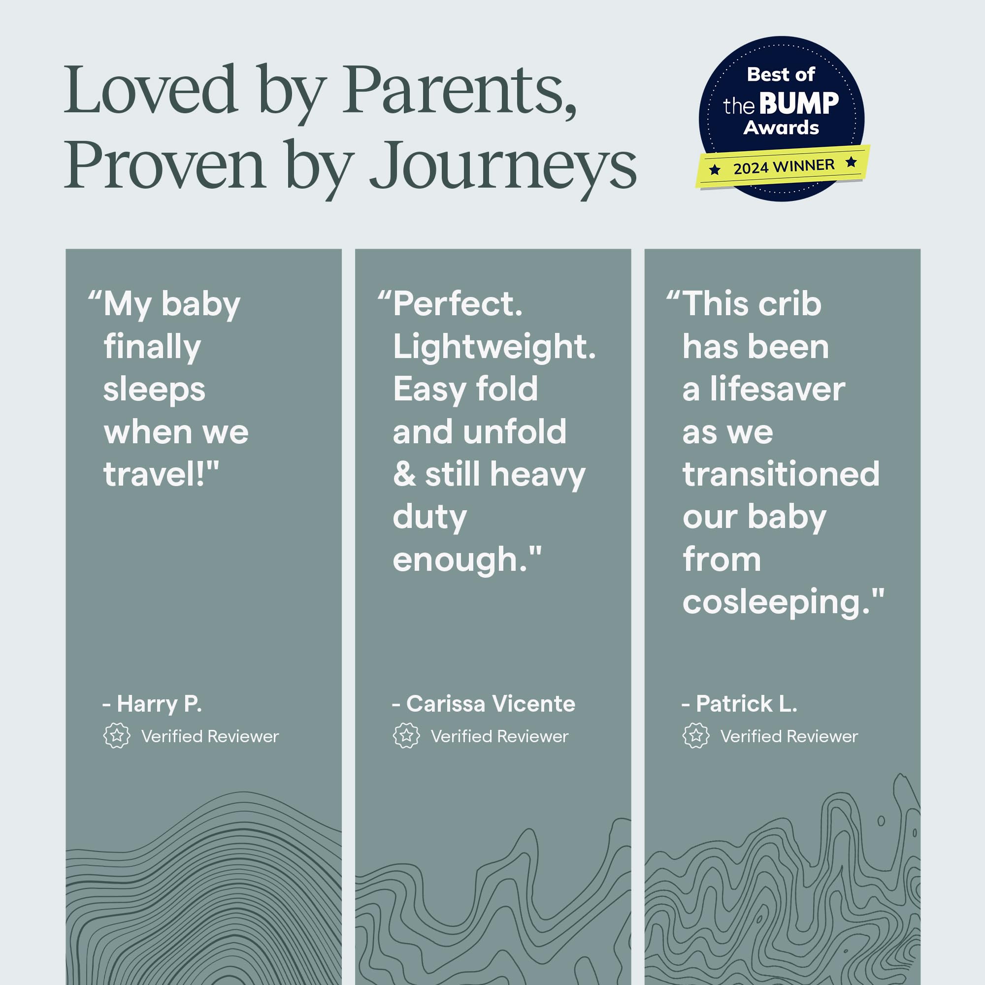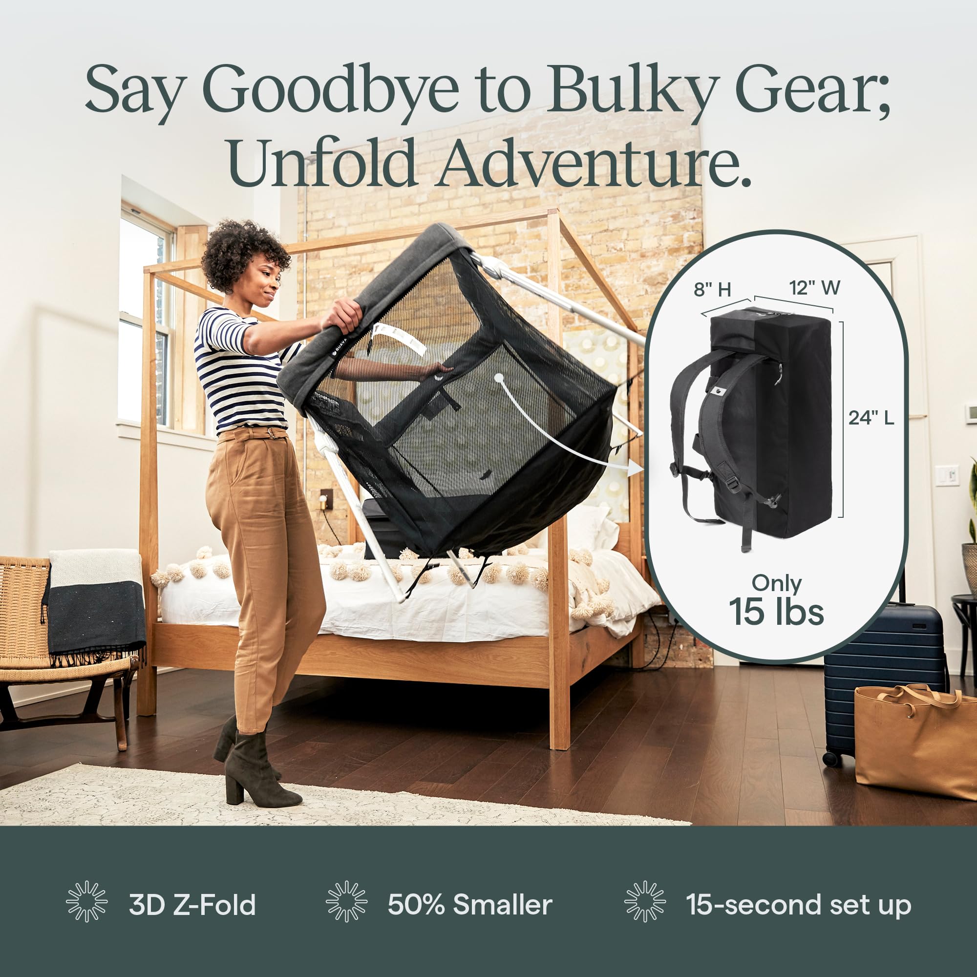 【WORRY-FREE AIRPORT TRAVEL】3D Z-Fold Technology allows it to fold compact enough to carry through airports, making the Lotus Travel Crib a baby travel essential. The durable yet lightweight design weighs only 15 lbs and can be set up in just 15 seconds! The foldable crib’s ability to be carried as a lightweight backpack allows you to travel hands-free with ease.