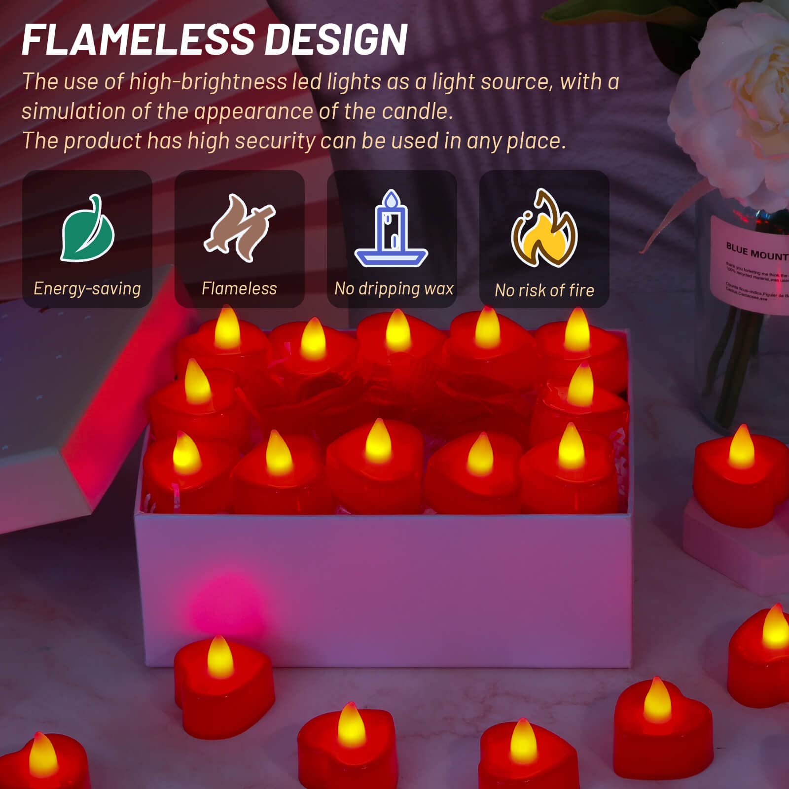 Red LED Candles - These romantic tealight candles are designed in heart shape, they are realistic, beautiful and the ideal substitute to real candle, heart-shaped flameless candles with bright warm light and rose petals will easily create a warm and romantic atmosphere for you