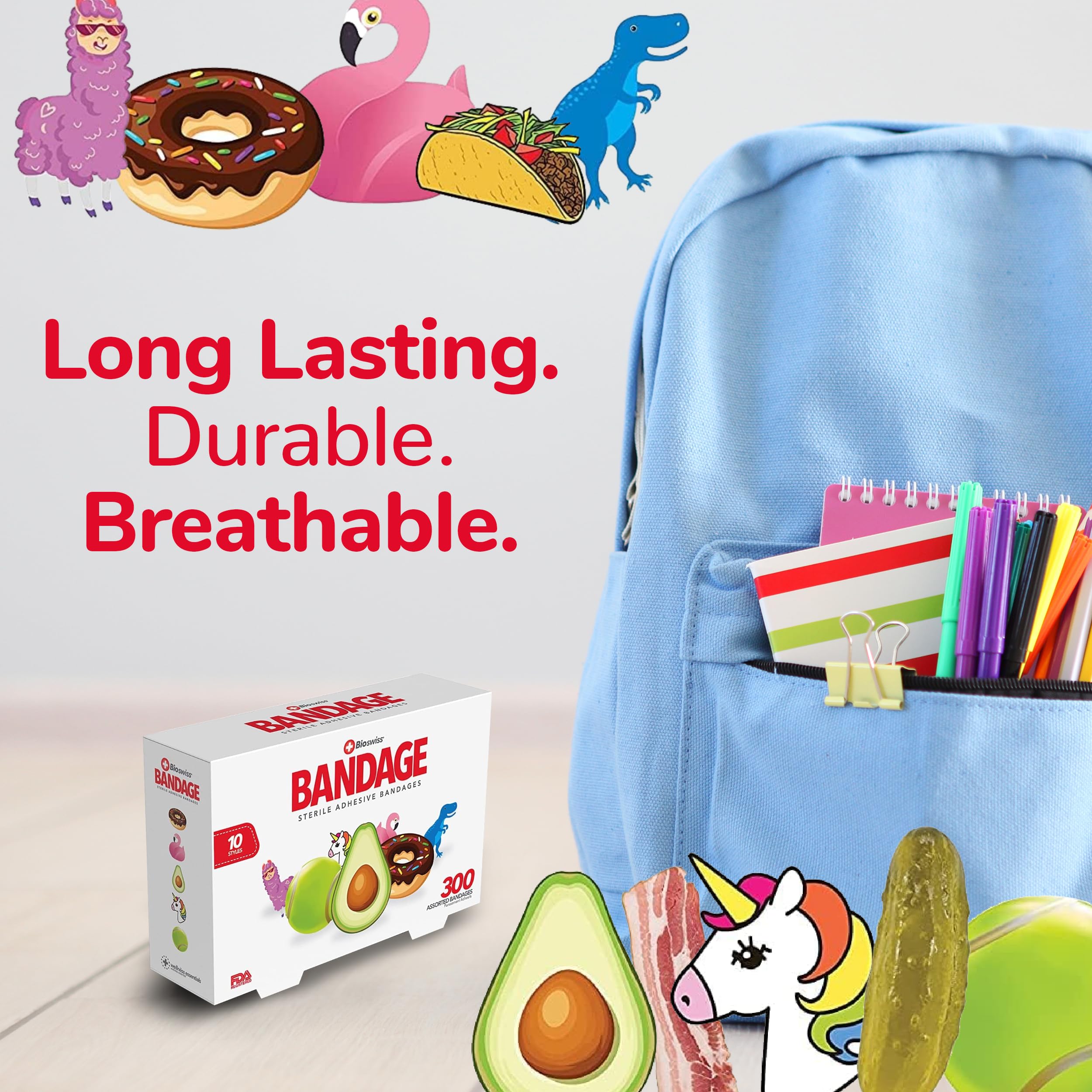 ASSORTED BANDAGES: Our 300 piece adhesive bandages variety pack helps protect cuts, scrapes, and minor wounds while making healing less stressful; bandages come in 10 assorted styles
