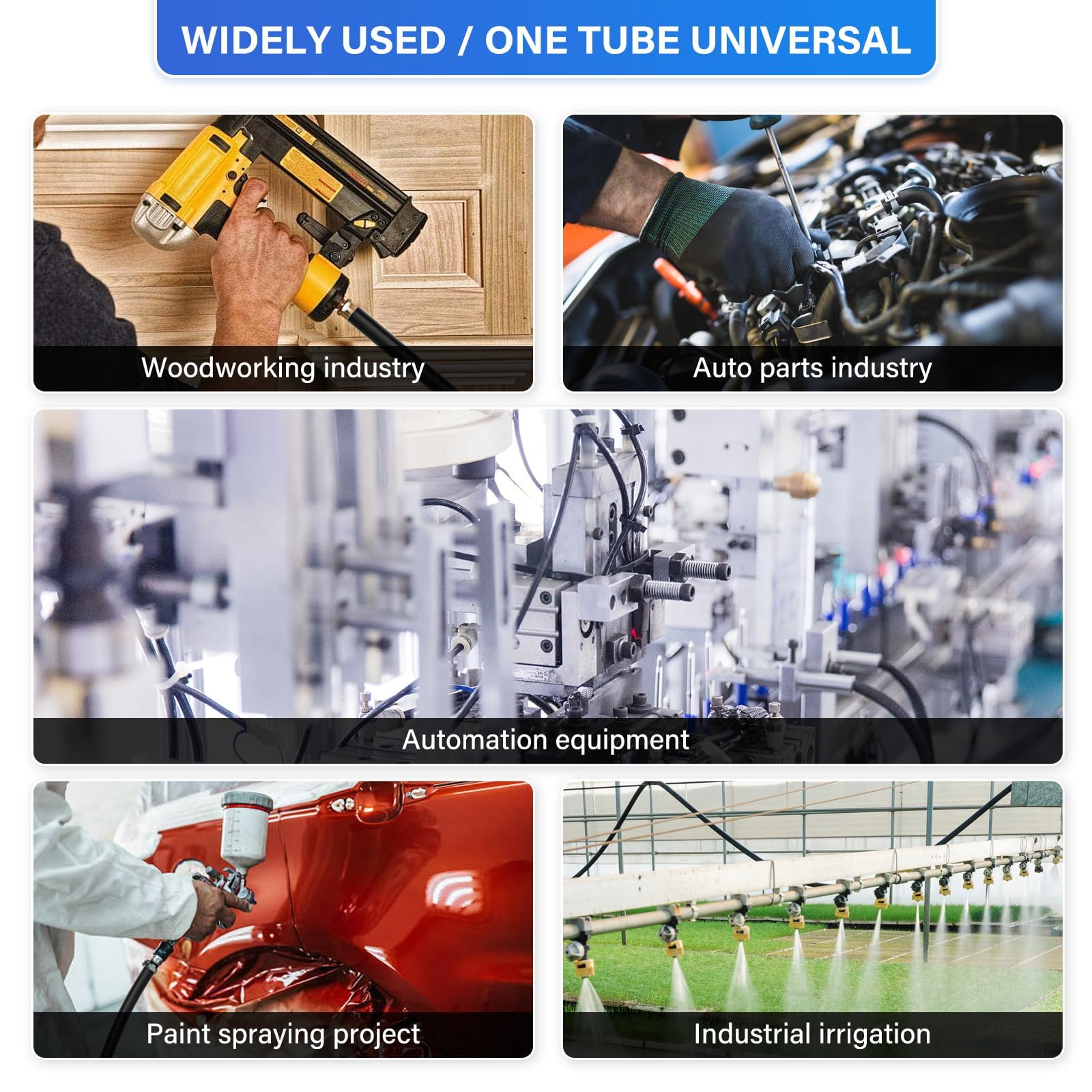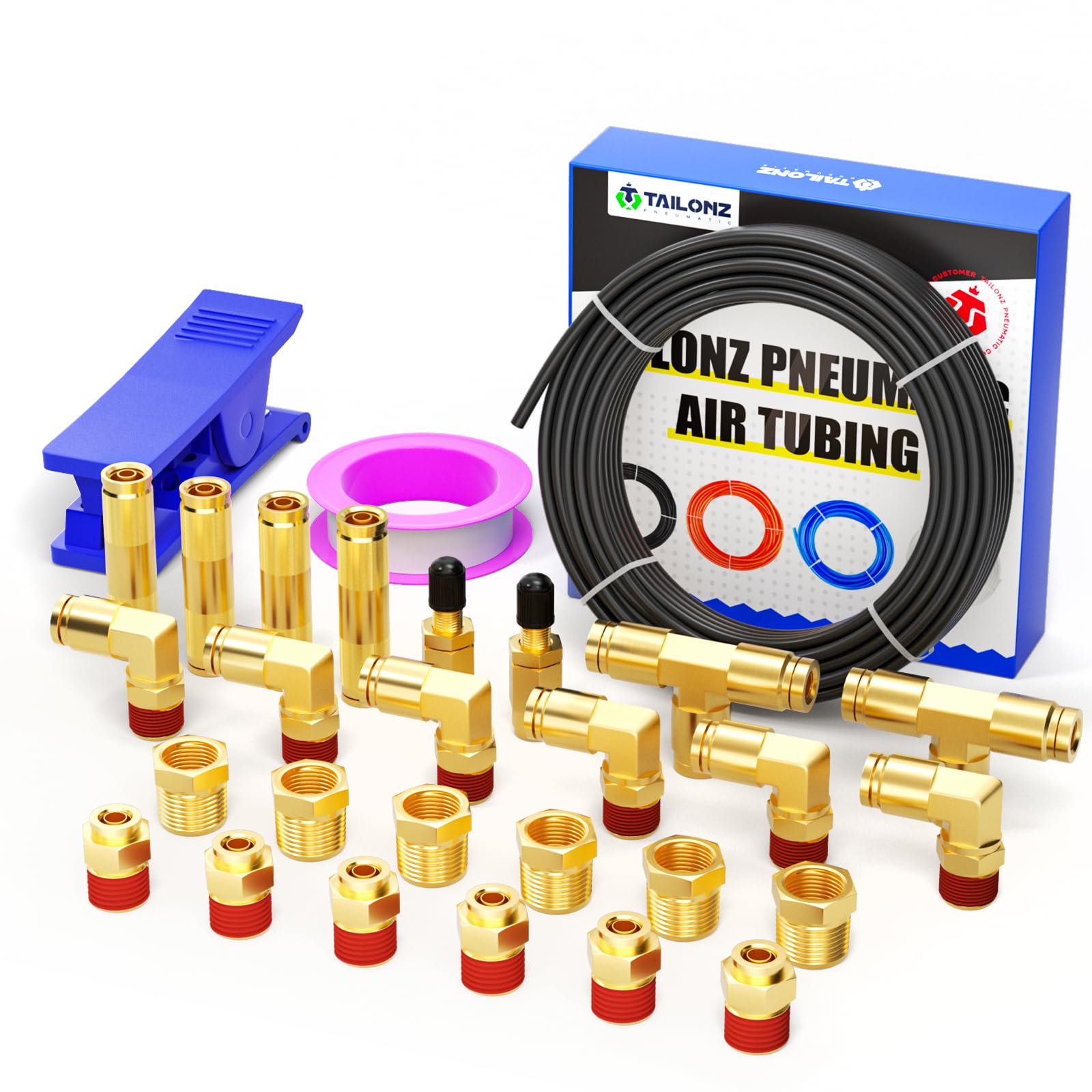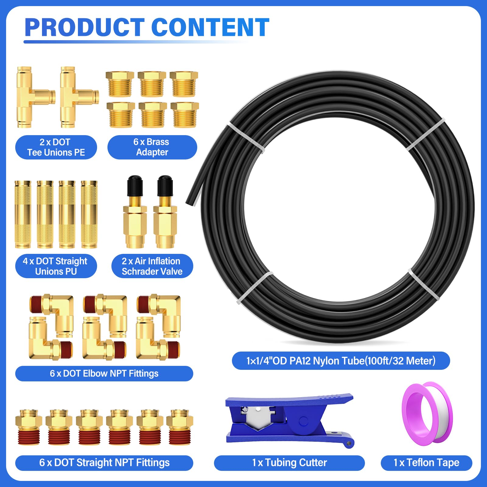 【Package Included】1 ×1/4" Air Tubing, 6 × Straight DOT 1/4" OD x 1/4" NPT Thread, 6 ×Elbow DOT 1/4" OD x 1/4" NPT Thread , 2×1/4" Air Inflation Schrader Valve, 2×1/4"OD DOT Tee, 4 × Straight DOT 1/4" OD, 6×1/2" NPT Male x 1/4" NPT Female Brass Adapter,1× Teflon Tape,1× Tracheal Scissors