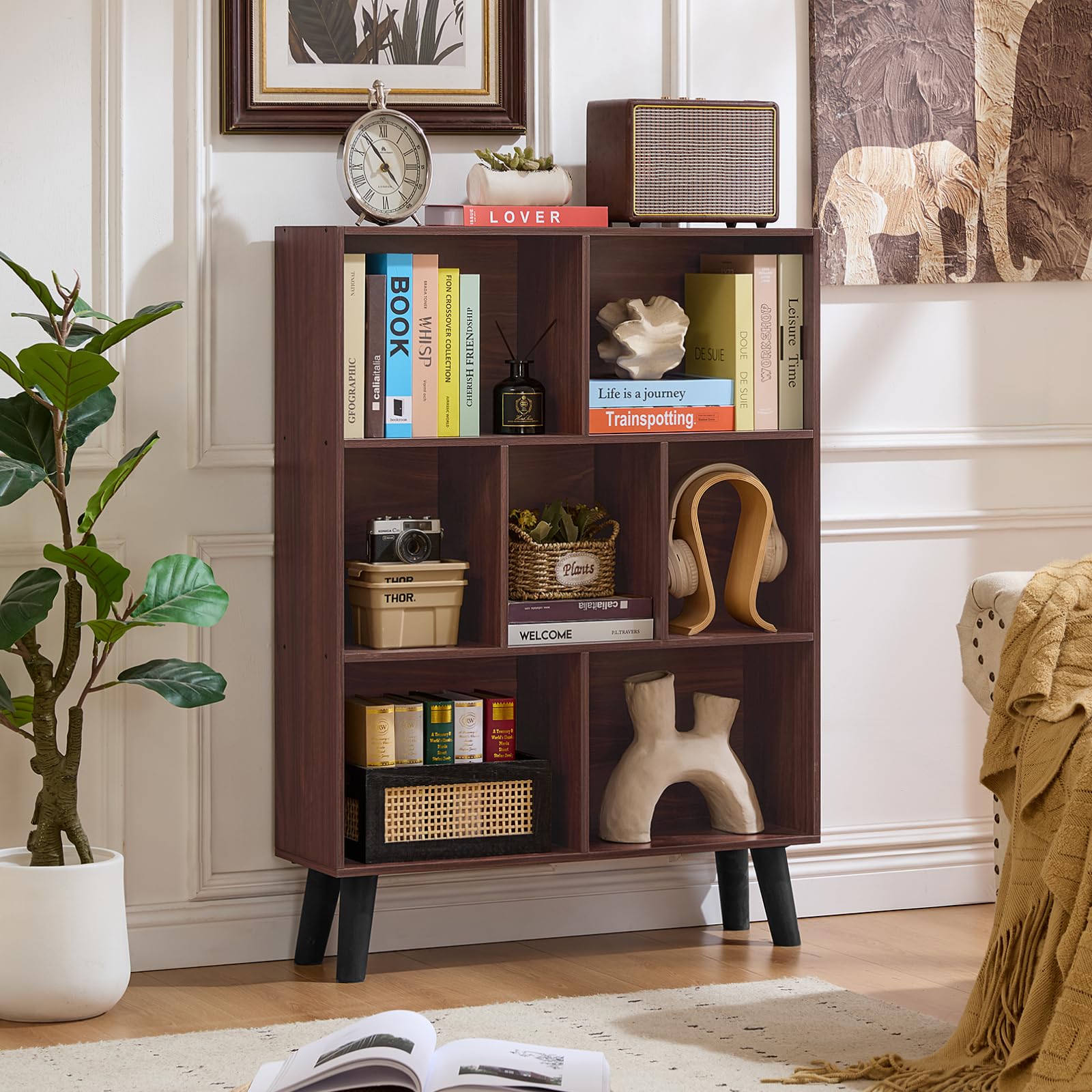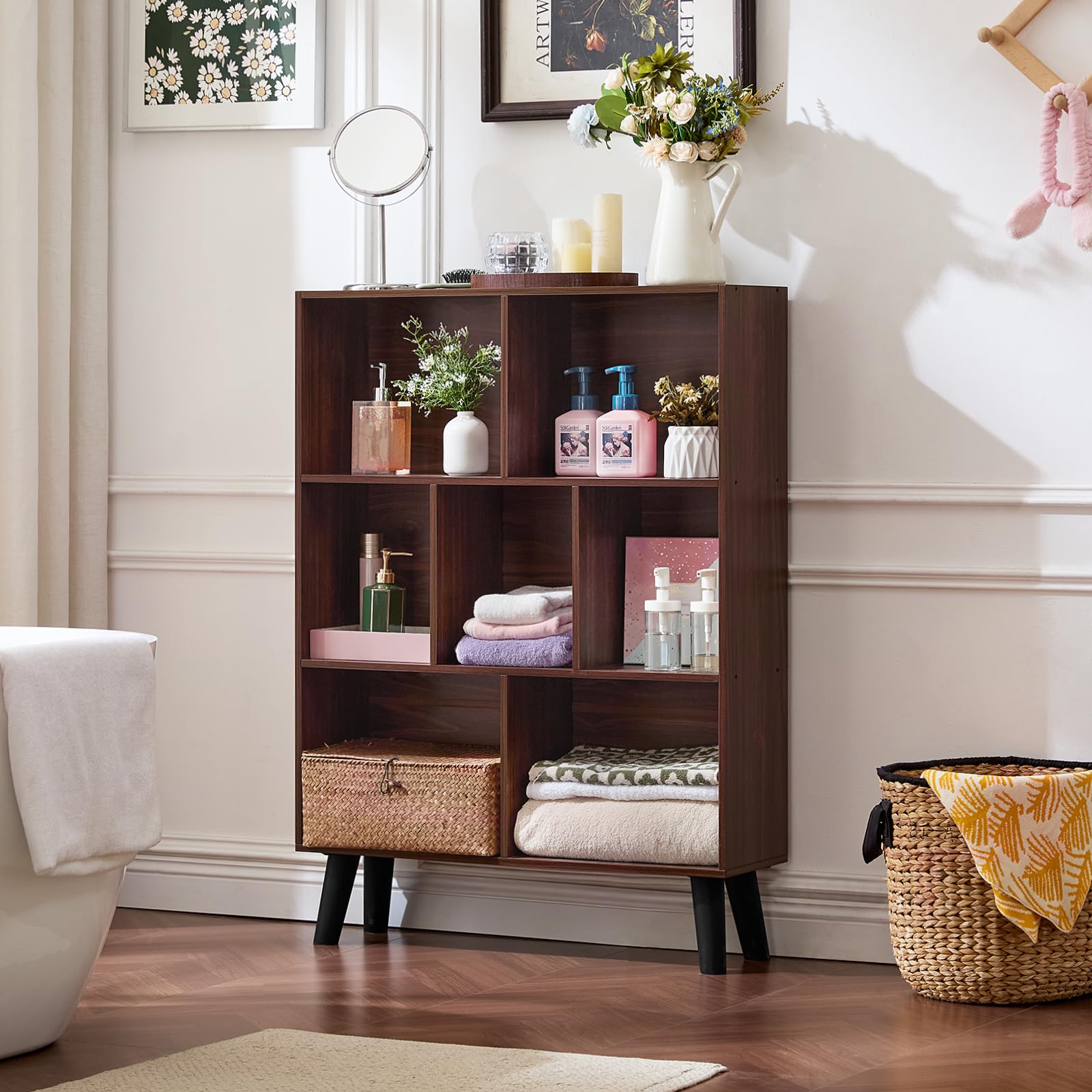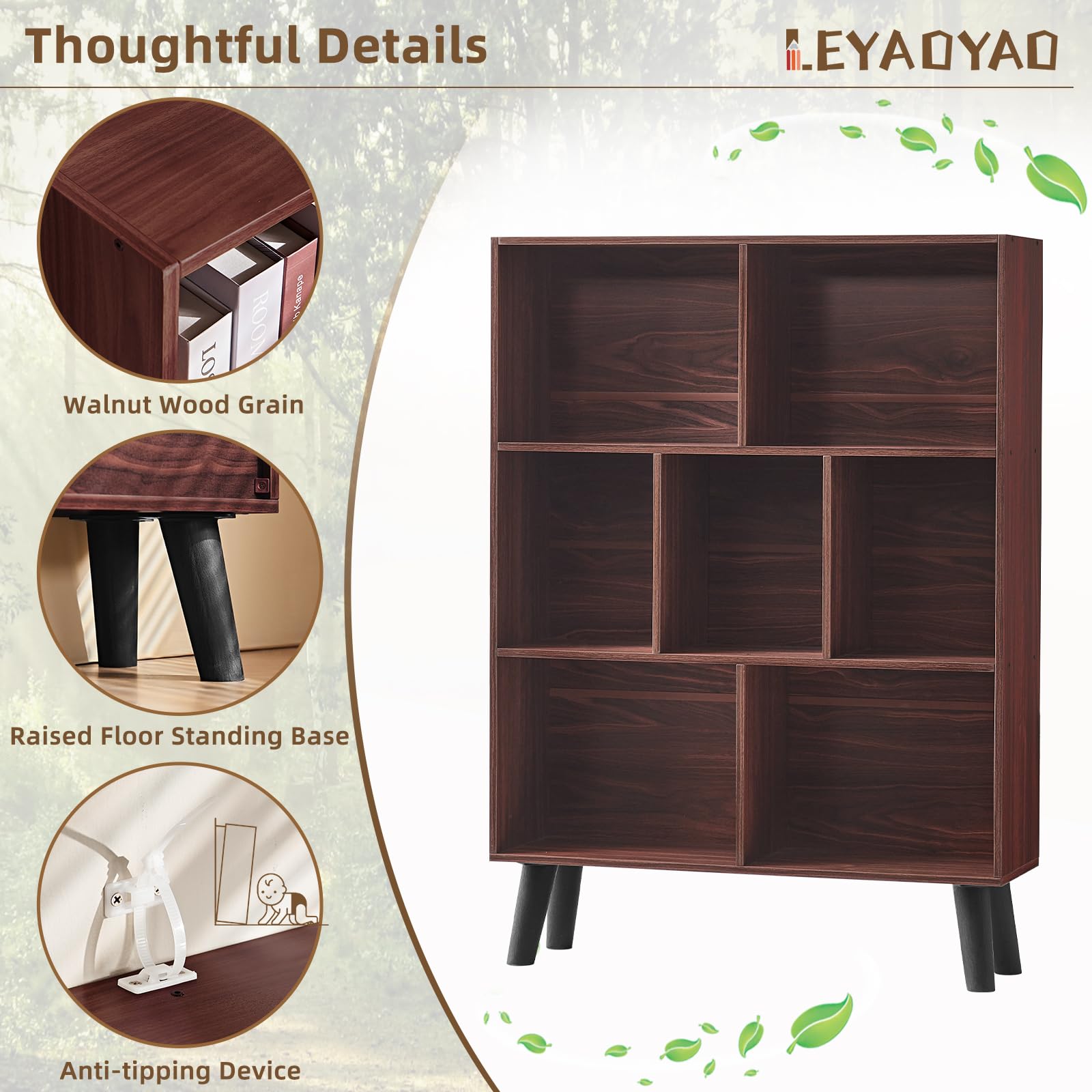 LEYAOYAO 7 Cube Bookshelf 3-Tier Bookcase with Legs, Mint-Walnut Kids Book Shelf Cute Storage Organizer, Toy Shelves Bookshelves,Wood Display Bookcases