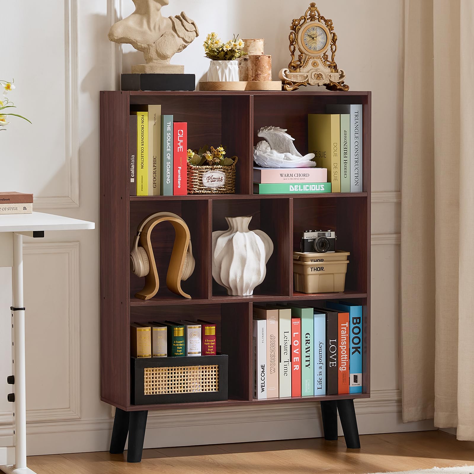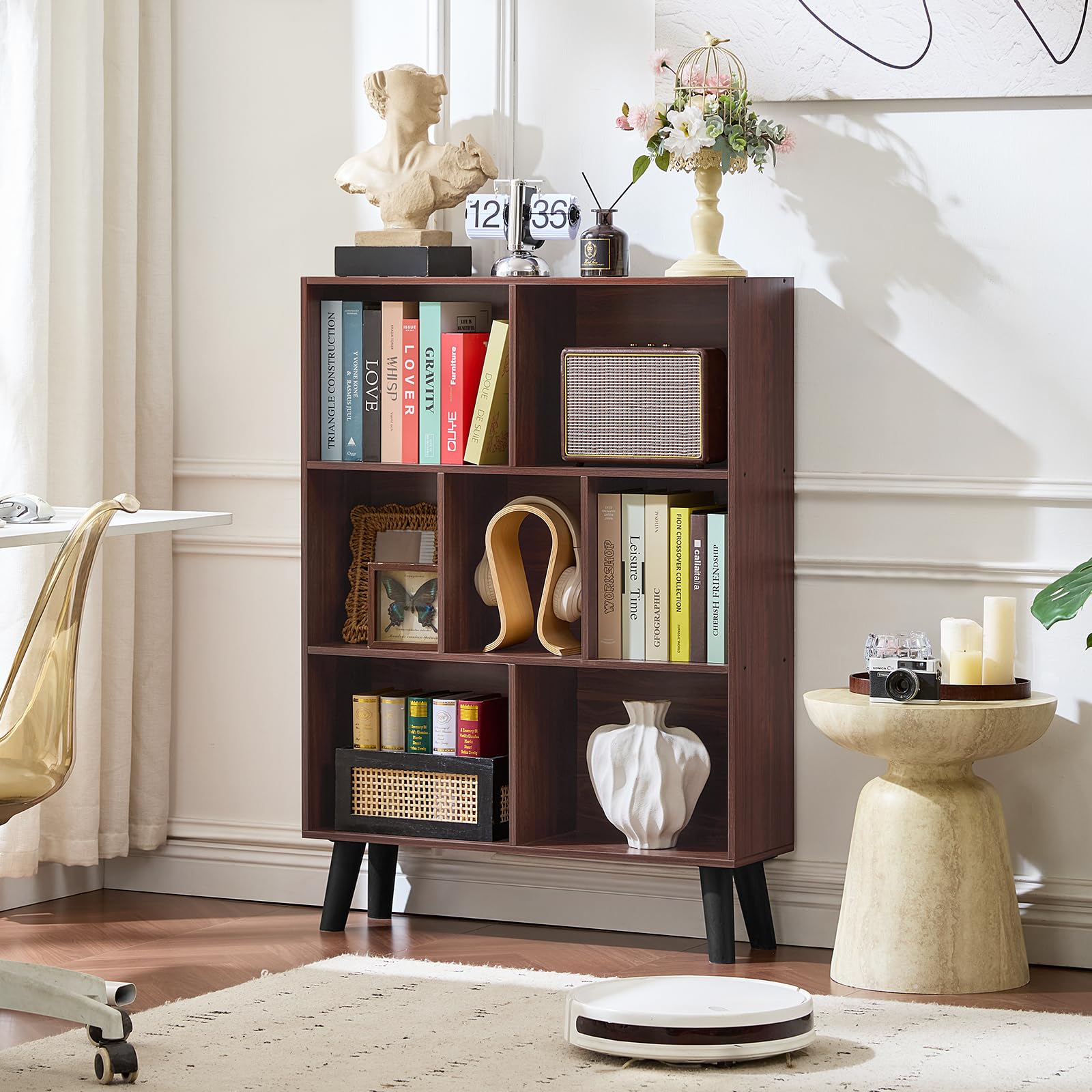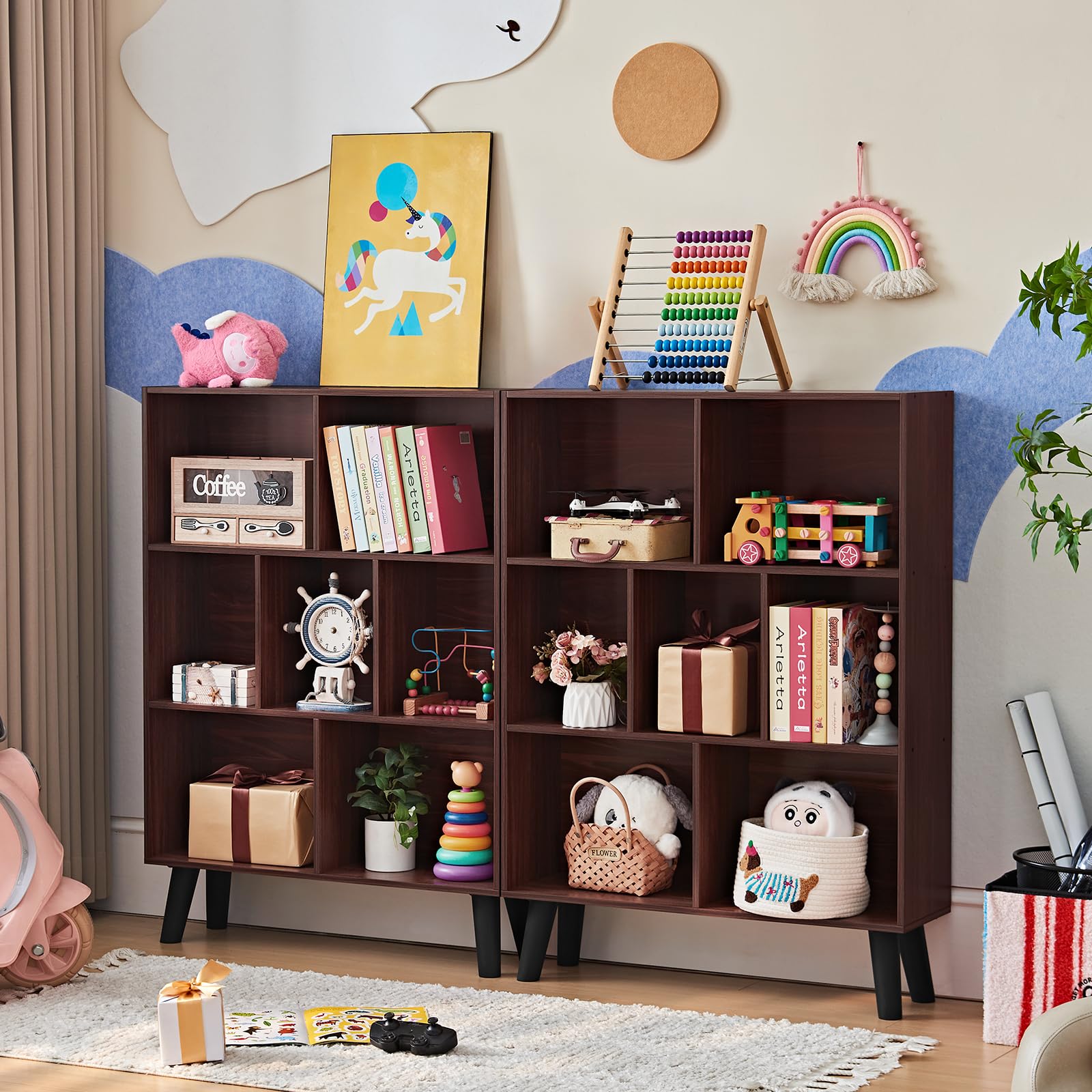 LEYAOYAO 7 Cube Bookshelf 3-Tier Bookcase with Legs, Mint-Walnut Kids Book Shelf Cute Storage Organizer, Toy Shelves Bookshelves,Wood Display Bookcases
