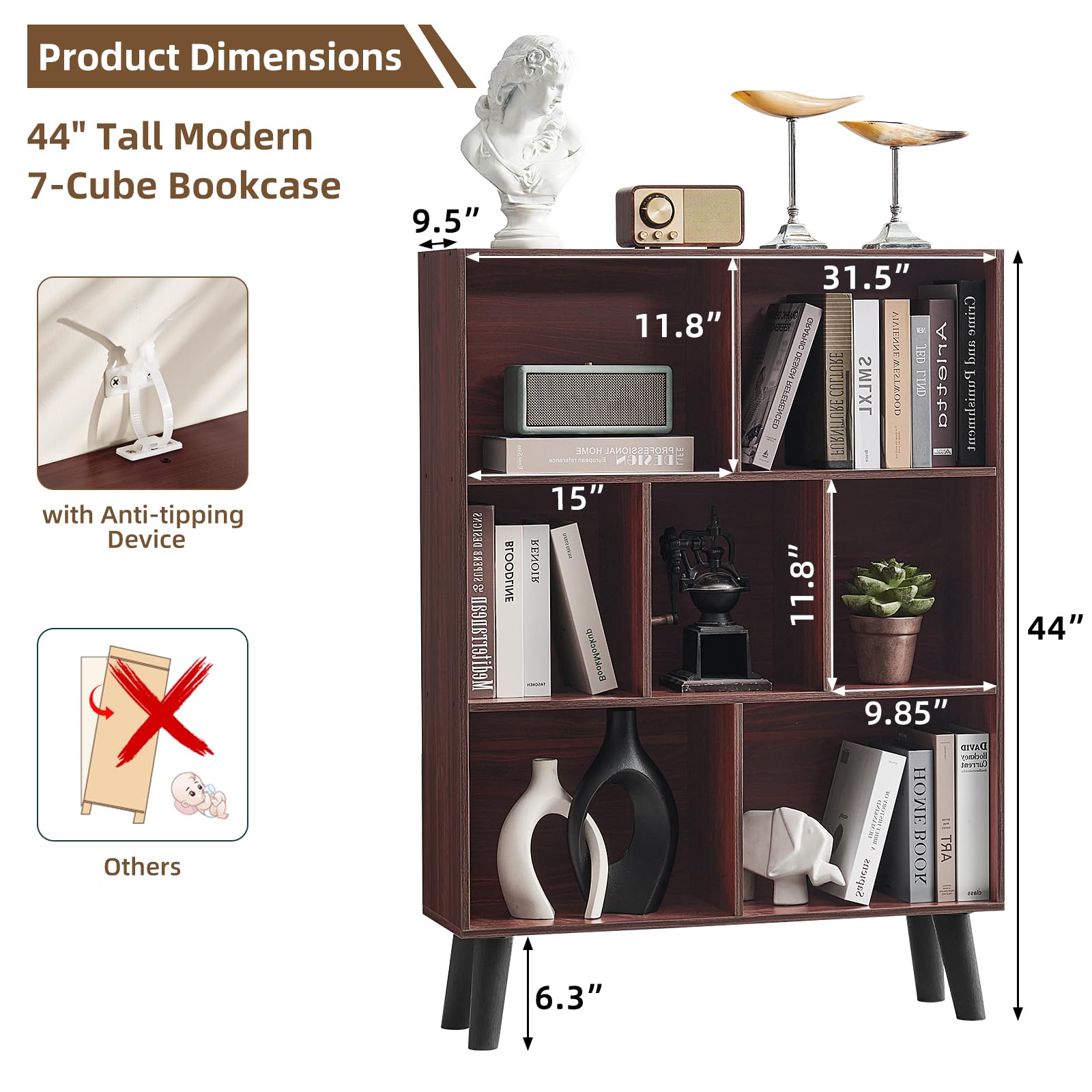 [High Quality Material & Stable Structure] The 3 tier book shelf is made of durable and sturdy wooden boards. The cube design and high quality panels of the 7 cubes book shelf ensure a 35 lbs. weight capacity of each open cube. The sloping legs of the free standing bookshelf is made of moisture-resistant plastic, which is more resistant to corrosion comparing to the wooden legs.The strong sturdy legs of the book case increase the height of the tall bookcase while providing better stability.