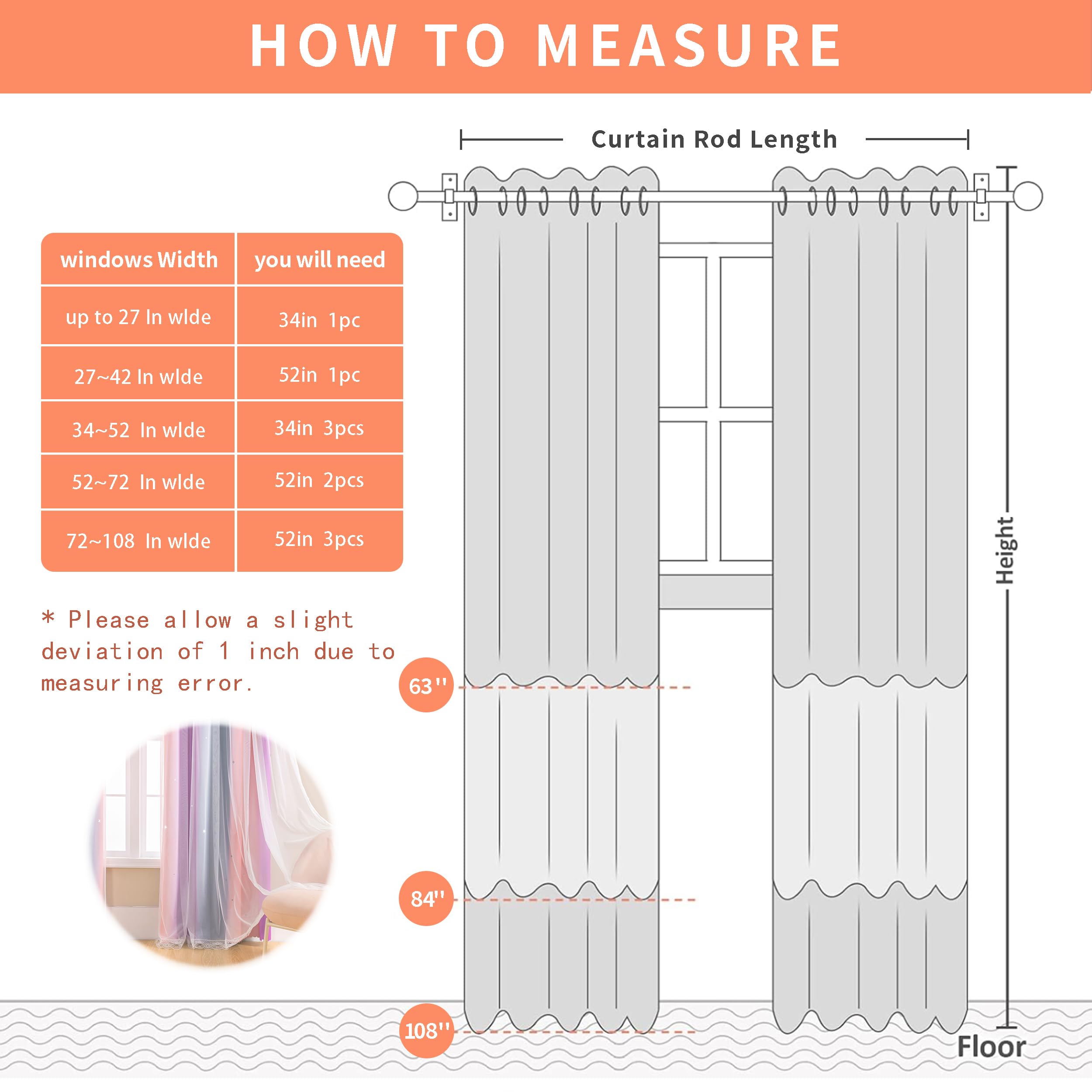 PACKAGE INCLUDES: Each package contains 1 panel accompanied by 1 tie and 3 bows. The panel features a dual-layer design, comprising a sheer curtain and a printed blackout curtain adorned with laser-cut stars. With 8 grommets on top, each panel is designed to effortlessly fit most standard rods.