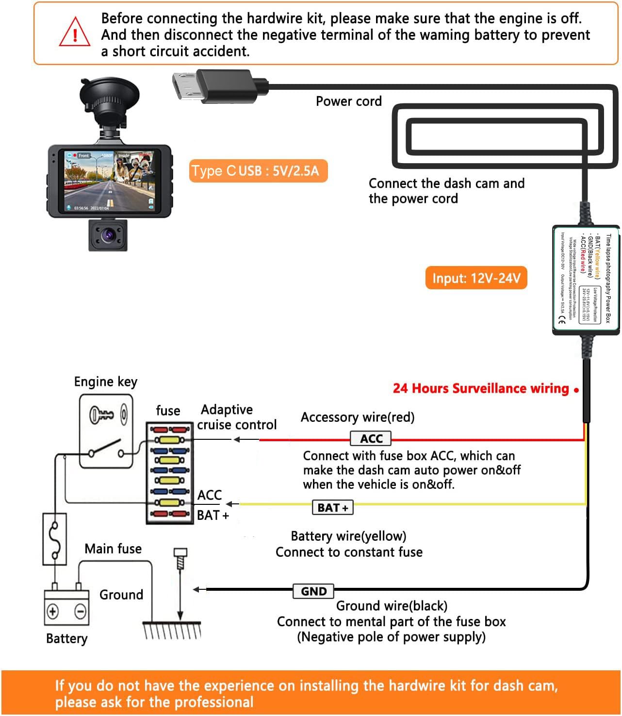 Features The DashCam Hardwire Set ensures seamlessly power conversion from 12V/24V to 5V for USB C devices, offering reliability and safe power supply for easy. Featuring a space saving type c elbow designs, this set is crafted from durability materials that resist wear and tear, ensuring longevity and reducing cable stress. Suitable for driver and gadget enthusiasts, this hardwire set is for those who rely on dashcams or other USB C devices for enhances driving and connectivities. Suitable for diverses environment, this set can be used in car, homes, or offices, providing stable power to dashcams, smartphones, tablets, and more. The vehicle hard-wire set connecting to car battery or fuses box power, can uninterruptedly supply power for dashboards camera for 24 hours; The builts-in safeguards protect your devices against excessive current, overheating; Specifications: Connector: Micro USB Connector Input Voltage: DC 12V-24V Output Voltage: 5V Output Current: 2.5A Working Temperature: -22°F to 167°F (-30°C to 75°C) Cable Length: 11.5ft Low Voltage Protection: 11.6V for 12V vehicle; 23.2V for 24V vehicle. Note: Hard-wire kits, there are 3 wires that need to be connected: A RED wire (BAT+), needs to connect with constant fuse, which can provide power to dash cam even when the vehicle is off. A YELLOW wire (ACC), needs to connect with Fuse Box ACC, which can make the dash cam auto power on&off when the vehicle is on&off. A BLACK wire (GND), needs to connect with metal bolt or screw, which can prevent electric shock.