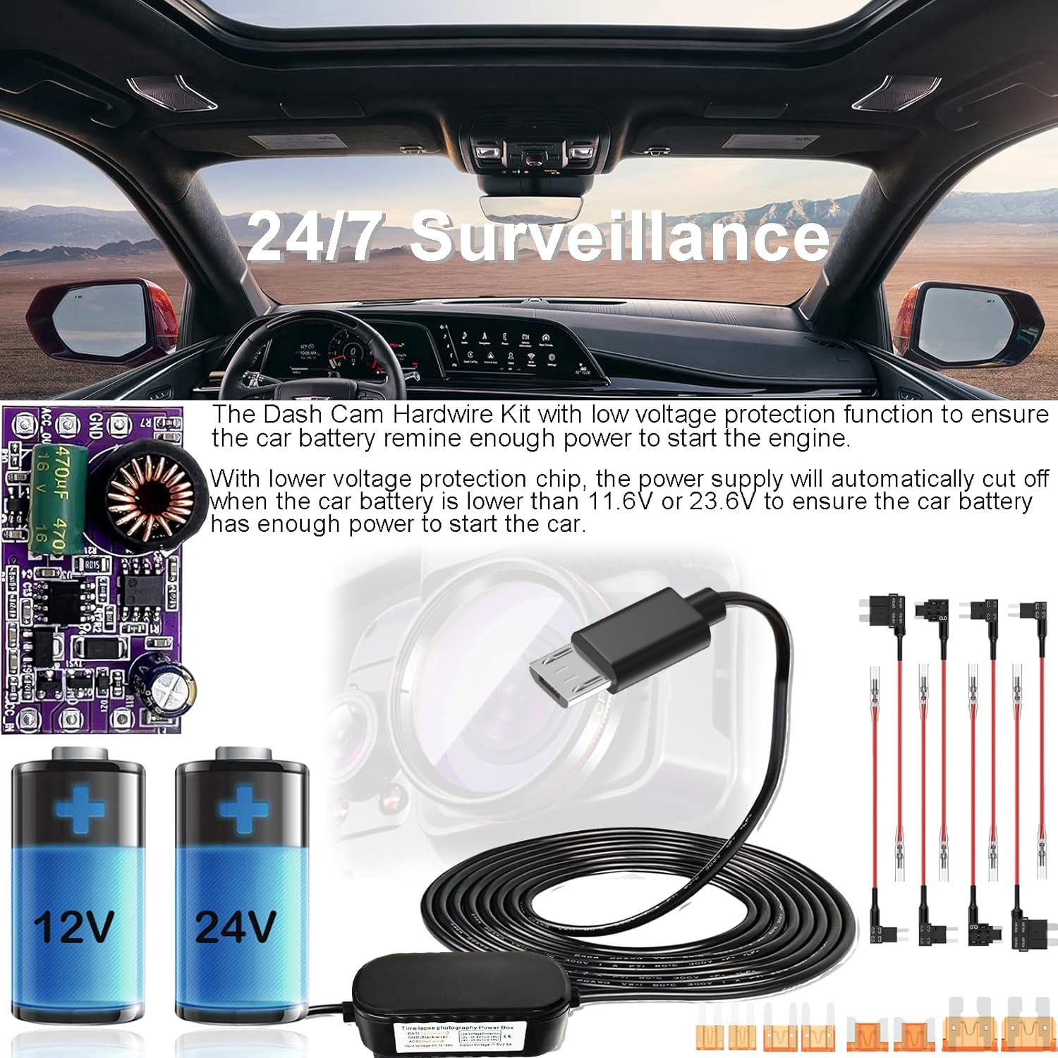 [24/7 Non-Stop Surveillance]: The dashcam hardwire cable can connect to the car fuse box to power the onboard dash cam and keep it 24hrs surveillance; Also the dash cam hard wire kit will cut off the power supply when the car battery drops to 11.6V or 23.5V to prevent the battery drain out