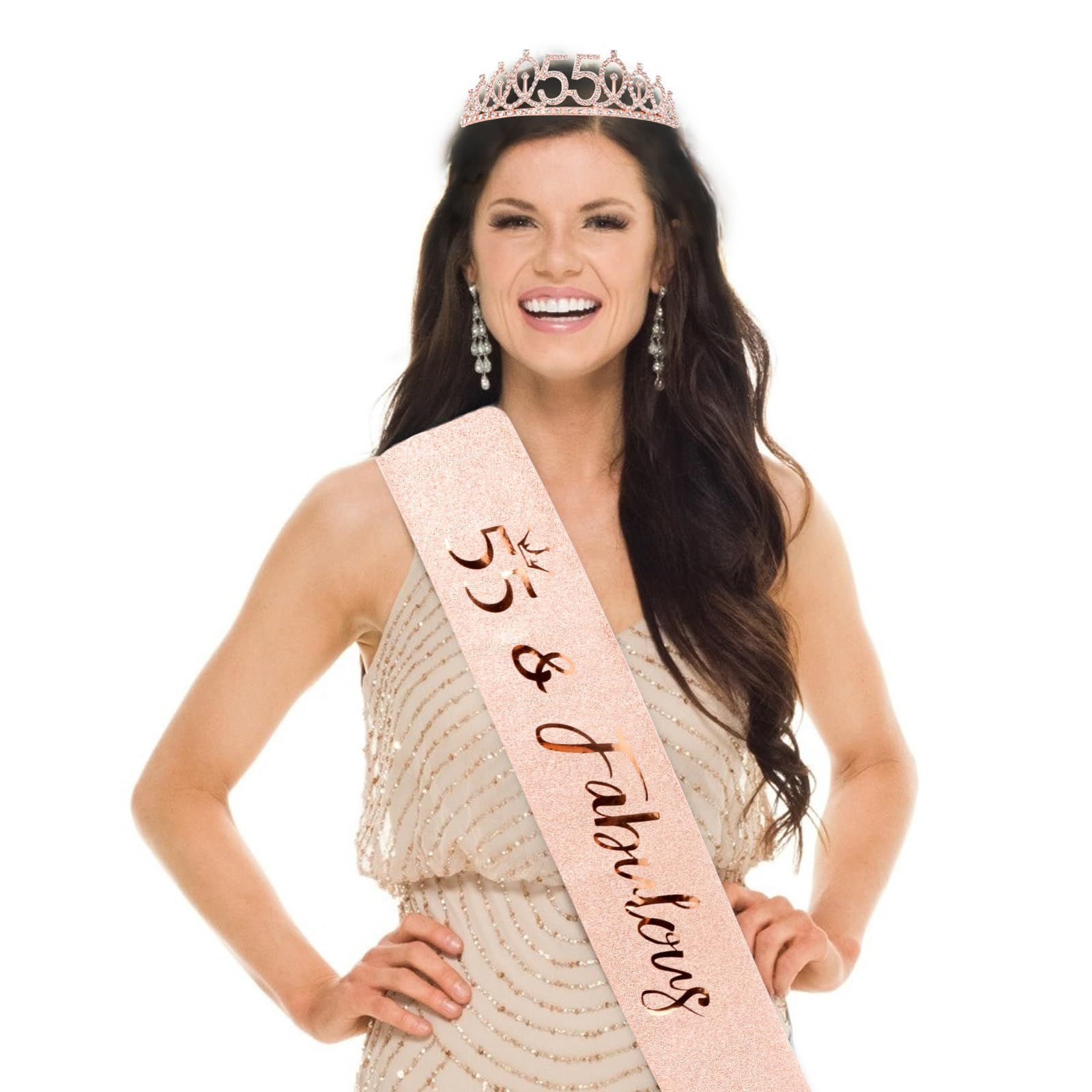The Perfect 55th Birthday Decorations Women: "55 & Fabulous" sash + rhinestone 55 tiara.