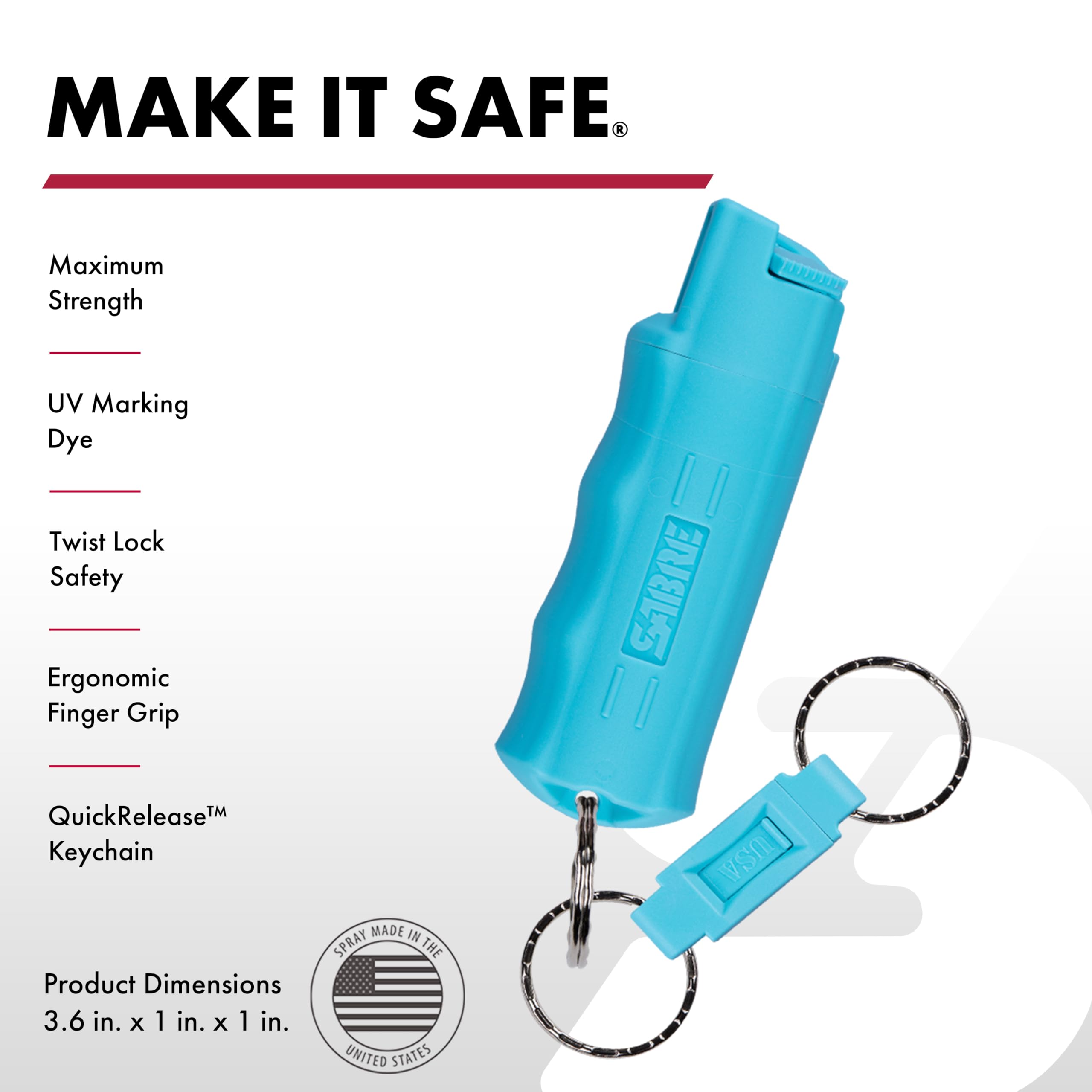 Intuitive, Easy to Use Design for Maximum Protection. Stay safe with our SABRE RED Pepper Spray, the strongest available single ingredient pepper spray. Boasting the same police-strength protection as law enforcement, SABRE RED is the most popular formulation carried by police worldwide and contains UV Marking Dye to help police in suspect identification. The most popular SABRE style, this Pepper Spray Keychain with Quick Release is a small but powerful 0.54 oz container that deploys a ballistic stream to reduce wind blow back. The intuitive grip design allows for better aim and proper hand alignment with touch alone, allowing for faster deployment and helping you to keep your eyes on the threat. This police strength pepper spray provides maximum security in a powerful stream to reduce wind blowback and protect from a distance with a 10-foot (3-meter) range. Feel secure with 3X longer spray time (5x more than other brands) for protection against multiple threats. The Quick Release with detachable key chain allows immediate access to your pepper spray and easy attachment to keychain for maximum portability. Available in a selection of colors. Keep your daughter, wife, son and college students safe with SABRE - THE BRAND THOUSANDS OF POLICE DEPARTMENTS TRUST. Safety You Can Trust. SABRE Pepper Spray is made in USA. SABRE is the #1 brand trusted by consumers worldwide for pepper spray and is a leader in developing safety programs and safety videos to maximize end users’ safety. Empower yourself with extreme stopping power when you need it most.