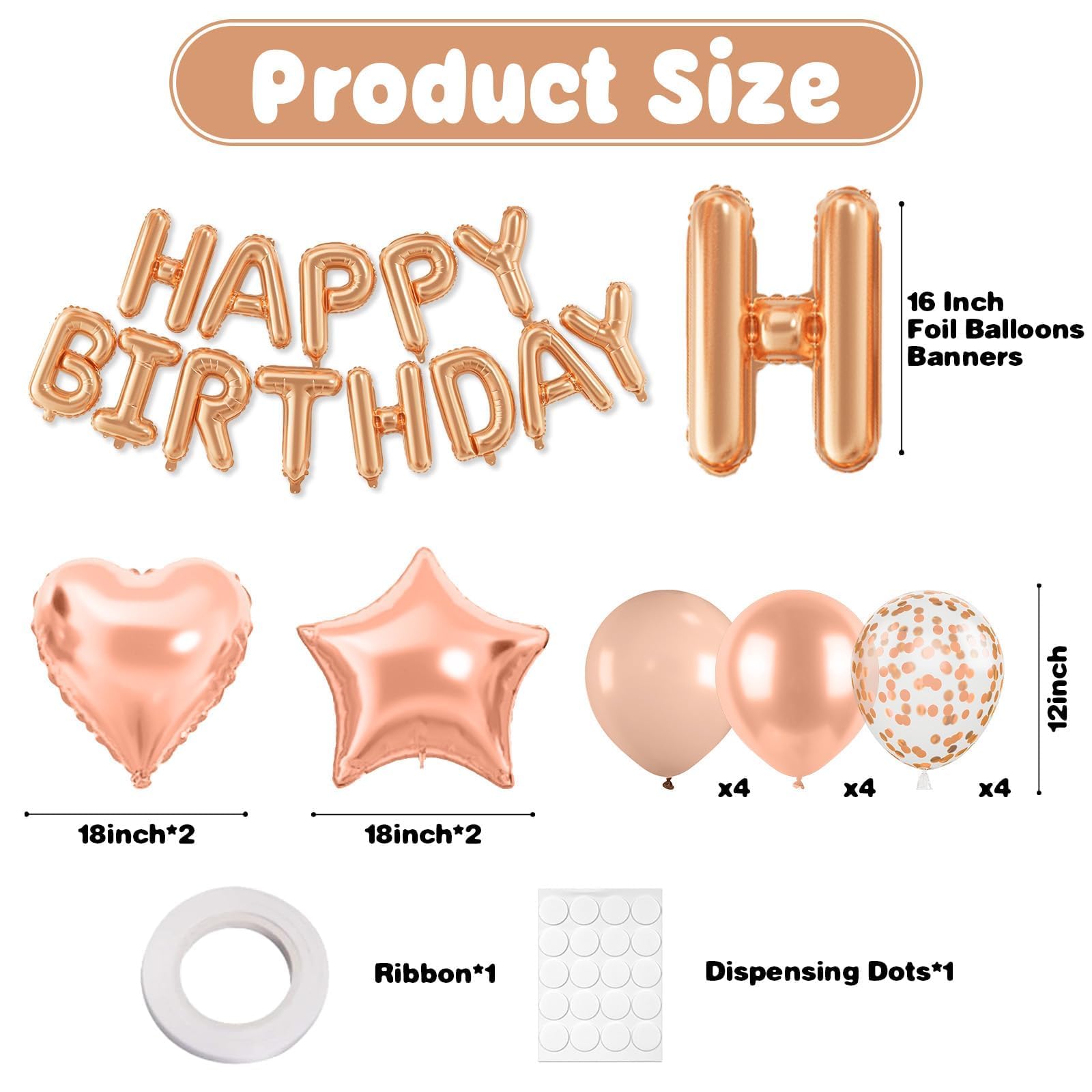 【Package Contains】In Paready Rose Gold HAPPY BIRTHDAY Balloons set, you'll receive: 1 x 16 inches rose gold "HAPPY BIRTHDAY" foil balloon banner, 2 x 18 inches rose gold star foil balloons, 2 x 18 inches rose gold heart foil balloons, 4 x 12 inches pearl rose gold balloons, 4 x 12 inches metallic rose gold balloons, 4 x 12 inches confetti rose gold balloons, 1 roll of 10m white ribbons, 1 balloon dispense, 1 straw for easy inflation.