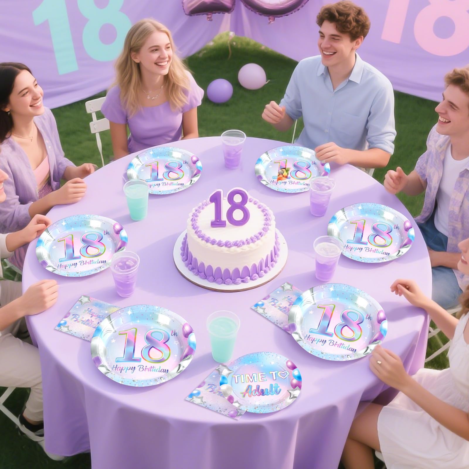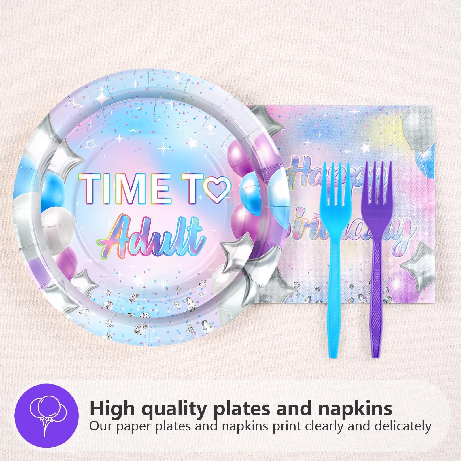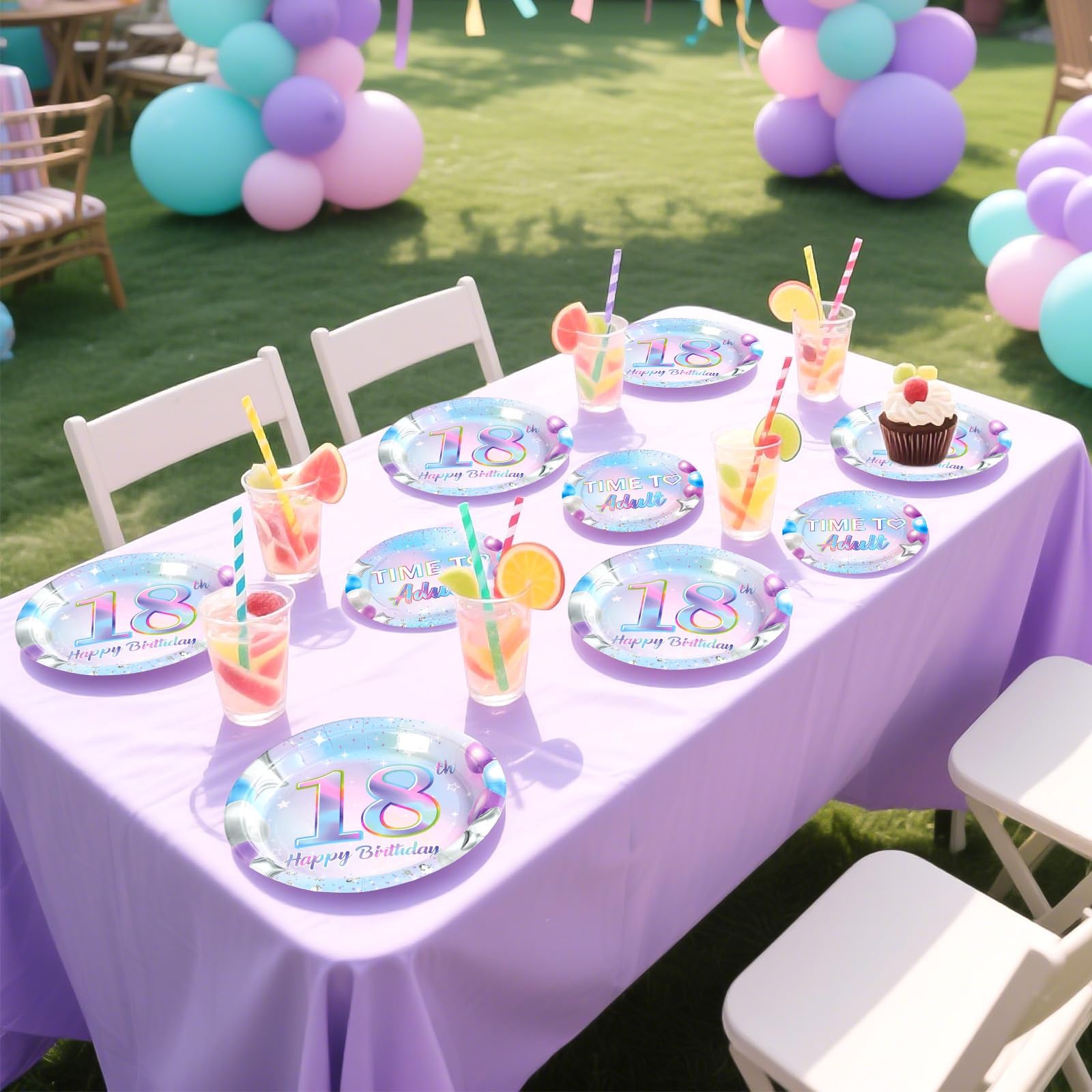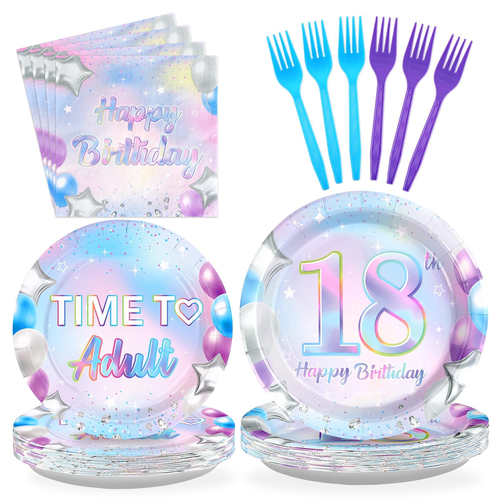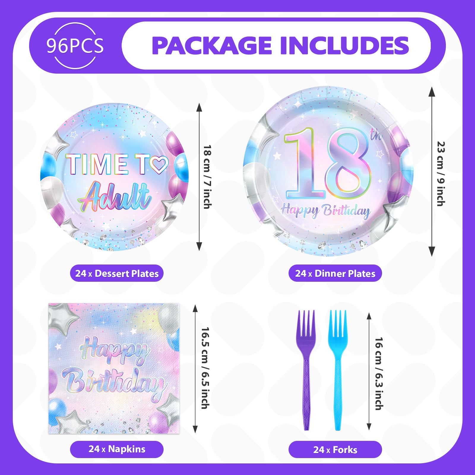 Iridescent 18th Birthday Party Decorations: Our iridescent 18th birthday party tableware set include 24pcs iridescent 18th birthday party plates of 9'', 24pcs iridescent 18th birthday plates of 7'', 24pcs napkins of 6.5'' and 24 plastic forks. Good for celebrating girls and boys 18th birthdays