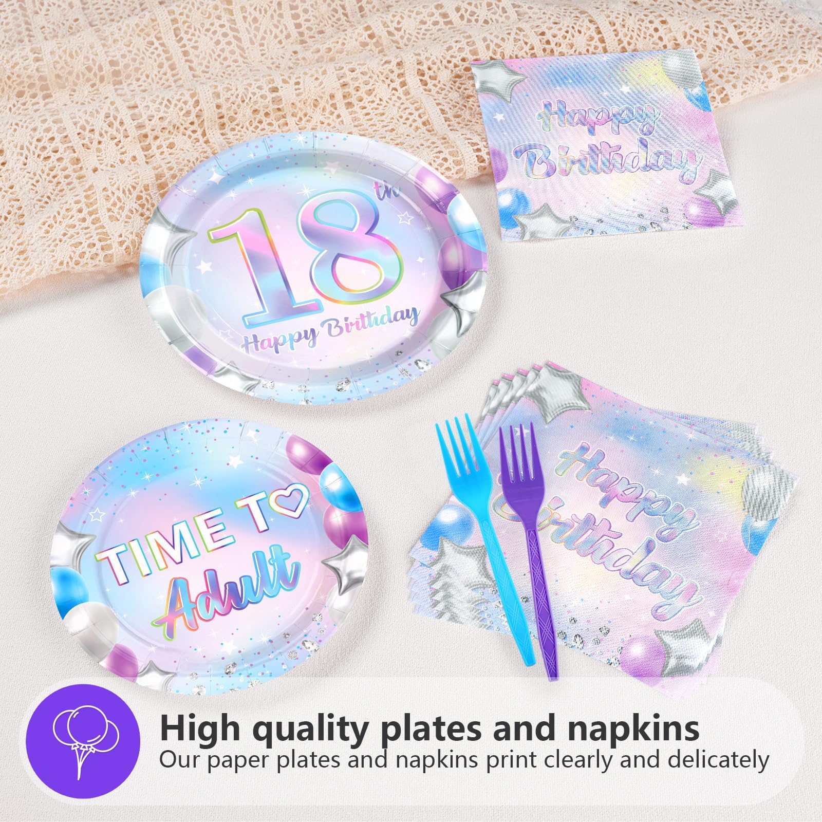 Grencian 96Pcs 18th Birthday Decorations Iridescent 18th Birthday Party Plates Disposable Happy 18 Bir-thday Paper Tableware Set for Teen Girls 18 Years Old Party Supplies Serves 24